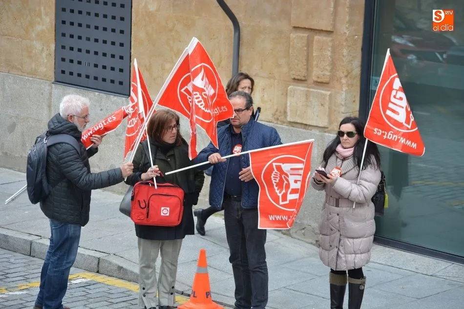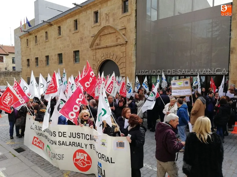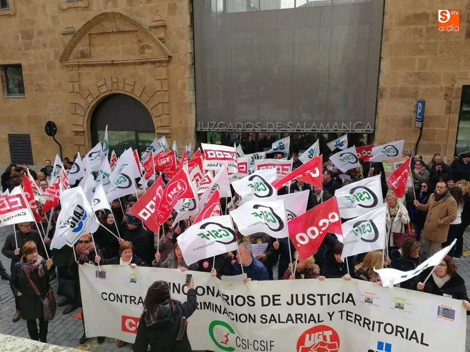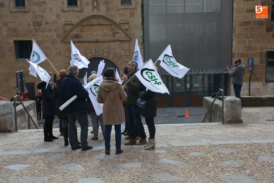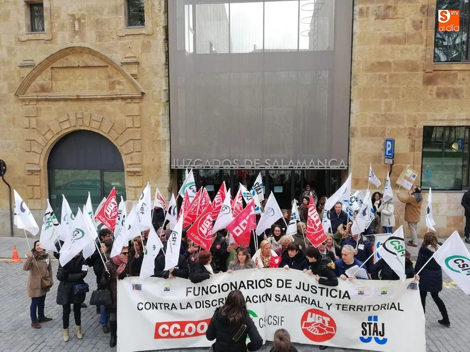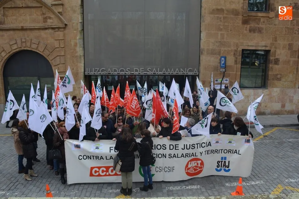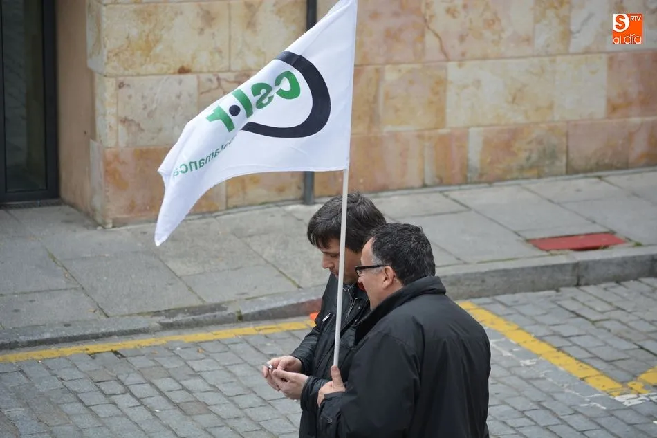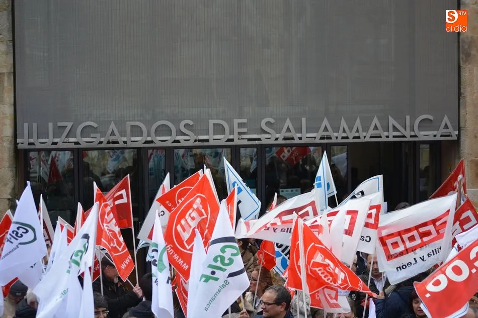 Este jueves, 12 de abril, varios sindicatos se han concentrado en las puertas de los Juzgados de la Plaza Colón de Salamanca. El encuentro ha comenzado a las 12:00 horas con las declaraciones de los representantes de cada sindicato que piden unas retribuciones y condiciones de trabajo dignas.