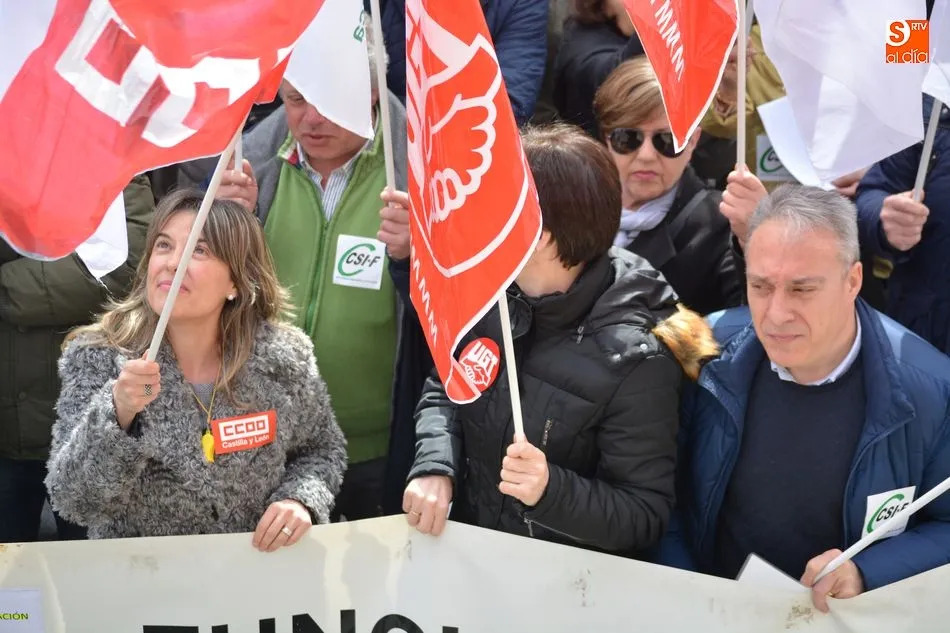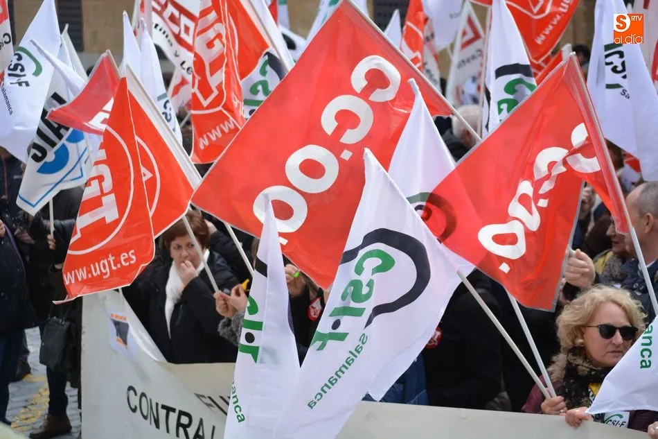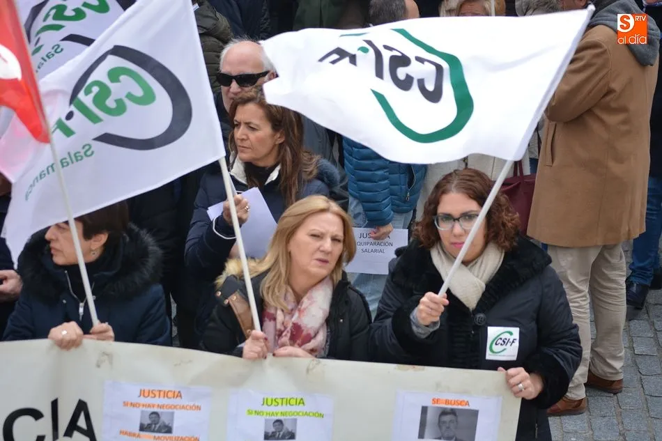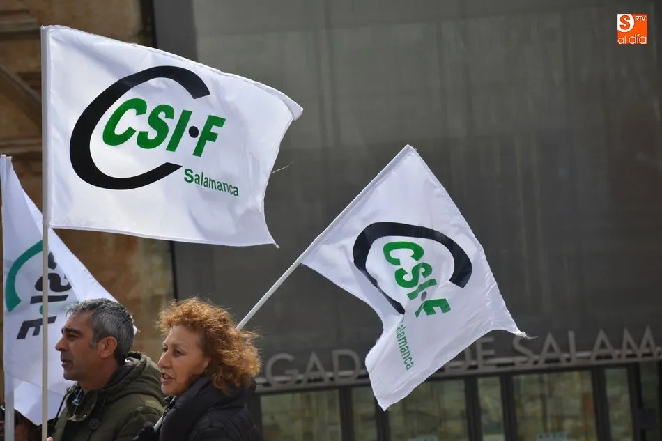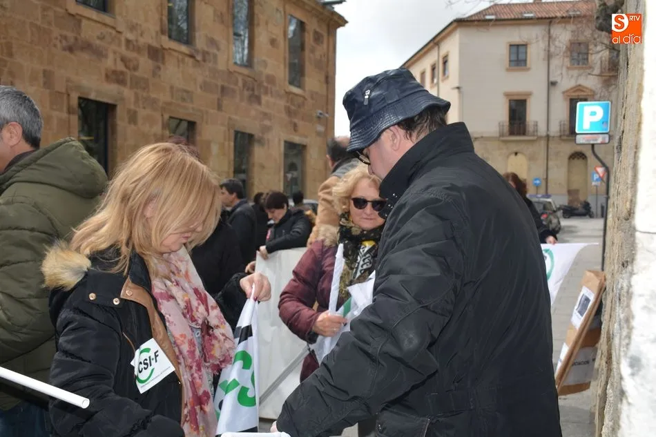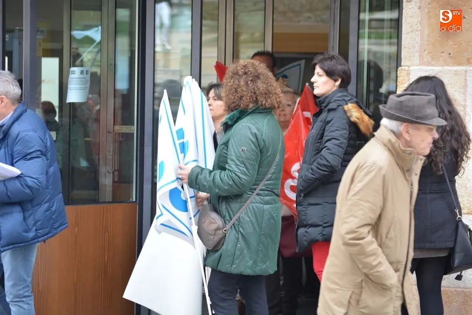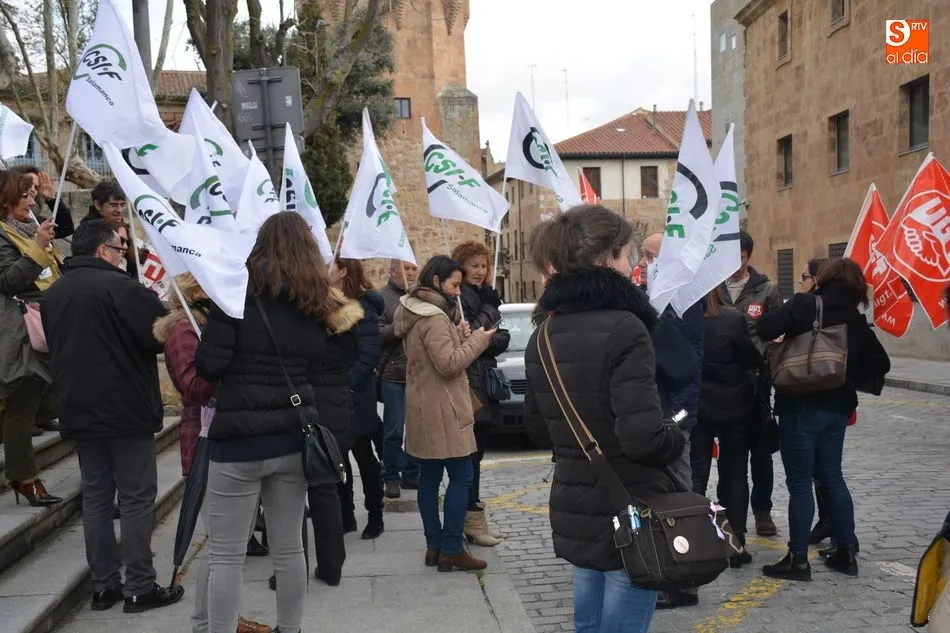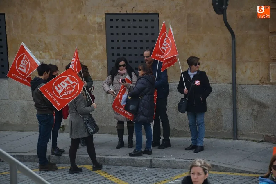 Este jueves, 12 de abril, varios sindicatos se han concentrado en las puertas de los Juzgados de la Plaza Colón de Salamanca. El encuentro ha comenzado a las 12:00 horas con las declaraciones de los representantes de cada sindicato que piden unas retribuciones y condiciones de trabajo dignas.