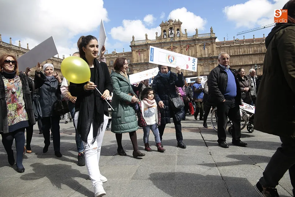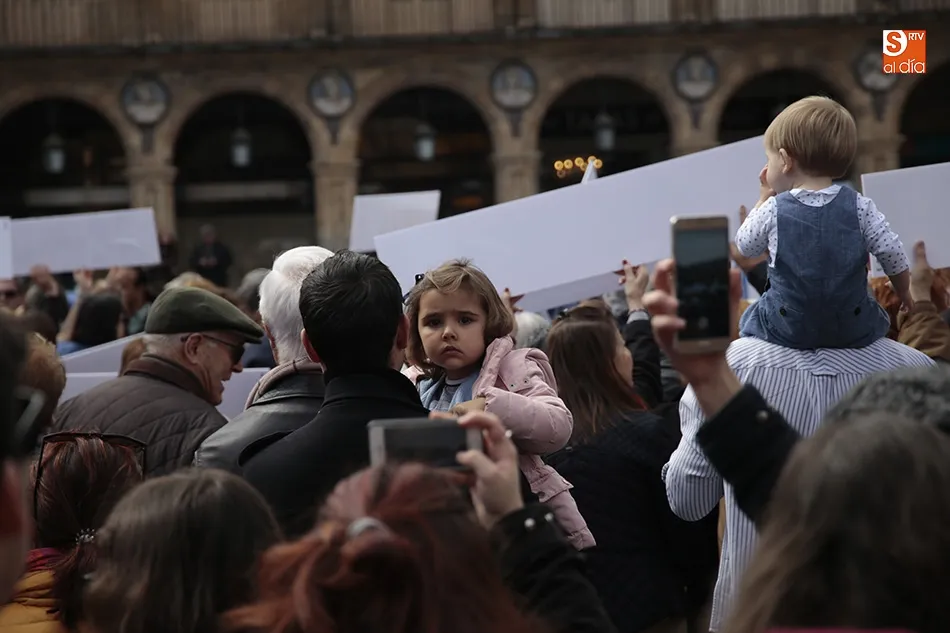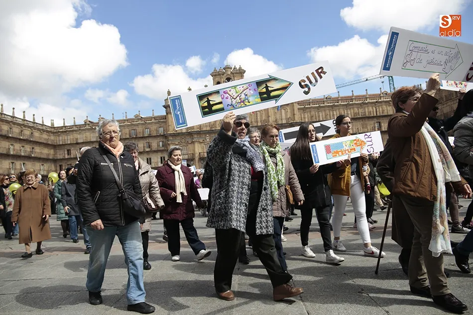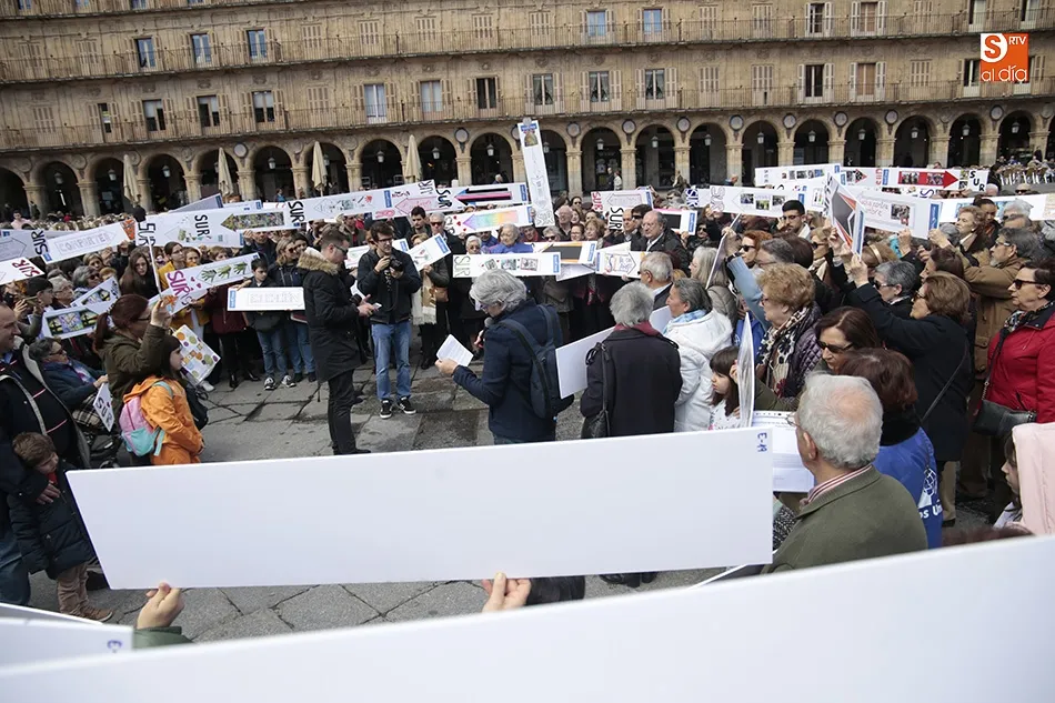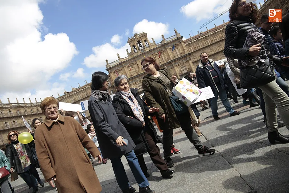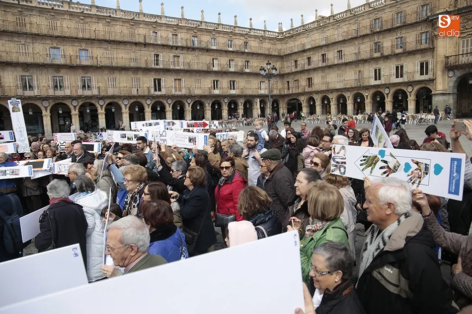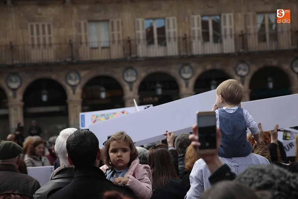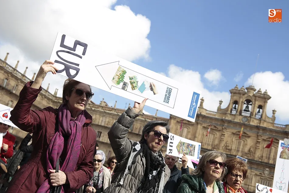 Numerosos salmantinos han participado en el tradicional ?Abrazo solidario? de Manos Unidas en la Plaza Mayor que alcanza la novena edición. Entre los asistentes, las concejalas Cristina Klimowitz e Isabel Macías.