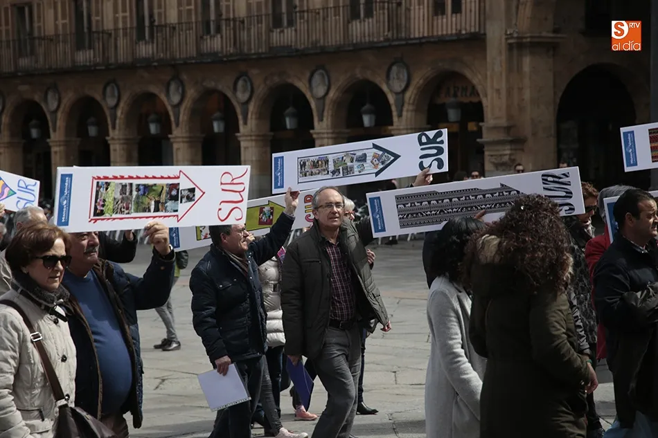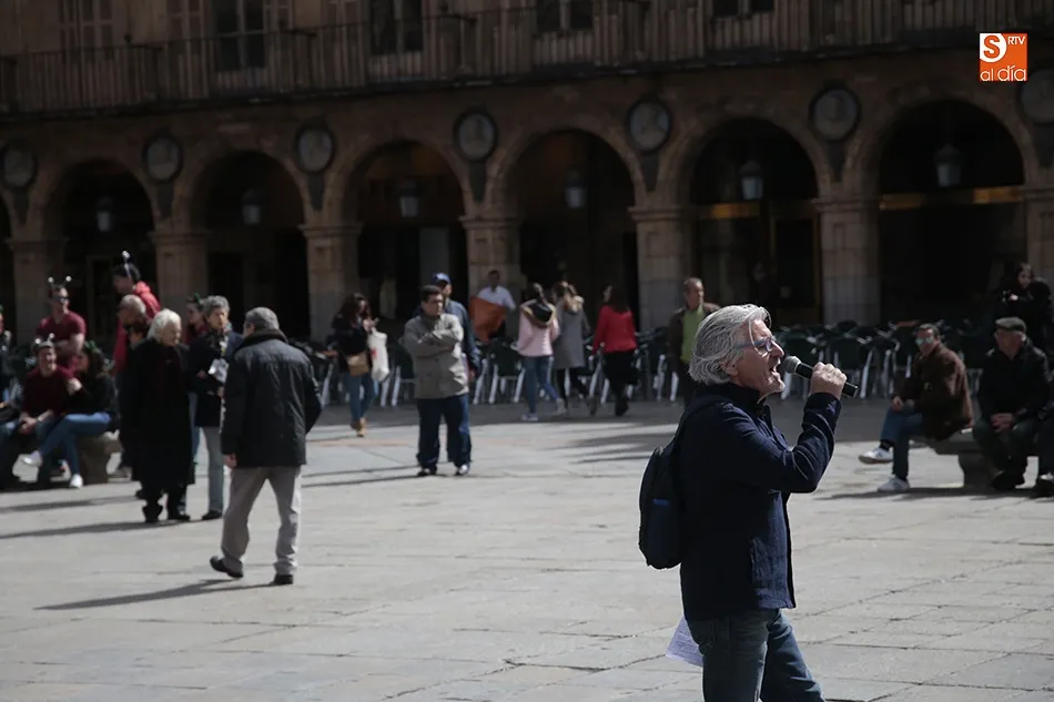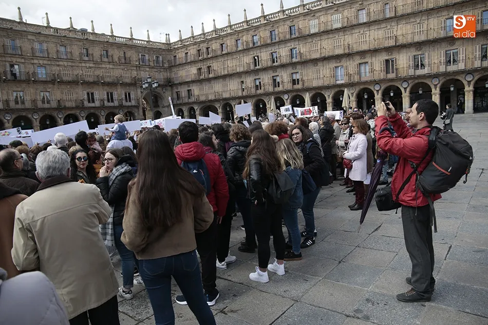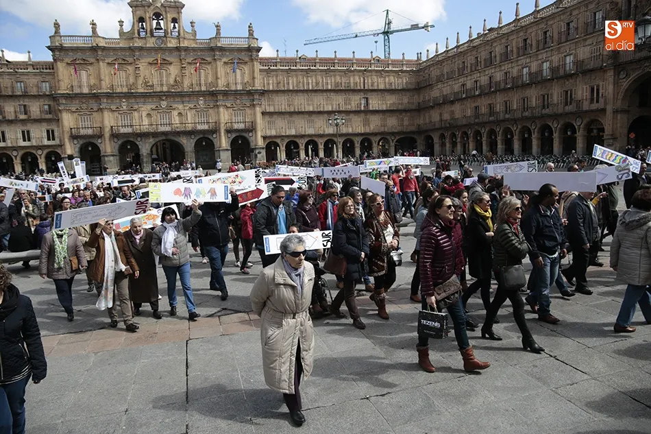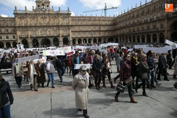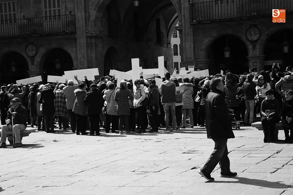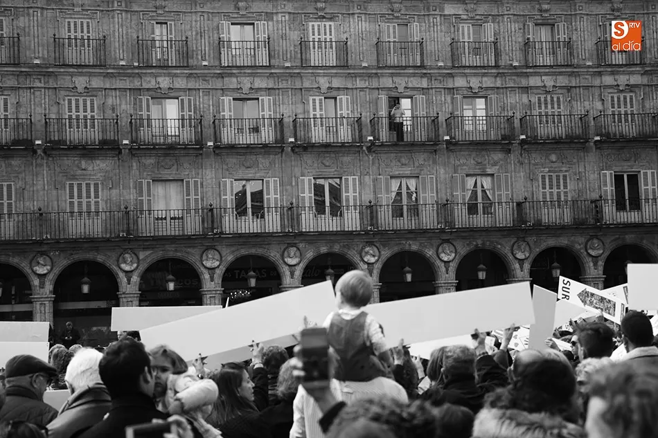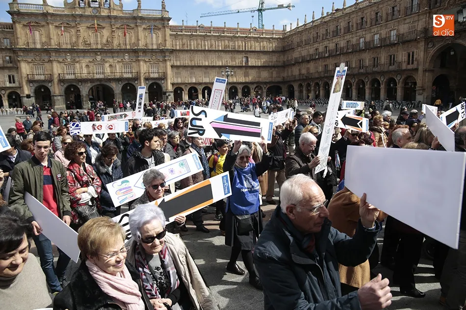 Numerosos salmantinos han participado en el tradicional ?Abrazo solidario? de Manos Unidas en la Plaza Mayor que alcanza la novena edición. Entre los asistentes, las concejalas Cristina Klimowitz e Isabel Macías.