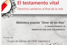 La Biblioteca Popular Giner de los Ríos y la Asociación Derecho a una Muerte Digna, DMD, han organizado el próximo lunes, a las 18.00 horas, una charla-coloquio sobre ?El testamento vital. Derechos sanitarios al final de la vida?, que tendrá lugar en la biblioteca (C/ Maestro Barbieri, 18, barrio de San José) con Mercedes Martín y Fernando Sanz, médica y médico de Atención Primaria, miembros de DMD-Salamanca.
