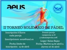 La Asociación de Estudiantes Independientes de la Universidad de Salamanca (AEUS) organizará entre los días 24 y 26 de abril en el complejo deportivo de Salas bajas el segundo torneo solidario de pádel. El objetivo de la asociación es "recaudar dinero para el Banco de Alimentos de Salamanca destinando íntegramente todo lo recaudado en las inscripciones, cuyo precio son de 8 euros cada pareja participante".