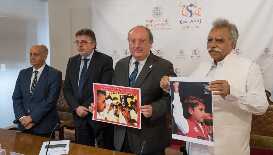 En su visita a Salamanca, el activista responsable de actividades de oposición a la esclavitud infantil en las Naciones Unidas y en la Organización Mundial del Trabajo, fue recibido por el vicerrector de Política Académica y Participación Social, Enrique Cabero, en el rectorado de la Universidad de Salamanca, en donde se llevó a cabo una rueda de prensa en la que estuvieron presentes Ángel Castilla Corral, presidente del Colegio Oficial de Graduados Sociales de Salamanca, y Joaquín Merchán Bermejo, vicepresidente segundo del Consejo General de Graduados Sociales de España.