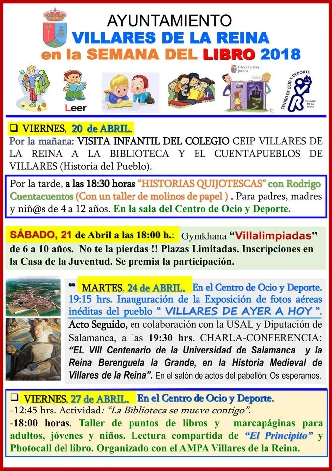 Con motivo de la celebración del Día del Libro, la Concejalía de Cultura del Ayuntamiento de Villares de la Reina ha organizado una variada programación de actividades que se van a desarrollar del 20 al 27 de abril en el Centro de Ocio y Deporte José Martín Méndez, donde se encuentra la biblioteca municipal.