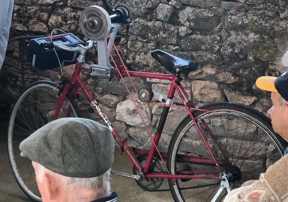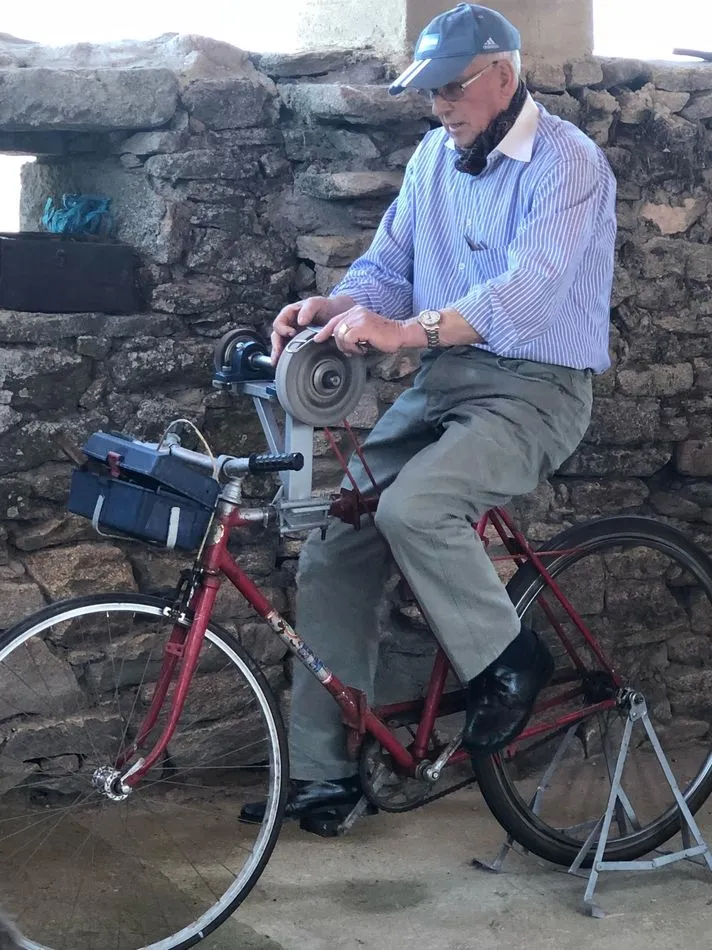La bicicleta, ?su mesa de trabajo?, se frena cuando empieza a afilar gracias a un mecanismo ideado por él mismo. Tiene instalado un motor que acciona la correa que, a su vez, hace girar la piedra de afilar. La bicicleta también incorpora una caja de herramientas y otros departamentos donde lleva todo lo necesario para seguir realizando su trabajo en Cudillero a donde se traslada desde Gijon.
