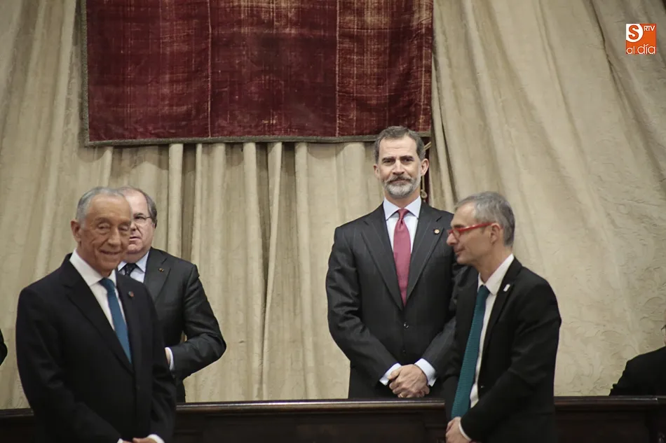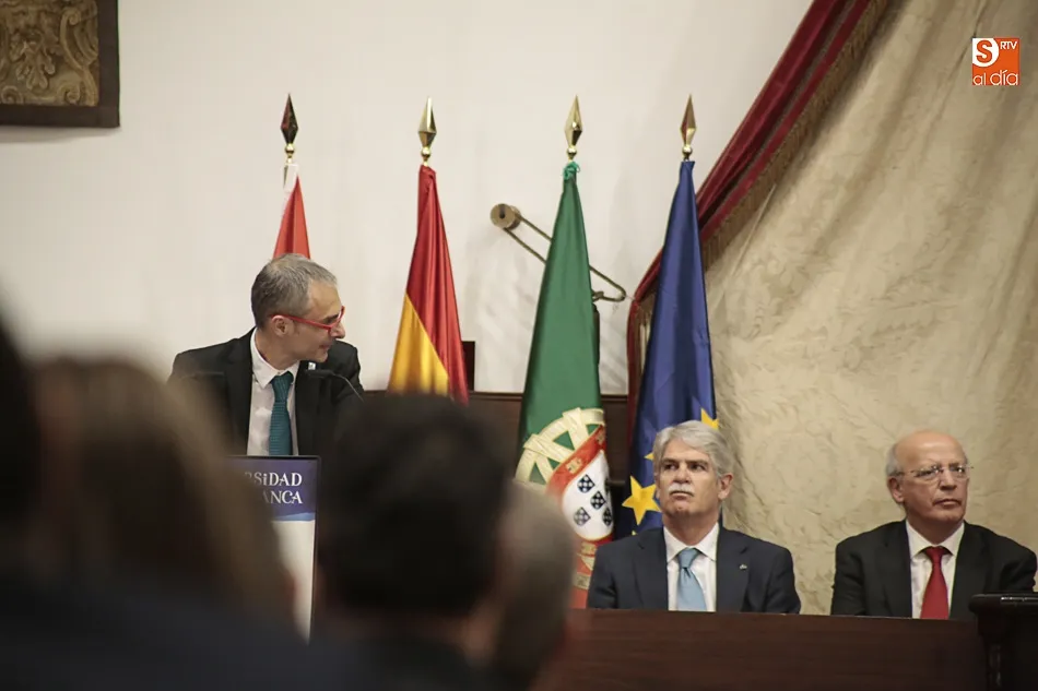 El rector de la Universidad de Salamanca, Ricardo Rivero, ha sido el encargado de abrir el solemene acto hispanoluso con motivo del VIII Centenario de la Universidad de Salamanca, que se ha celebrado este miércoles en el Paraninfo.