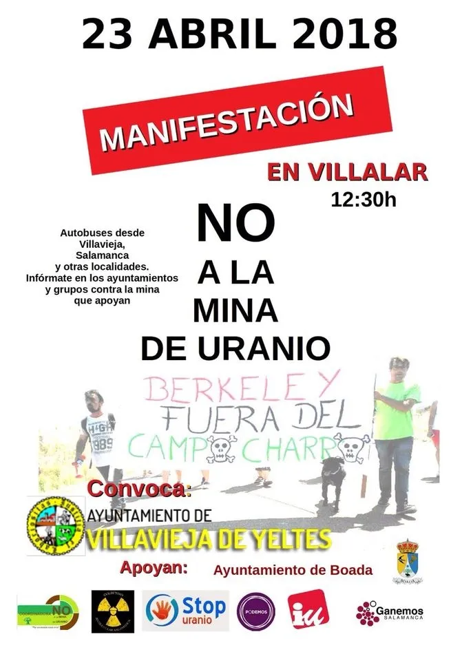 El Ayuntamiento de Villavieja de Yeltes ha convocado para el próximo 23 de abril una manifestación en Villalar de los Comuneros (Valladolid) contra el proyecto de la mina de uranio. La protesta ha sido presentada hoy en Salamanca por el alcalde de la localidad, Jorge Rodríguez, quien ha informado de la adhesión a esta iniciativa de otros 11 ayuntamientos de la comarca, distintos partidos políticos (a excepción de PP y Ciudadanos), las cuatro organizaciones agrarias de la provincia y numerosos colectivos antimina y ecologistas.