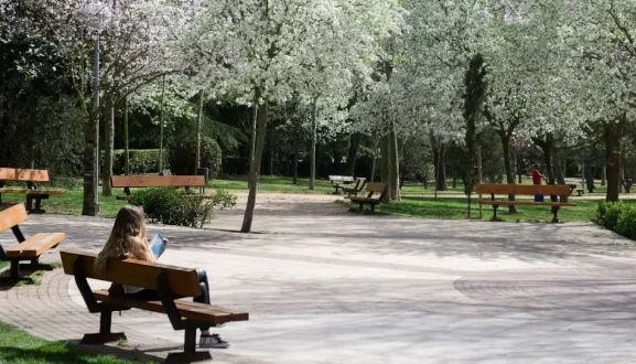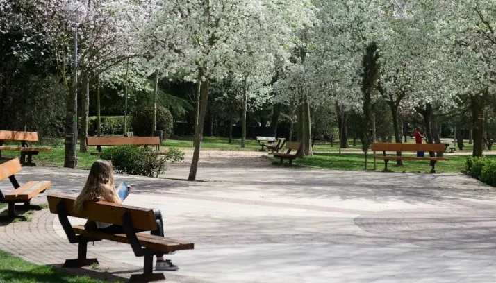 Cabellos rubios, como de diosa, y pétalos blancos, tan de paraíso. Porque todo es belleza: en la joven que lee, ensimismada, y en los árboles, que celebran sus bodas con la primavera, vestidos del fulgor de su blancura.