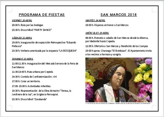 Cepeda de la Sierra lo tiene todo listo para celebrar sus festejos en honor a San Marcos. Las actividades se dividen en dos días. El primero de ellos será el domingo 22 de abril, con la celebración de un gran mercado serrano en la localidad. Además, este año se suman las propuestas del Plan de Dinamización de la Ruta del Vino de la Sierra de Francia con una ruta urbana y la experiencia ?Catar un territorio?. Además, la iglesia parroquial acogerá la representación de ?Teresa, la jardinera de la luz?. El miércoles 25 será el turno de las propuestas religiosas, con el tradicional ofertorio y la bendición de campos, sin olvidar la romería a caballo desde La Alberca pasando por Madroñal que el año pasado contó con una docena de caballistas participantes.
