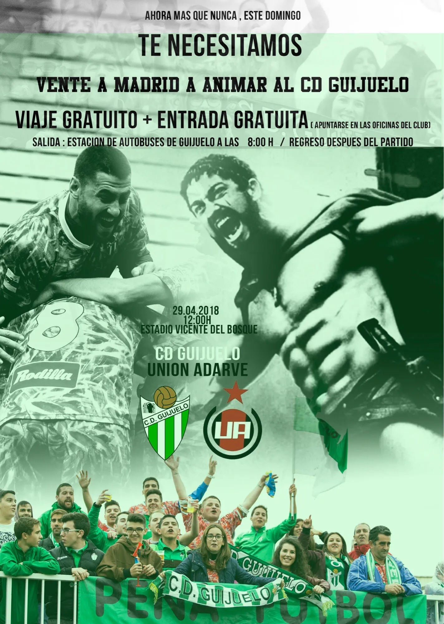 Todos a Madrid. El Club Deportivo Guijuelo necesita desesperadamente ganar en liga para no vivir un final de liga de infarto, y para contar con todos los apoyos posibles, el club invita a la afición a acompañarles en el partido de este domingo, 29 de abril, contra el Unión Adarve.