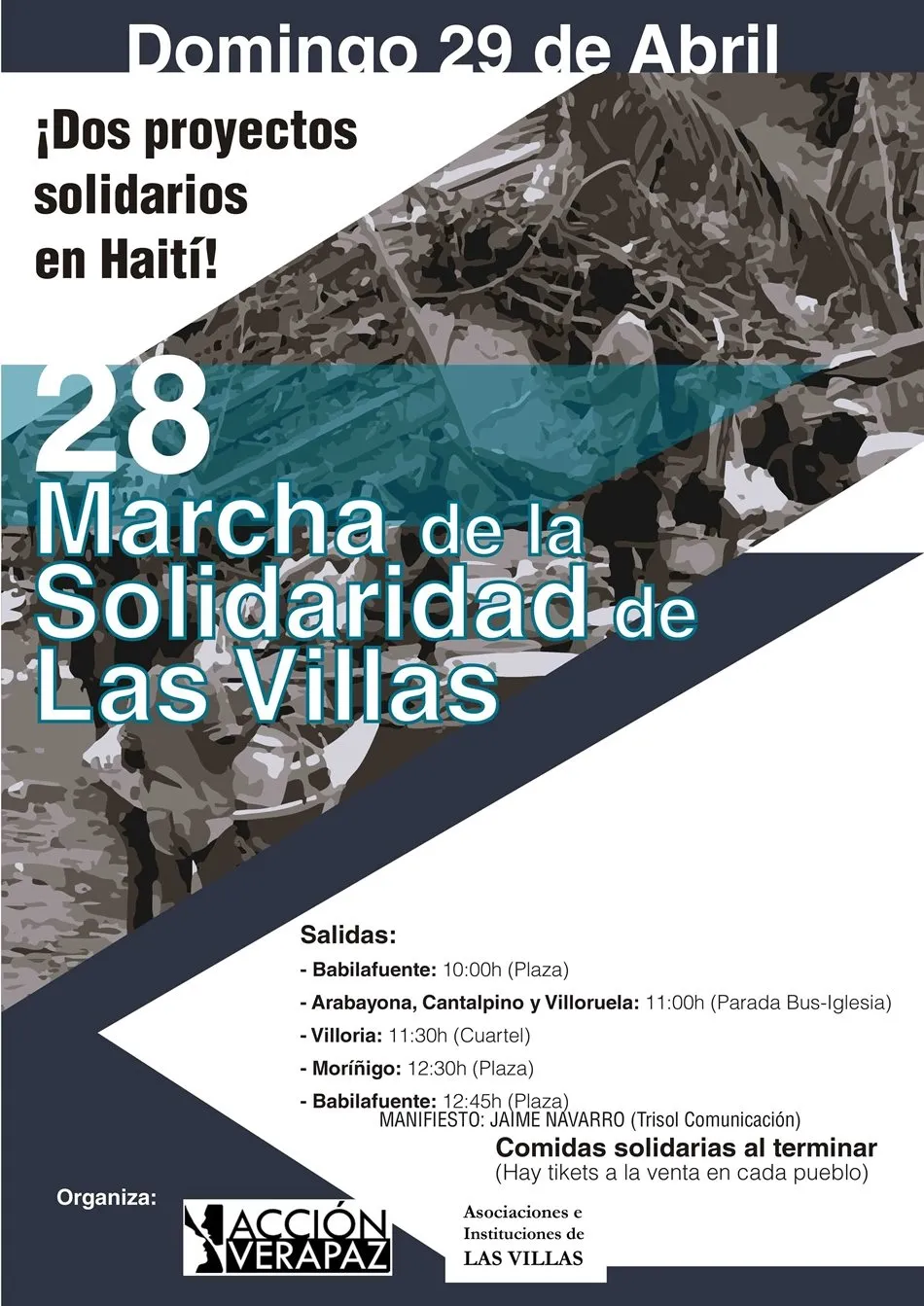 Este domingo, la solidaridad volverá a recorrer los caminos de Las Villas. A las 10 horas comenzará en la Plaza Mayor de Babilafuente la 28 Marcha de la Solidaridad, organizada por Acción Verapaz y asociaciones e instituciones de la zona. Cientos de personas se irán uniendo a lo largo del recorrido, que volverá a Babilafuente para la lectura del manifiesto. En esta ocasión, la lectura correrá a cargo de Jaime Navarro, de Trisol Comunicación.