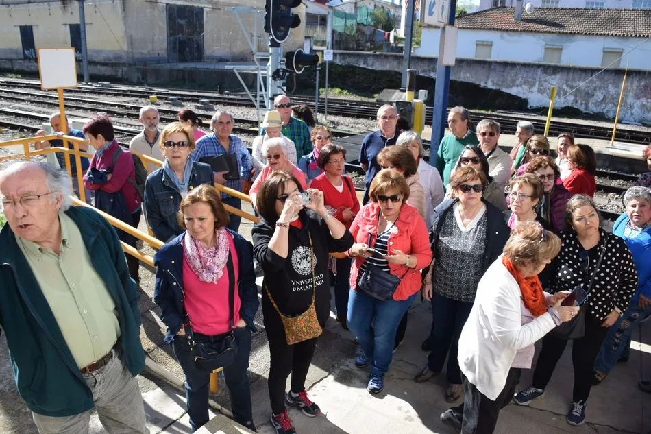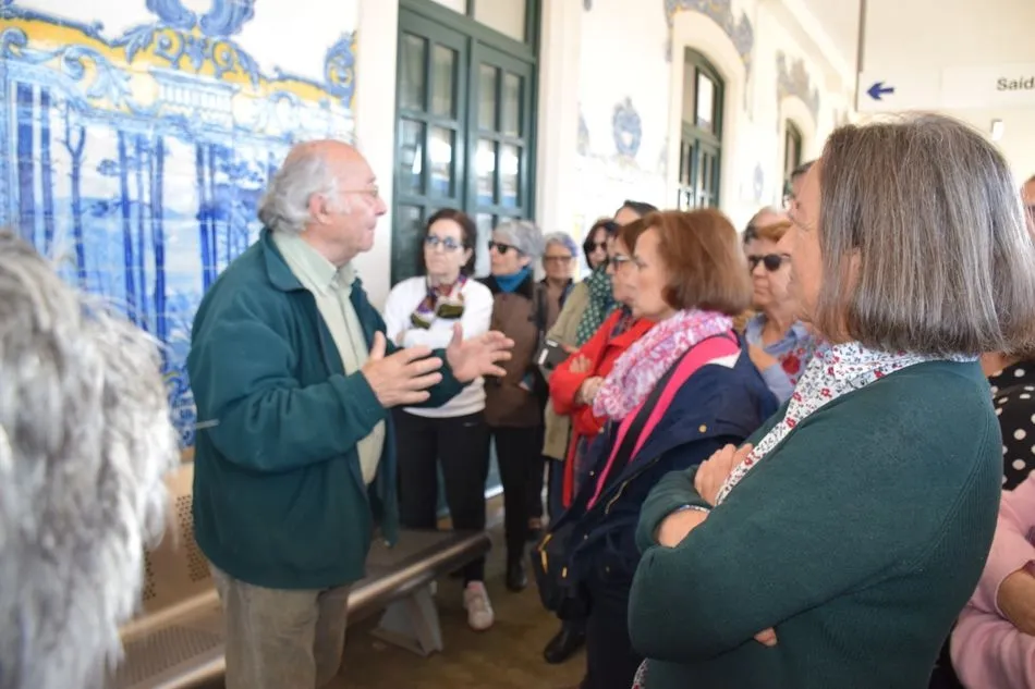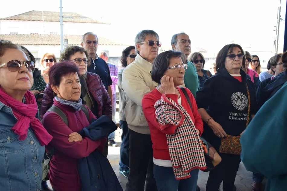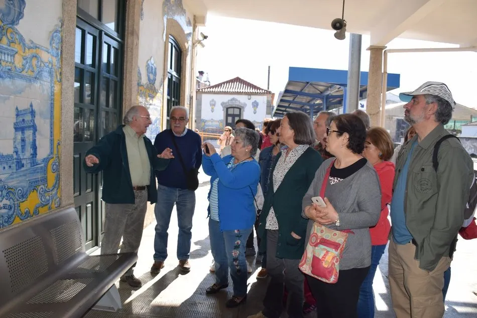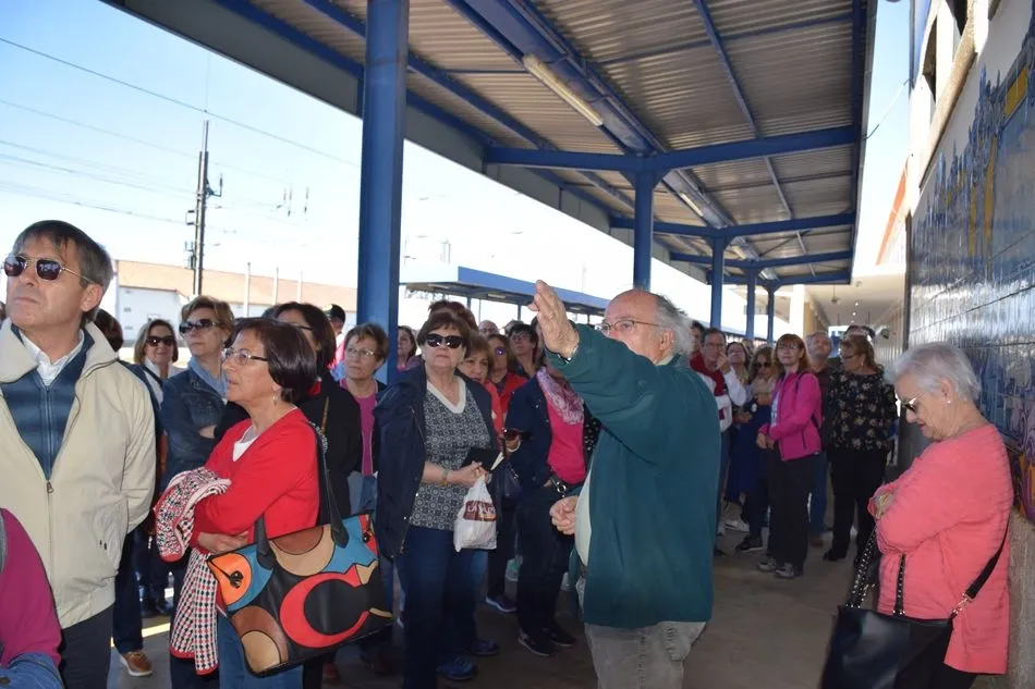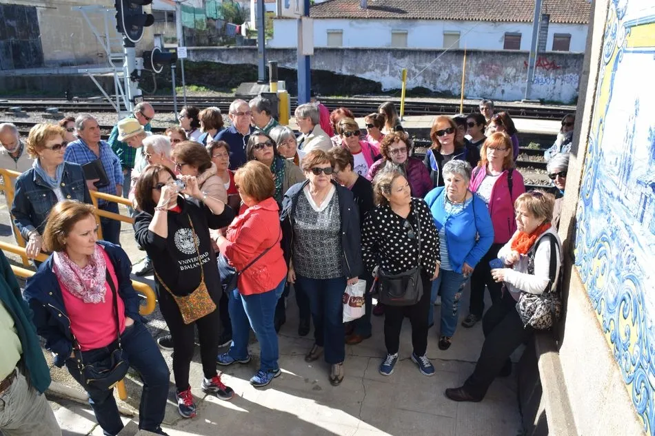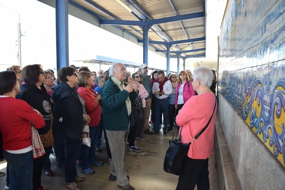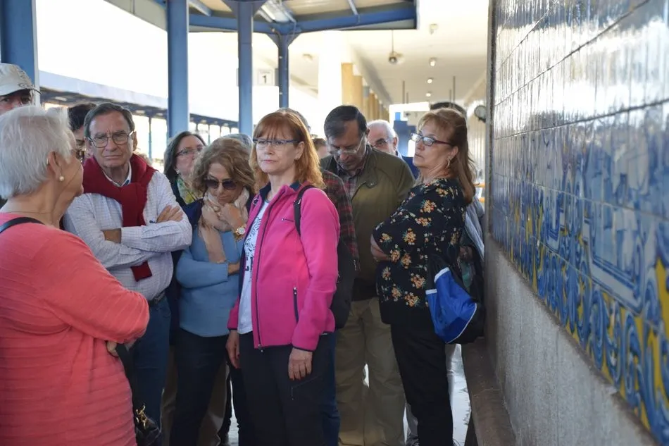 La visita comenzó con una parada en la estación de ferrocarril de Vilar Formoso, puerta de entrada y salida de emigrantes y de perseguidos por motivos políticos, para acercarnos a través de los paneles de azulejos que decoran sus paredes a la historia, ciudades, monumentos y paisajes portugueses, entre otros: Almeida, plano de la red ferroviaria de la Beira, Universidad de Coimbra, Viseu, pastor en la sierra, Convento de Jesús de Setúbal, Fonte das Figueiras de Santarem, Torre de Belem, Catedral de Guarda, etc. El profesor Cabero explicó el significado y la simbología que representan algunos de estos paneles.