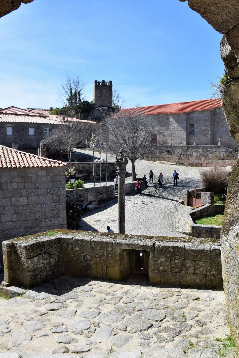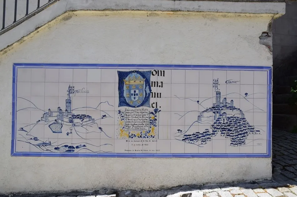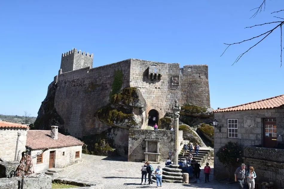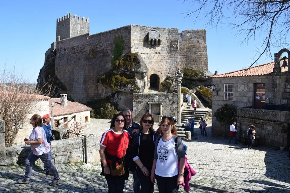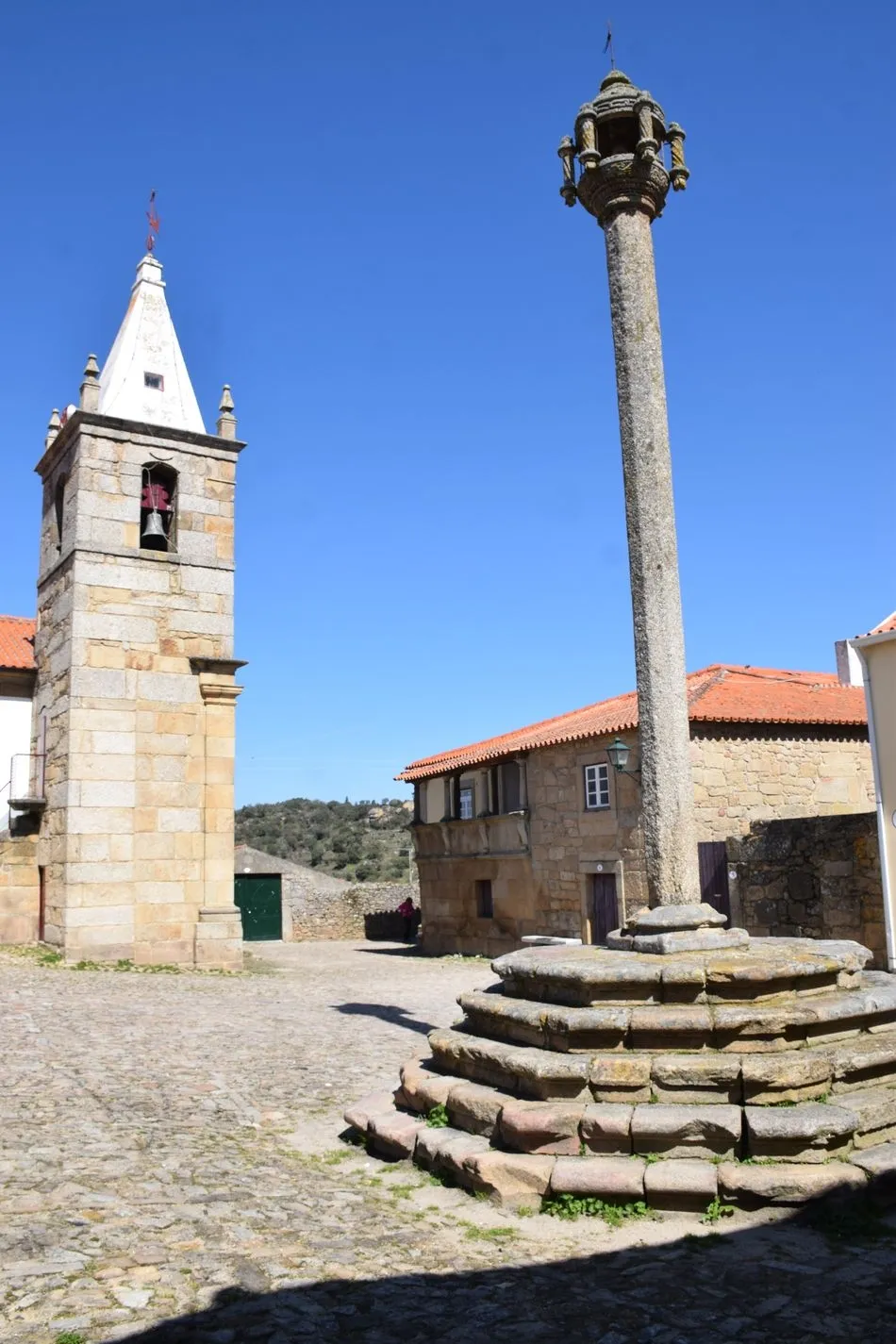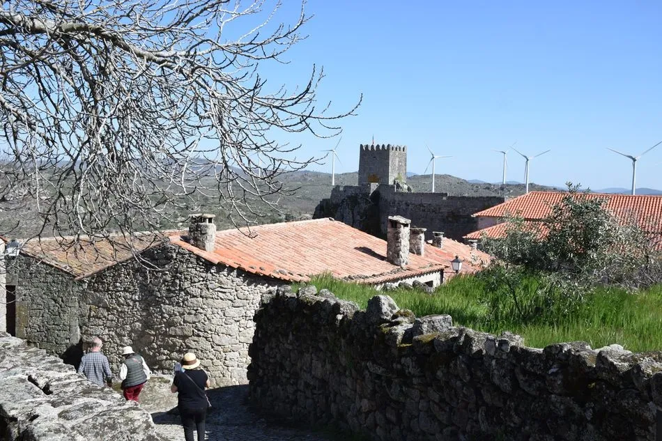 Nuestra primera parada es a la sombra de un viejo Celtis Australis (variedad de olmo) donde recibimos la primera explicación sobre el lugar y el árbol que nos cobija del sol. De su riquísimo patrimonio artístico habría que destacar el Castillo, fundado en el siglo XIII, en la pequeña plaza de armas encuentra el aljibe y una falsa puerta o portillo al valle; la Torre del Homenaje, sus murallas a las que se puede acceder y pasear por el adarve y asomarse al matacán que hay encima de la puerta de la fortaleza. Las murallas que circundan la población carecen de almenas; el Pelourinho o picota rematado con la esfera armilar símbolo real; la antigua Casa de la Cámara, la Casa del Gobernador, y otras construcciones de los periodos medieval y manuelinos; los Passos de la Vía Sacra (de estilo barroco) repartidos por distintas zonas; la iglesia de Nuestra Señora de las Nieves; la Puerta Nueva, desde donde contemplamos la Sierra de la Estrella cubierta de nieve; el campanario; el antiguo hospital de la Misericordia, las ruinas de la iglesia de Santiago y sepulturas excavadas en la roca granítica. Junto a la Puerta Nueva se celebraba el antiguo mercado medieval y en un lateral al exterior tiene grabadas las antiguas medidas utilizadas en los mercados y ferias: el «codo» (66 cm) y la «vara» (110 cm). La Puerta Falsa, desde donde observamos unas espectaculares e inusuales rocas erosionadas por la lluvia y el viento bautizadas como Cabeza de la Vieja y Piedra del Beso.