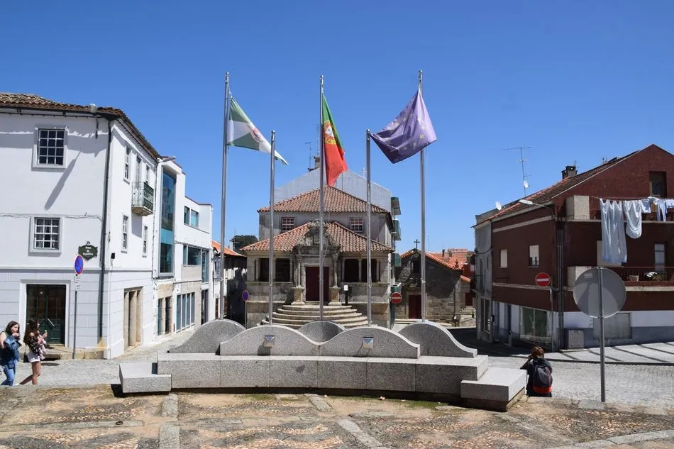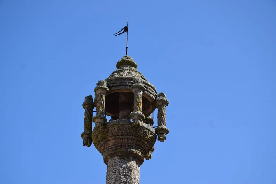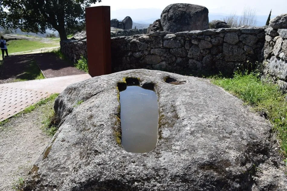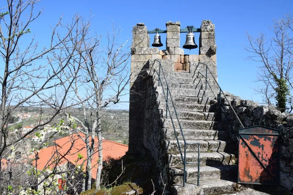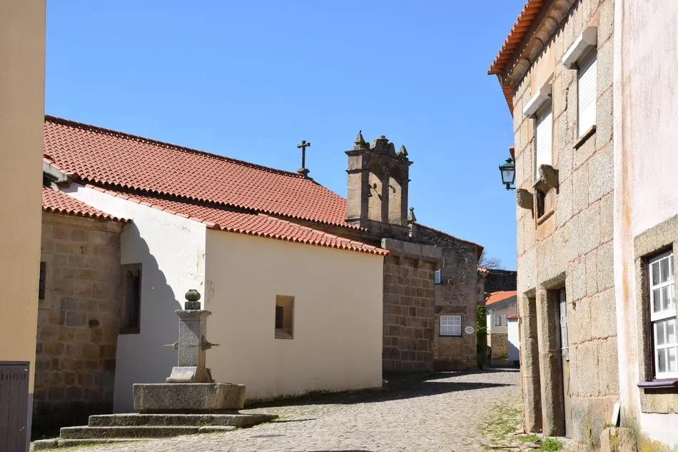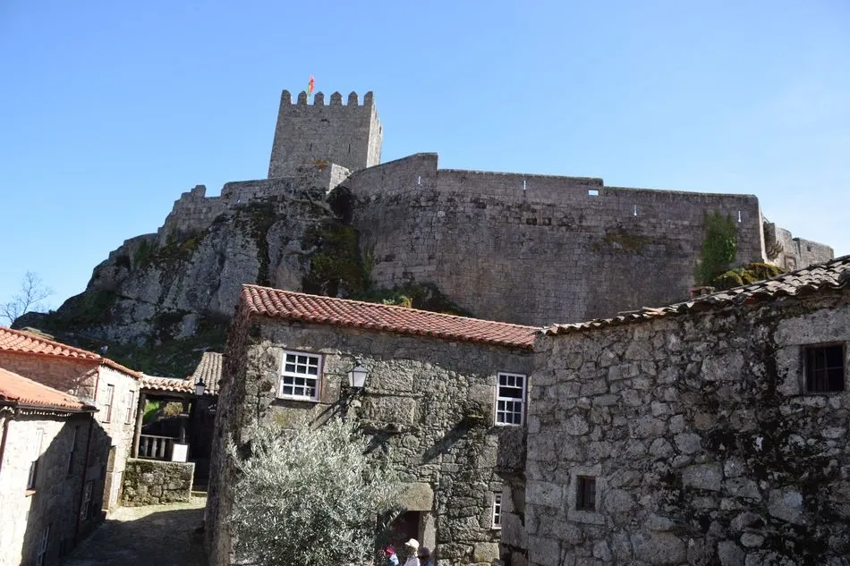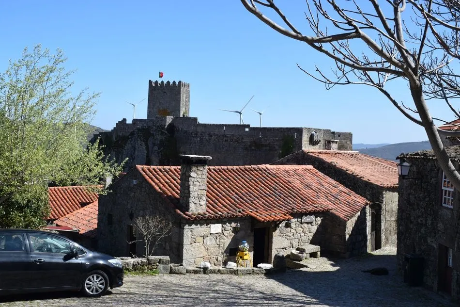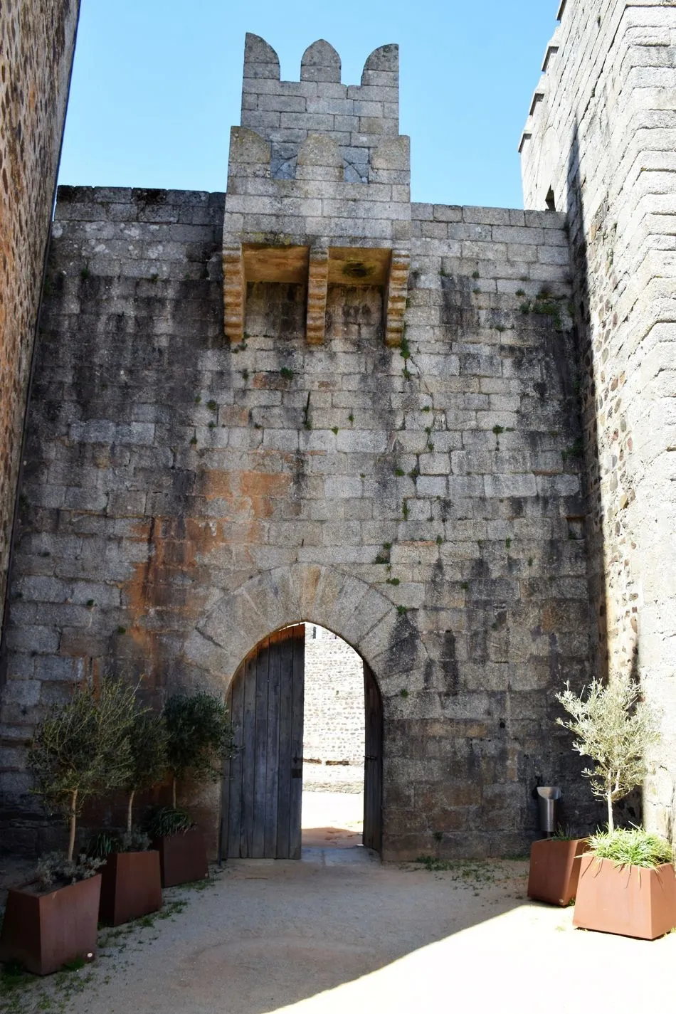 Nuestra primera parada es a la sombra de un viejo Celtis Australis (variedad de olmo) donde recibimos la primera explicación sobre el lugar y el árbol que nos cobija del sol. De su riquísimo patrimonio artístico habría que destacar el Castillo, fundado en el siglo XIII, en la pequeña plaza de armas encuentra el aljibe y una falsa puerta o portillo al valle; la Torre del Homenaje, sus murallas a las que se puede acceder y pasear por el adarve y asomarse al matacán que hay encima de la puerta de la fortaleza. Las murallas que circundan la población carecen de almenas; el Pelourinho o picota rematado con la esfera armilar símbolo real; la antigua Casa de la Cámara, la Casa del Gobernador, y otras construcciones de los periodos medieval y manuelinos; los Passos de la Vía Sacra (de estilo barroco) repartidos por distintas zonas; la iglesia de Nuestra Señora de las Nieves; la Puerta Nueva, desde donde contemplamos la Sierra de la Estrella cubierta de nieve; el campanario; el antiguo hospital de la Misericordia, las ruinas de la iglesia de Santiago y sepulturas excavadas en la roca granítica. Junto a la Puerta Nueva se celebraba el antiguo mercado medieval y en un lateral al exterior tiene grabadas las antiguas medidas utilizadas en los mercados y ferias: el «codo» (66 cm) y la «vara» (110 cm). La Puerta Falsa, desde donde observamos unas espectaculares e inusuales rocas erosionadas por la lluvia y el viento bautizadas como Cabeza de la Vieja y Piedra del Beso.