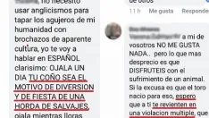 No ha sido el único mensaje de odio de la animalista a esta joven: ?Lo que más desprecio es que disfrutéis con el sufrimiento de un animal. Si la excusa es que el toro nació para eso, espero que a ti te revienten en una violación múltiple. Que para eso tienes coño...?, publicaba unas horas antes.