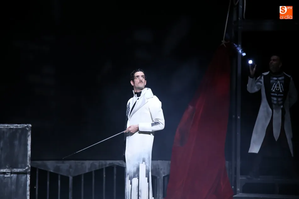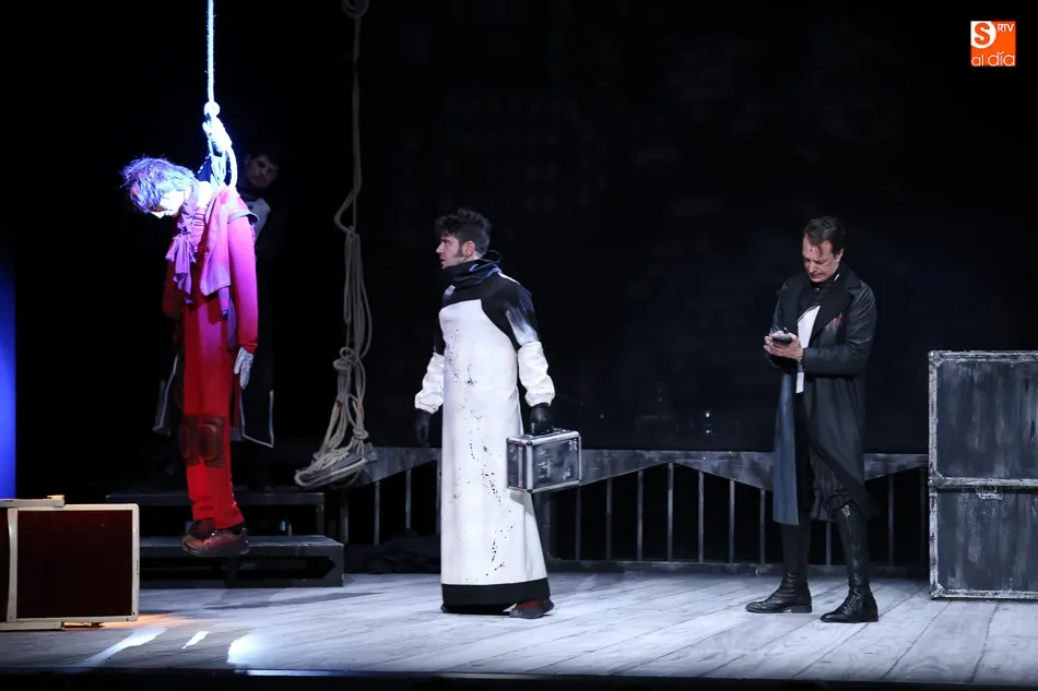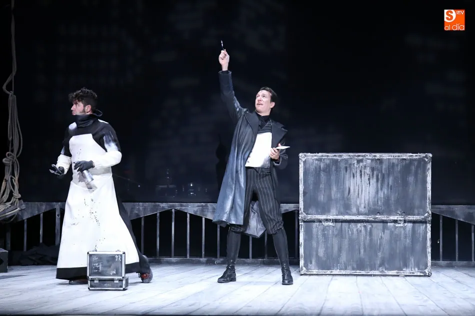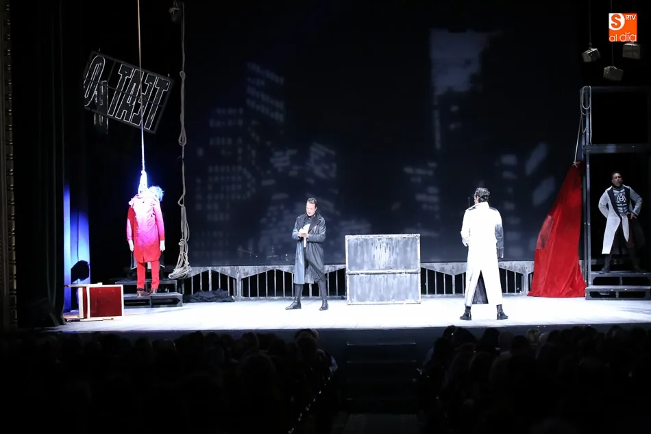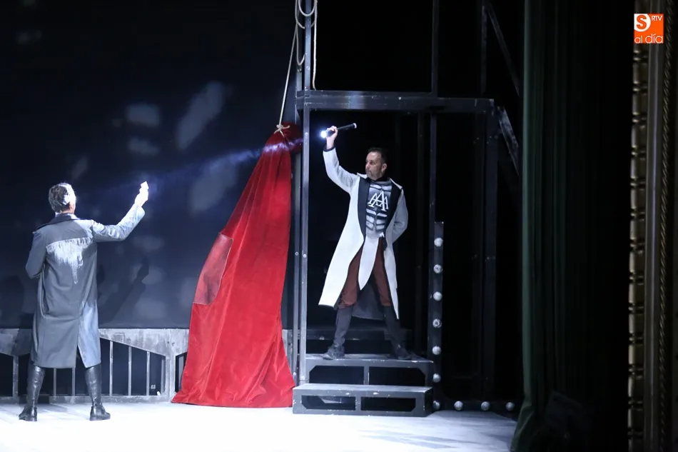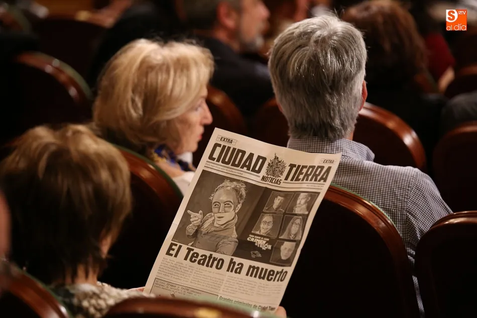 La compañía Ron Lalá llegaba este viernes a Salamanca con la obra ?Crimen y telón? que volverán a representar este sábado, a las 21 horas con el reparto integrado por Juan Cañas, Íñigo Echevarría/Jacinto Bobo, Fran García, Miguel Magdalena y Daniel Rovalher y bajo la dirección de Yayo Cáceres. Una obra en la que rinden homenaje al teatro universal a través de un thriller de género negro y ambientado en un cercano futuro en que las artes están prohibidas y nuestro planeta, convertido en Ciudad Tierra, es liderado por una inteligencia artificial con un ejército de drones. Una investigación contrarreloj en que el asesino podría ser cualquiera. Incluso ustedes, señores espectadores.