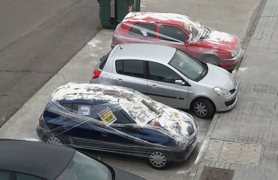 Dos vehículos estacionados en el Paseo de Carmelitas de Ciudad Rodrigo fueron objeto en la madrugada del viernes al sábado de un curioso ?ataque? a base de tomate y harina, además de ser envueltos con plástico transparente. Lejos de ser un caso de vandalismo, este curioso ataque contra estos turismos forma parte de las ?bromas? preparadas por sus amigos a una pareja con motivo de su despedida de solteros.