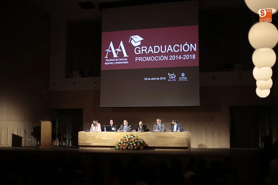 En la ceremonia, que ha tenido lugar en el Auditorio de la Hospedería Fonseca, han estado presentes el vicerrector de Profesorado, José María Díaz Mínguez; el decano de la Facultad de Ciencias Agrarias y Ambientales, Carmelo A. Ávila Zarza; la secretaria académica, Luz María Muñoz Centeno; la madrina del Grado en Ingeniería Agrícola, Mª Ángeles Gómez Sánchez; el padrino del Grado en Ciencias Ambientales, Luis Delgado Sánchez; y el presidente del Colegio Oficial de Ingenieros Técnicos Agrícolas y Graduados en Ingeniería de la Rama Agrícola de Castilla Duero, Gumersindo Sanabria Santervás.