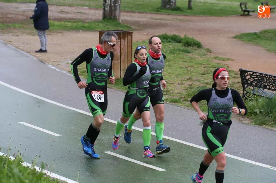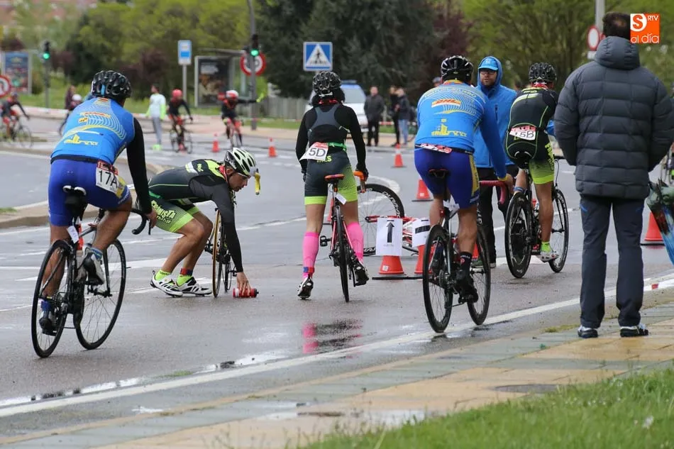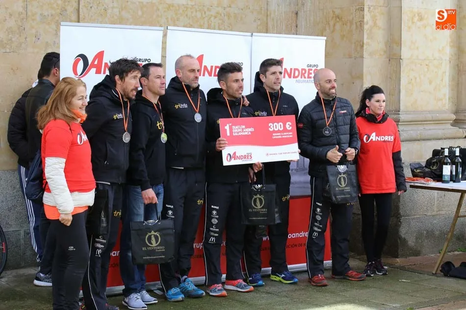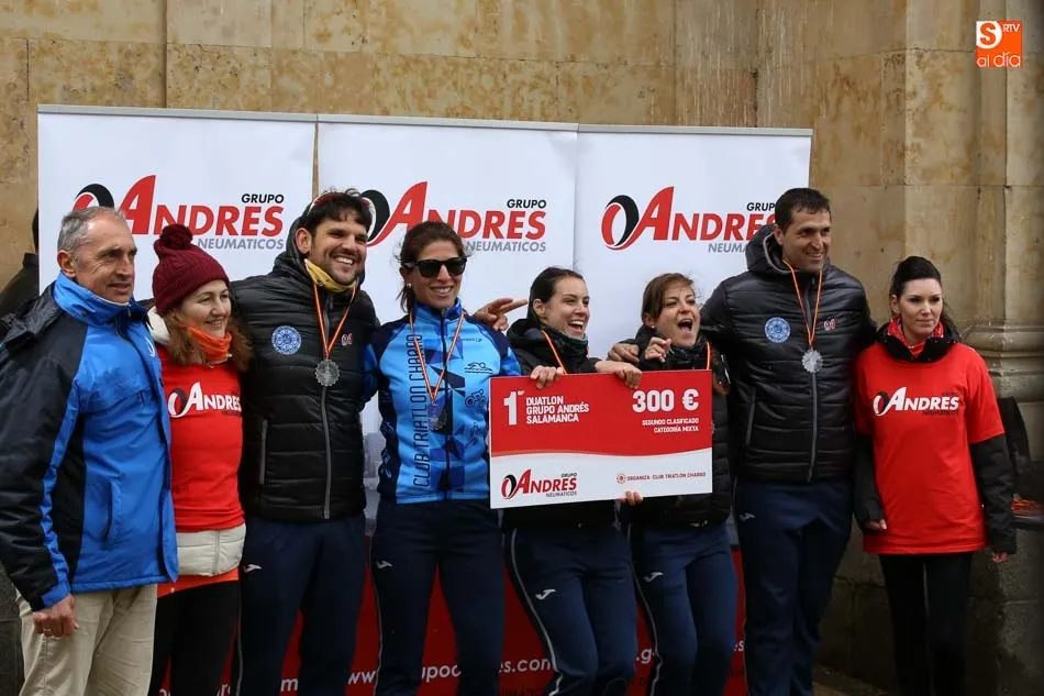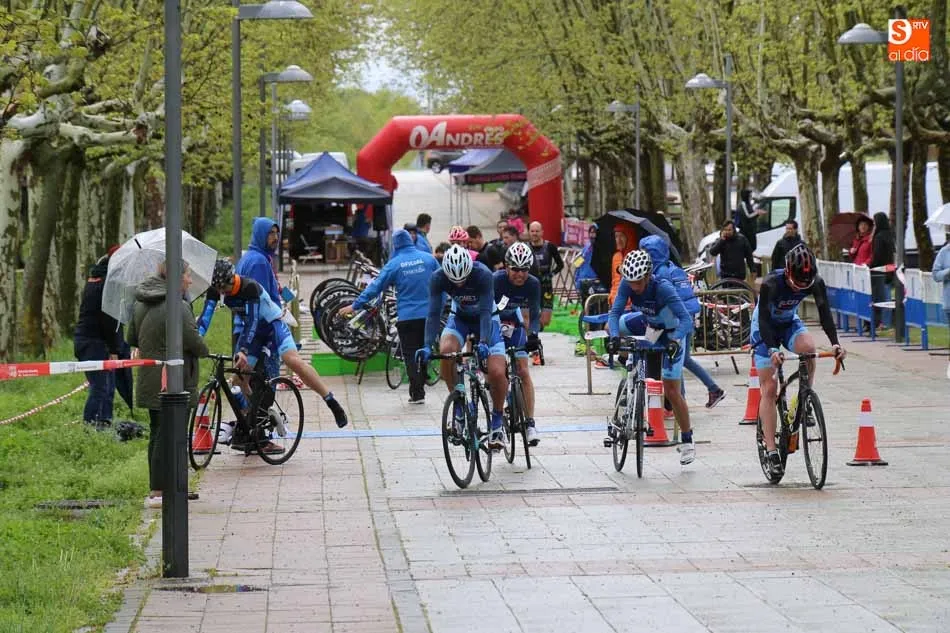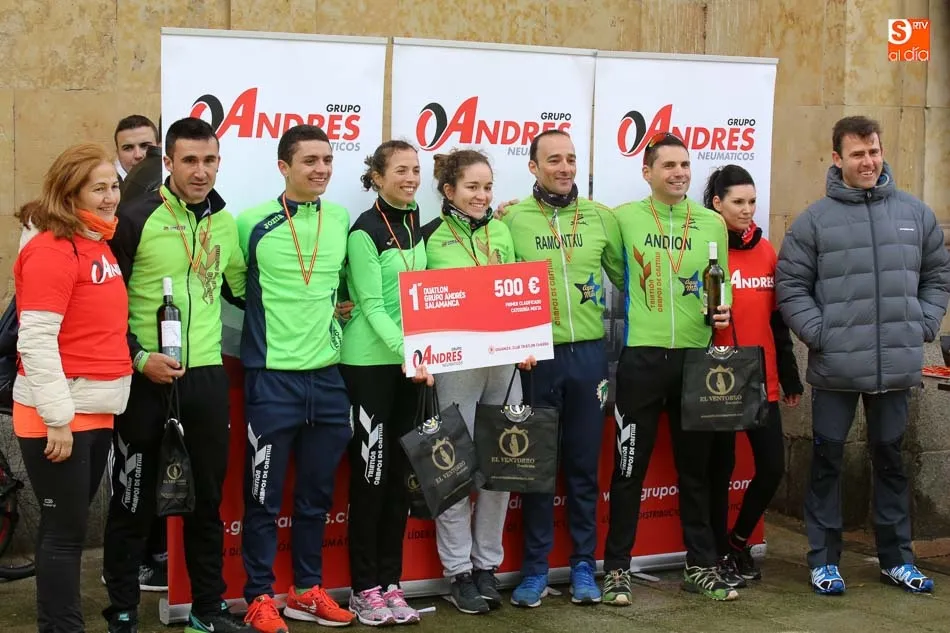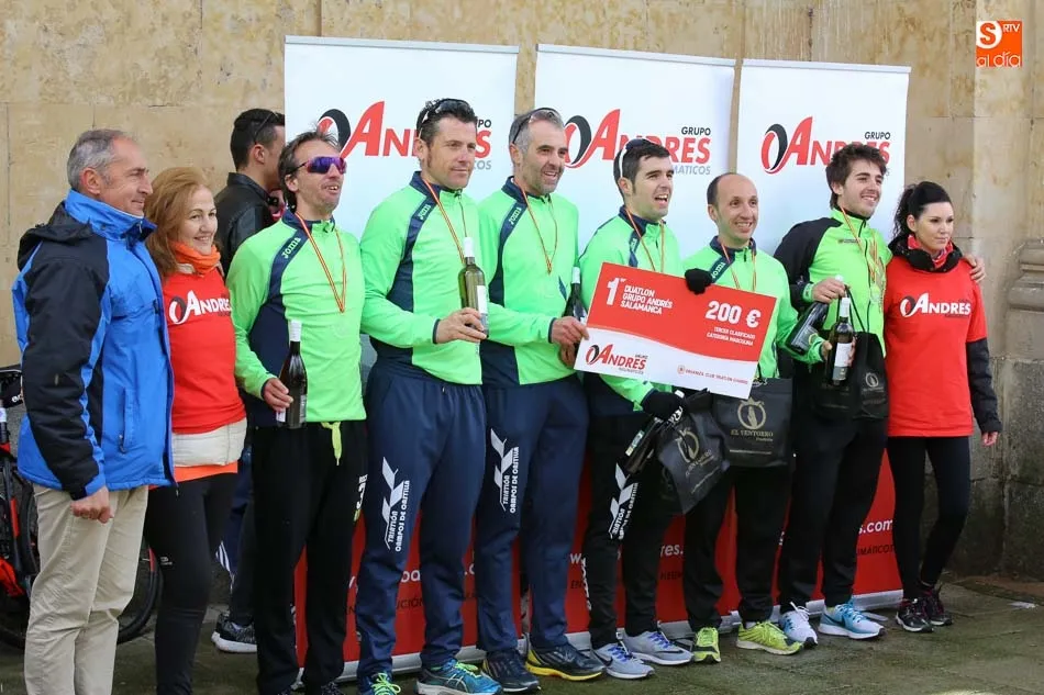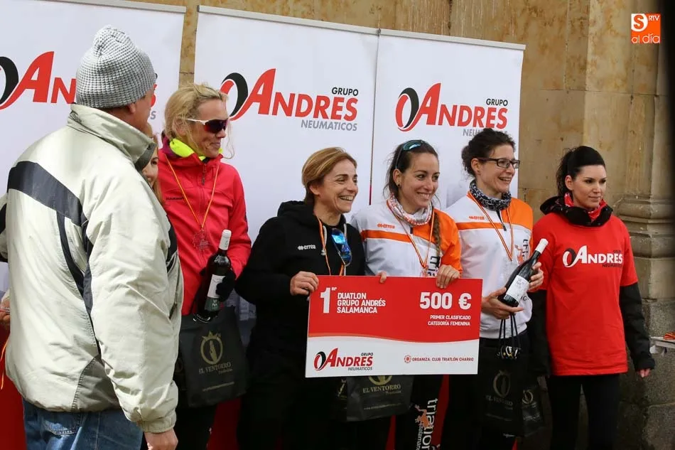 Salamanca vivía esta mañana una nueva experiencia que le volvía a convertir en el centro del Duatlón regional con la iniciativa del Club Triatlón Charro y con el apoyo de Grupo Andrés, empresa líder en la península en neumáticos. El formato, equipos, masculinos, femeninos y mixtos, trajo hasta la capital del Tormes representación de prácticamente los principales clubes de la región y también de alguna otra. Y terminó con las victorias del Campos de Castilla en Mixtos, del Trileón A en masculino y del Club Triatlón Salamanca A en féminas, con Marina González Redondo, Vicky Gómez, María Victoria Rangel, Raquel Sara Pérez y Lindsay Brady.