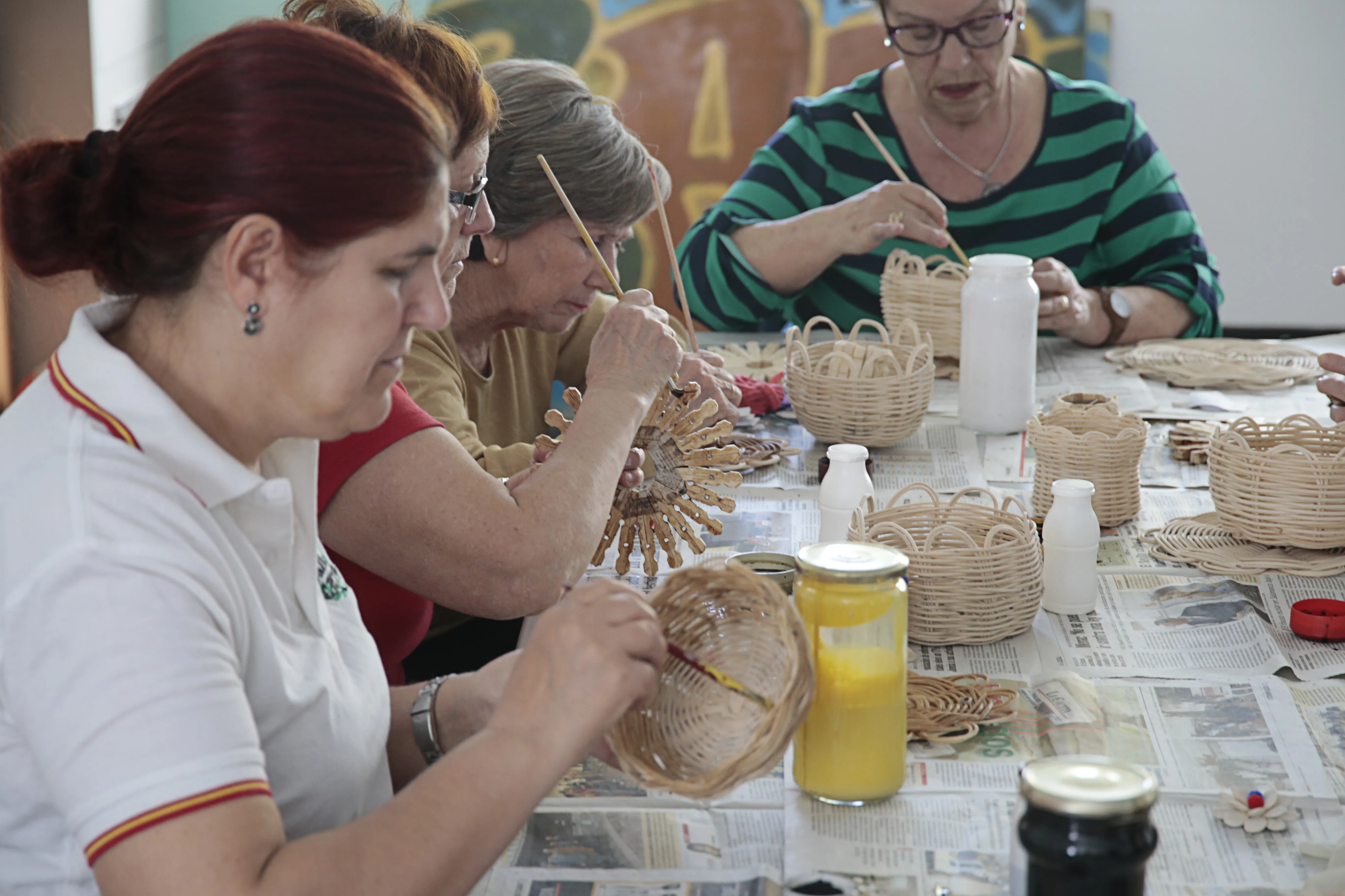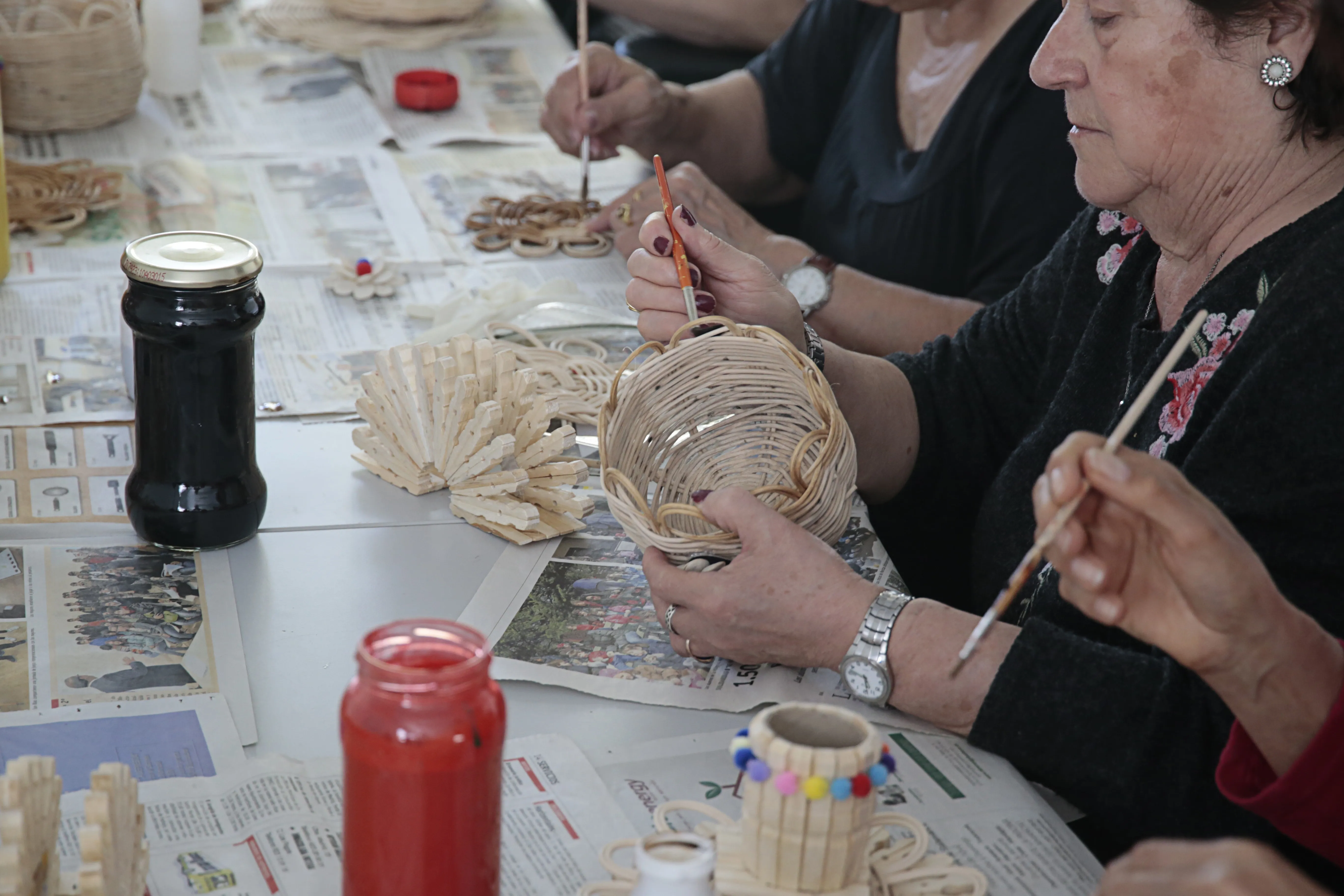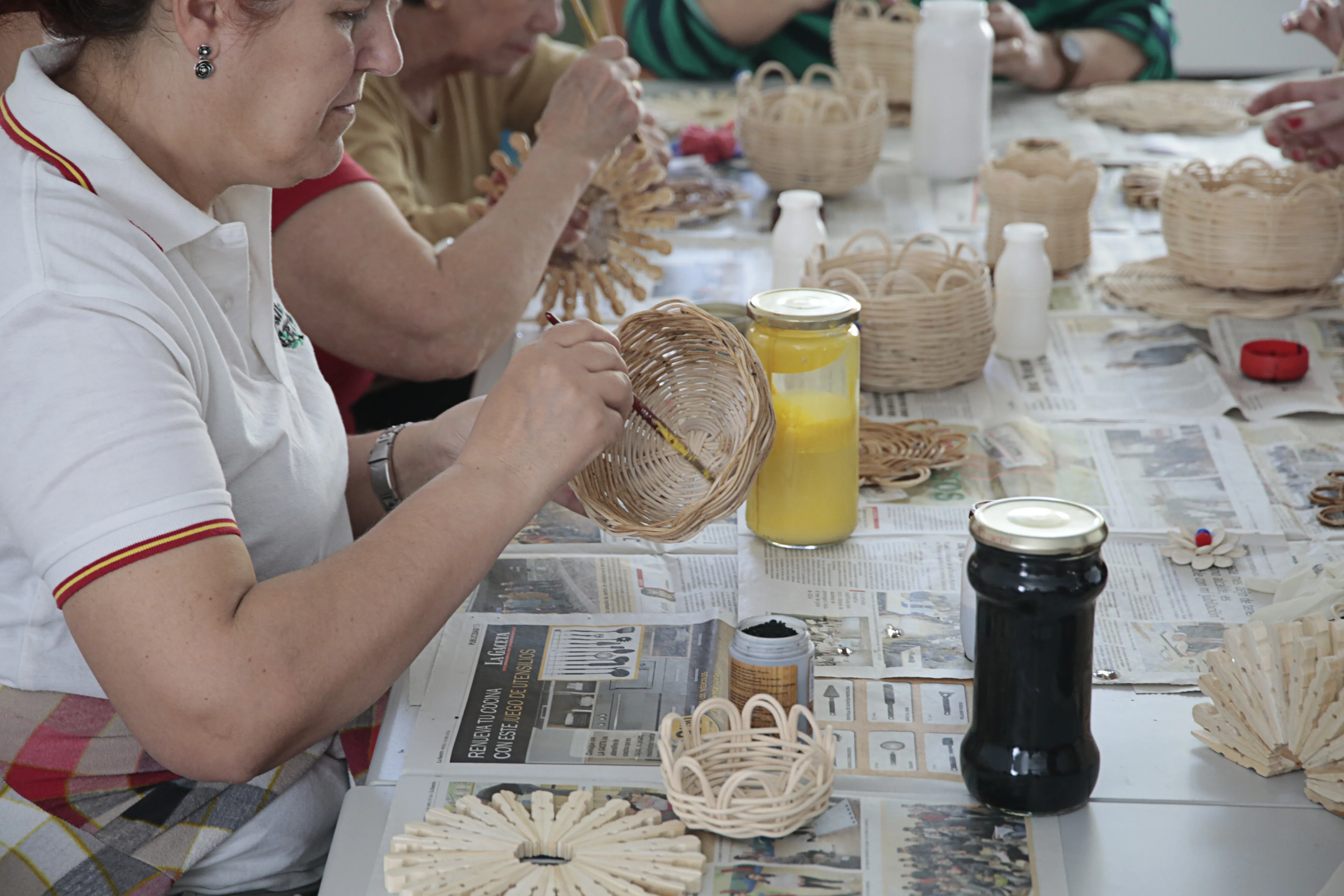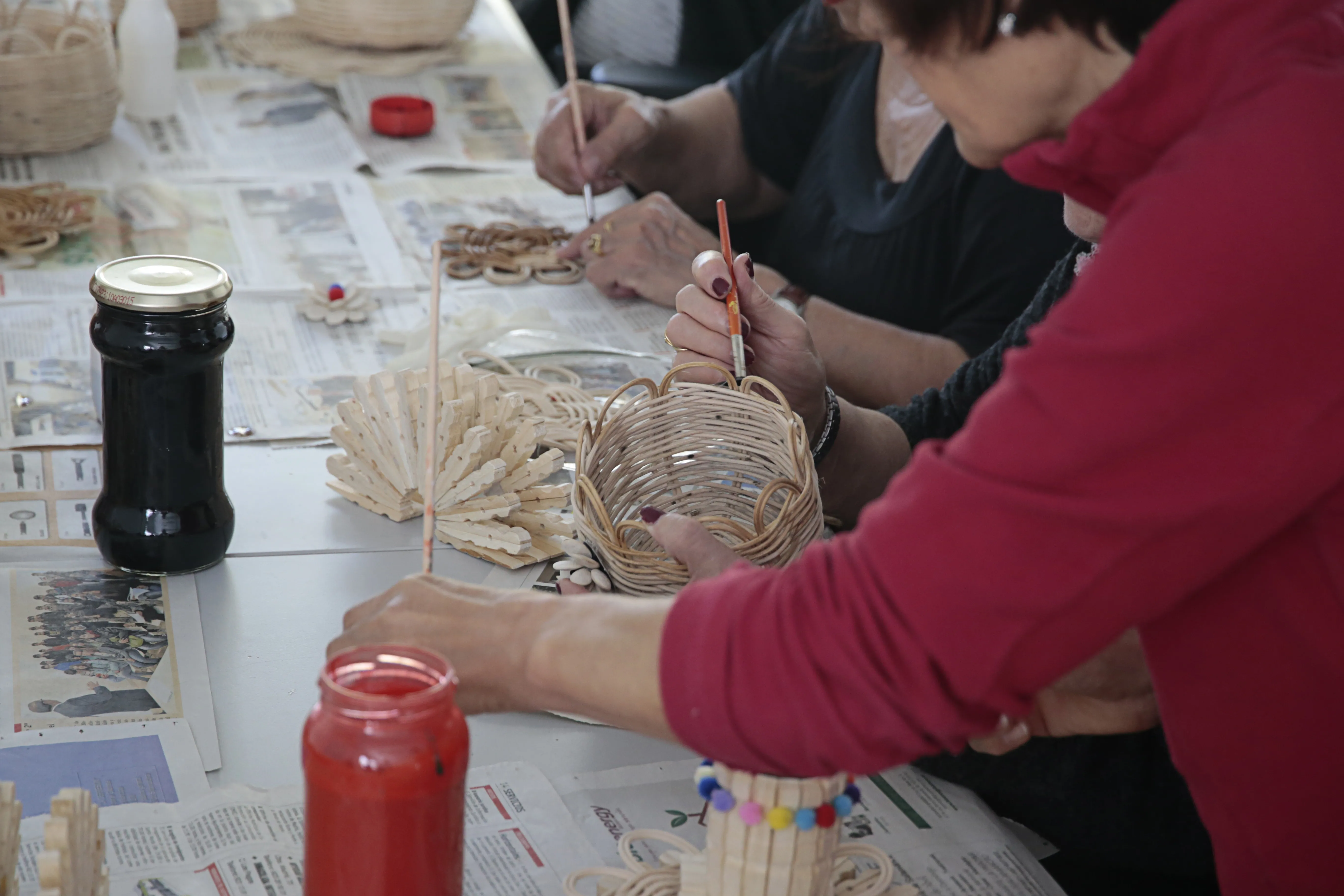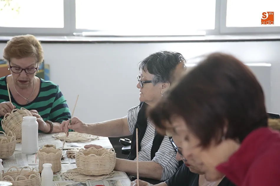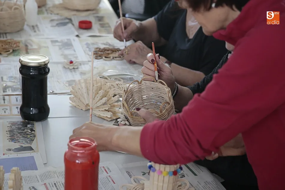 En este taller de manualidades participan alrededor de una docena de mujeres a las que se les suministra todo el material necesario para sus creaciones. Servilleteros con pinzas, prendedores con una flor hecha con pipas de calabaza, carpetas de cartón o pequeños cestos realizados con mimbre son algunos de los trabajos que las mujeres han elaborado en estos meses y que muestran con orgullo.