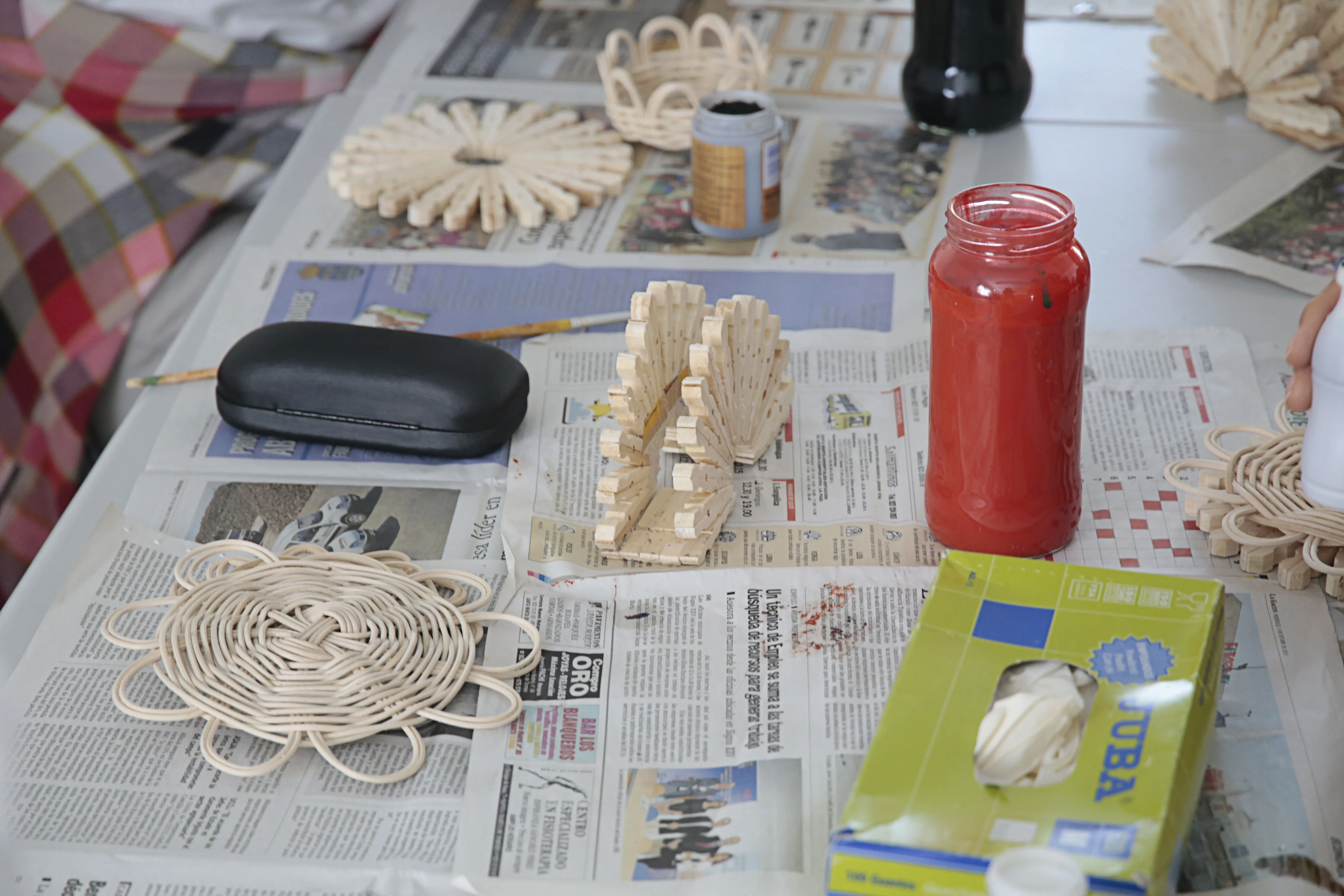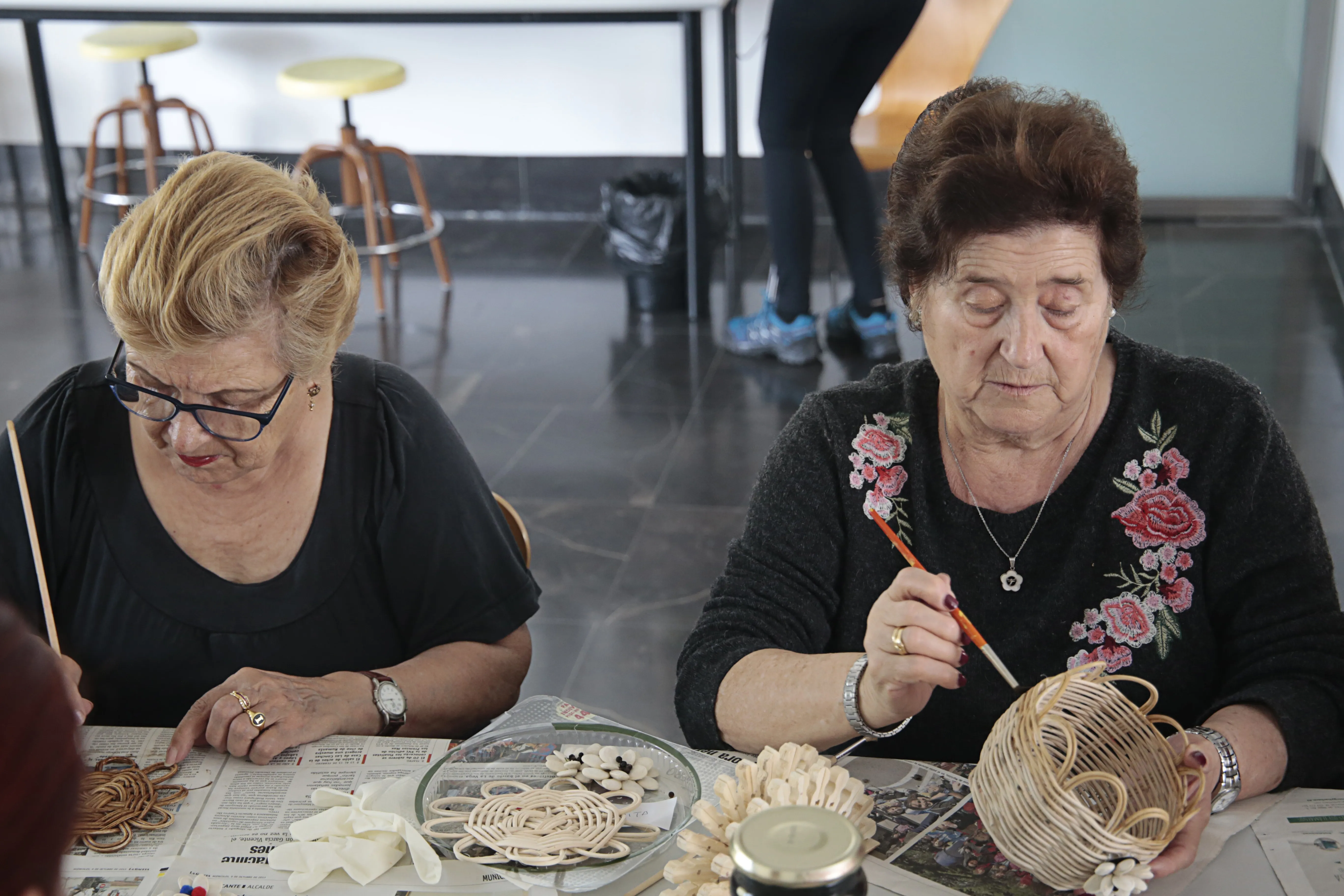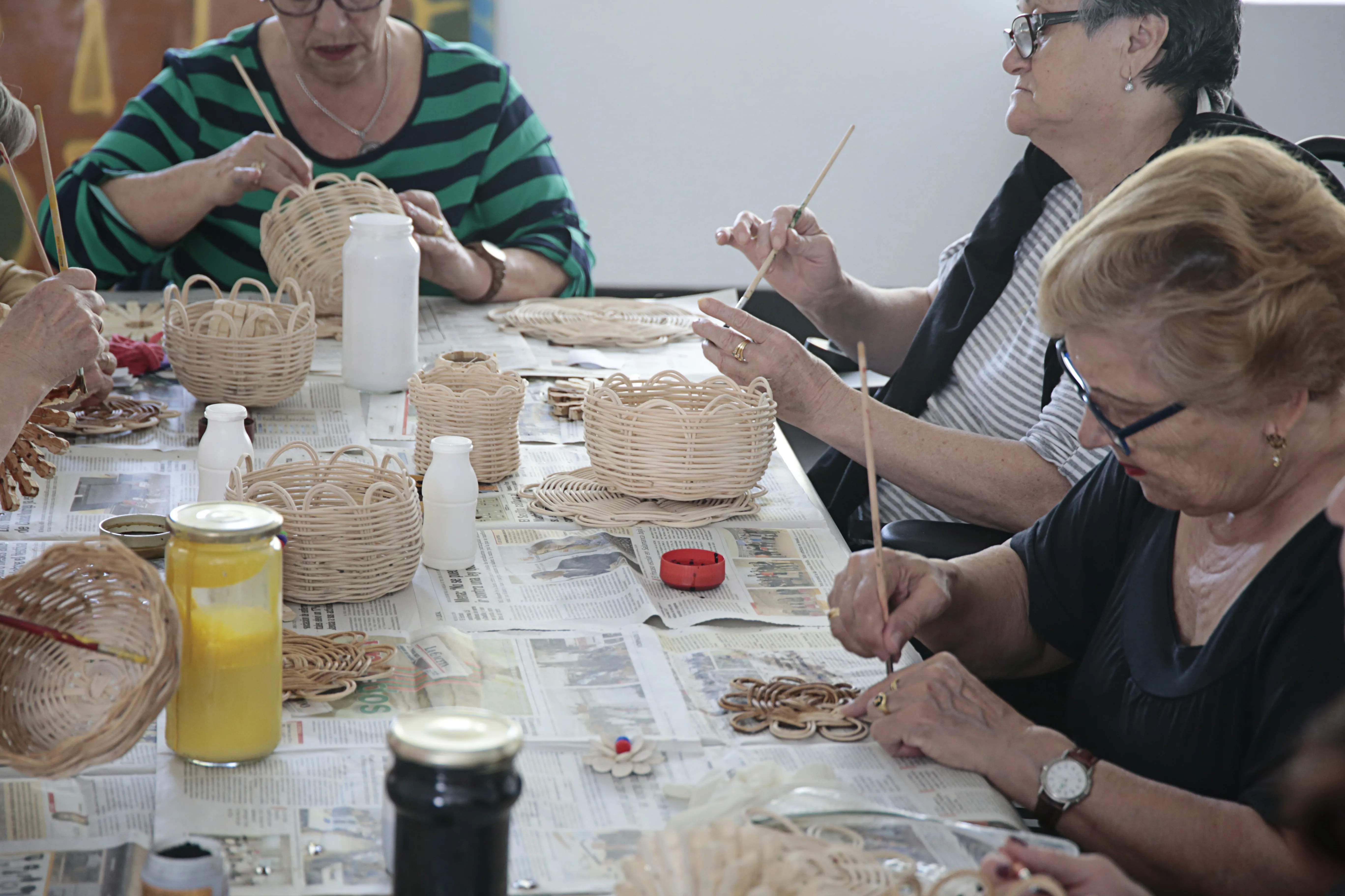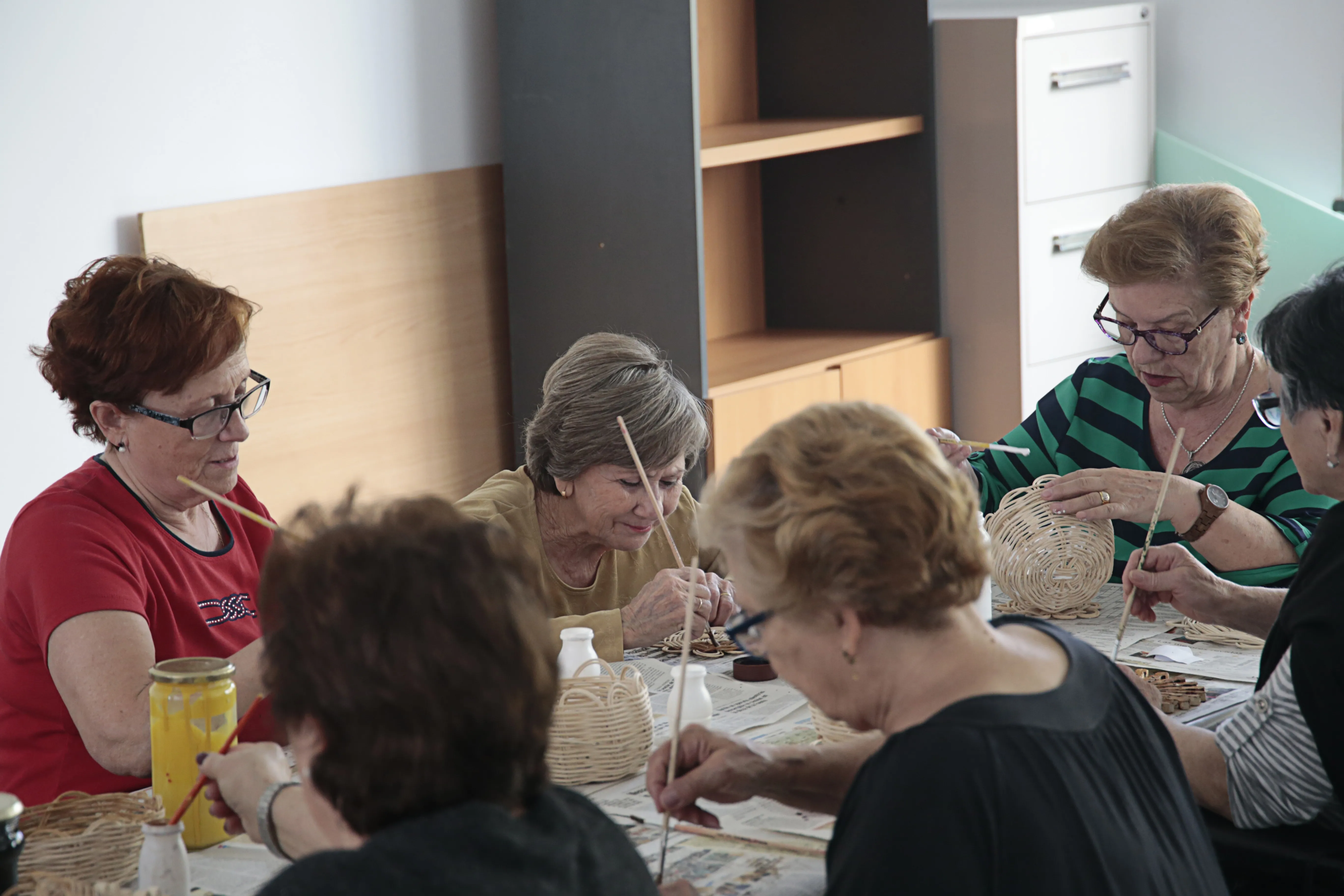 En este taller de manualidades participan alrededor de una docena de mujeres a las que se les suministra todo el material necesario para sus creaciones. Servilleteros con pinzas, prendedores con una flor hecha con pipas de calabaza, carpetas de cartón o pequeños cestos realizados con mimbre son algunos de los trabajos que las mujeres han elaborado en estos meses y que muestran con orgullo.