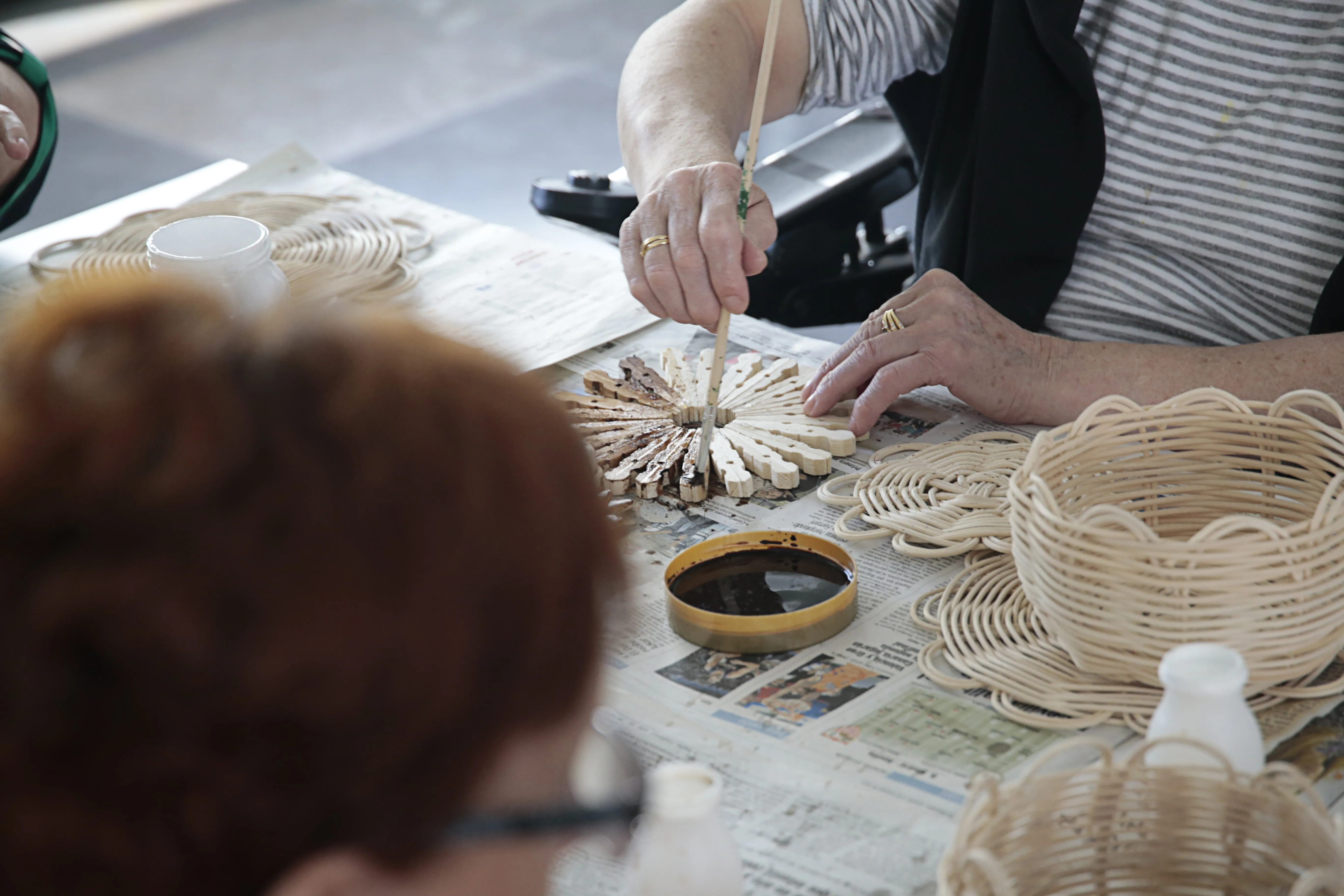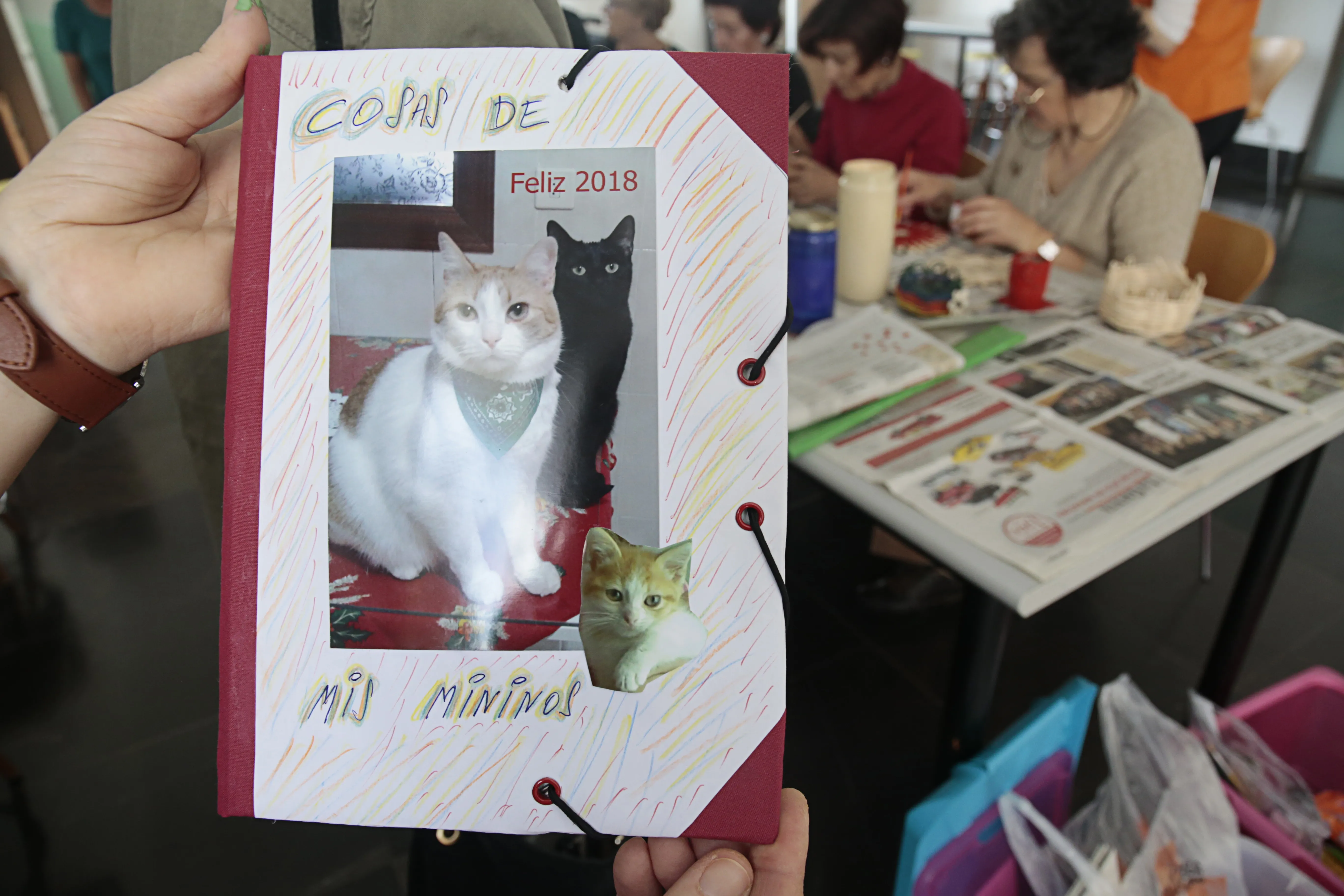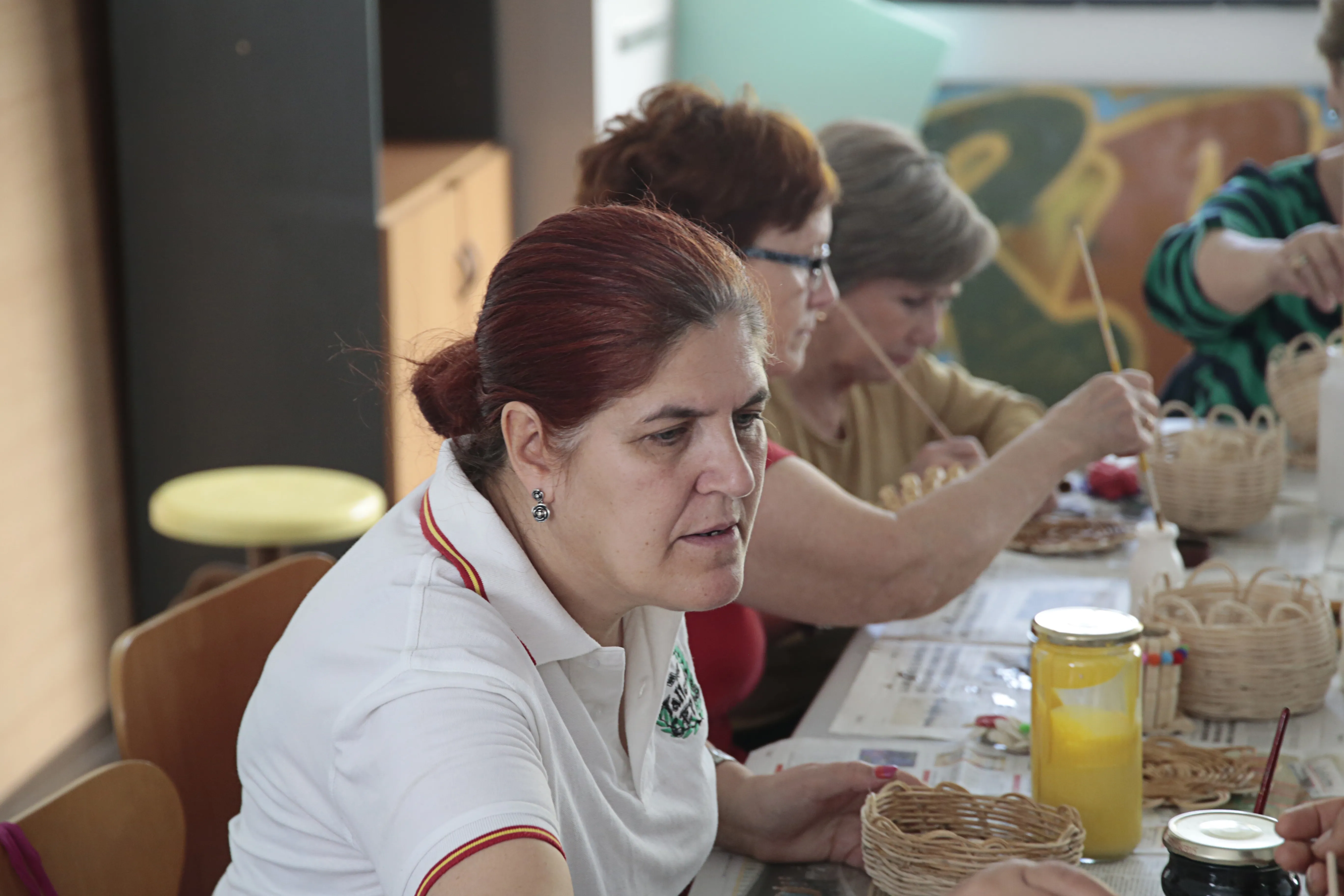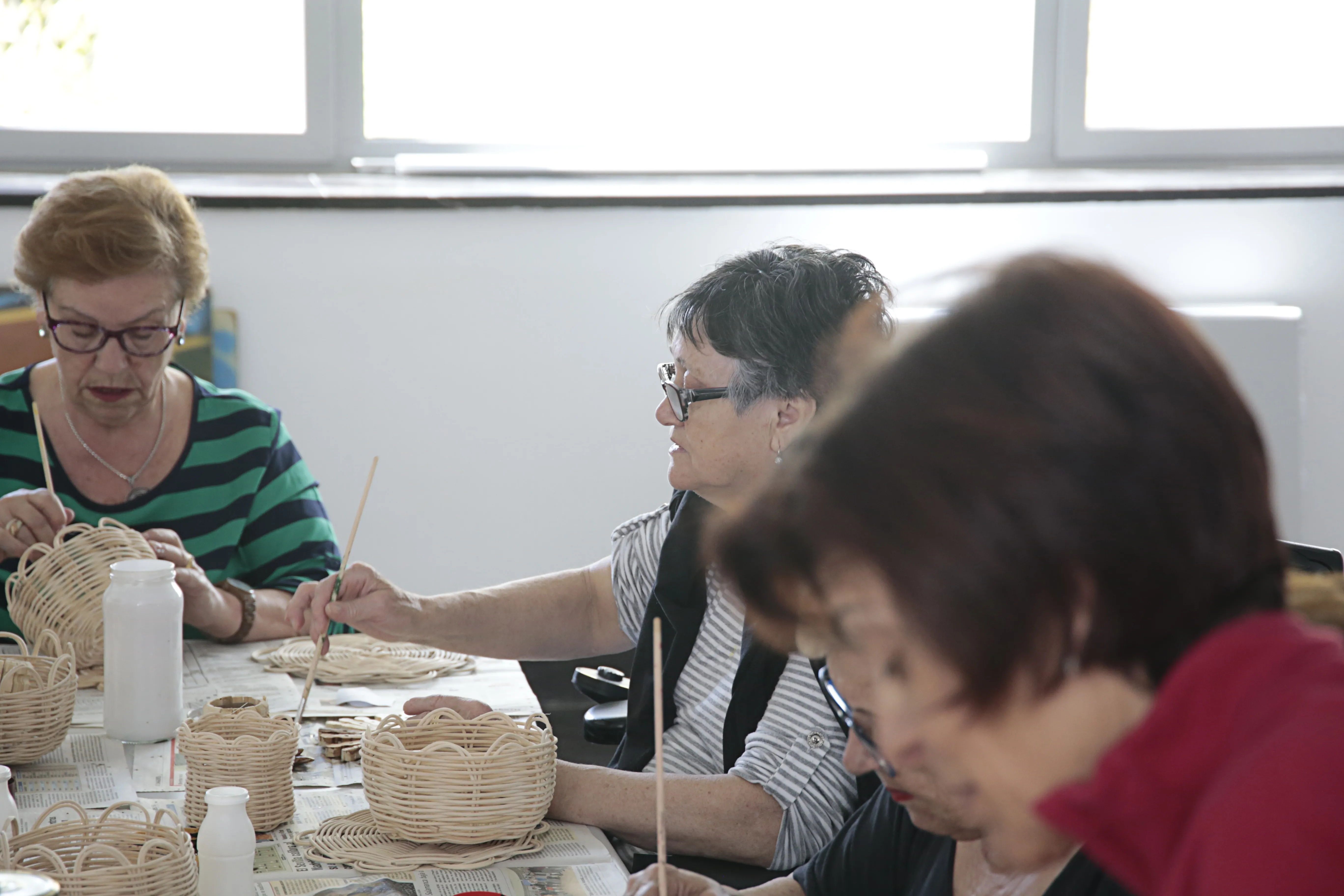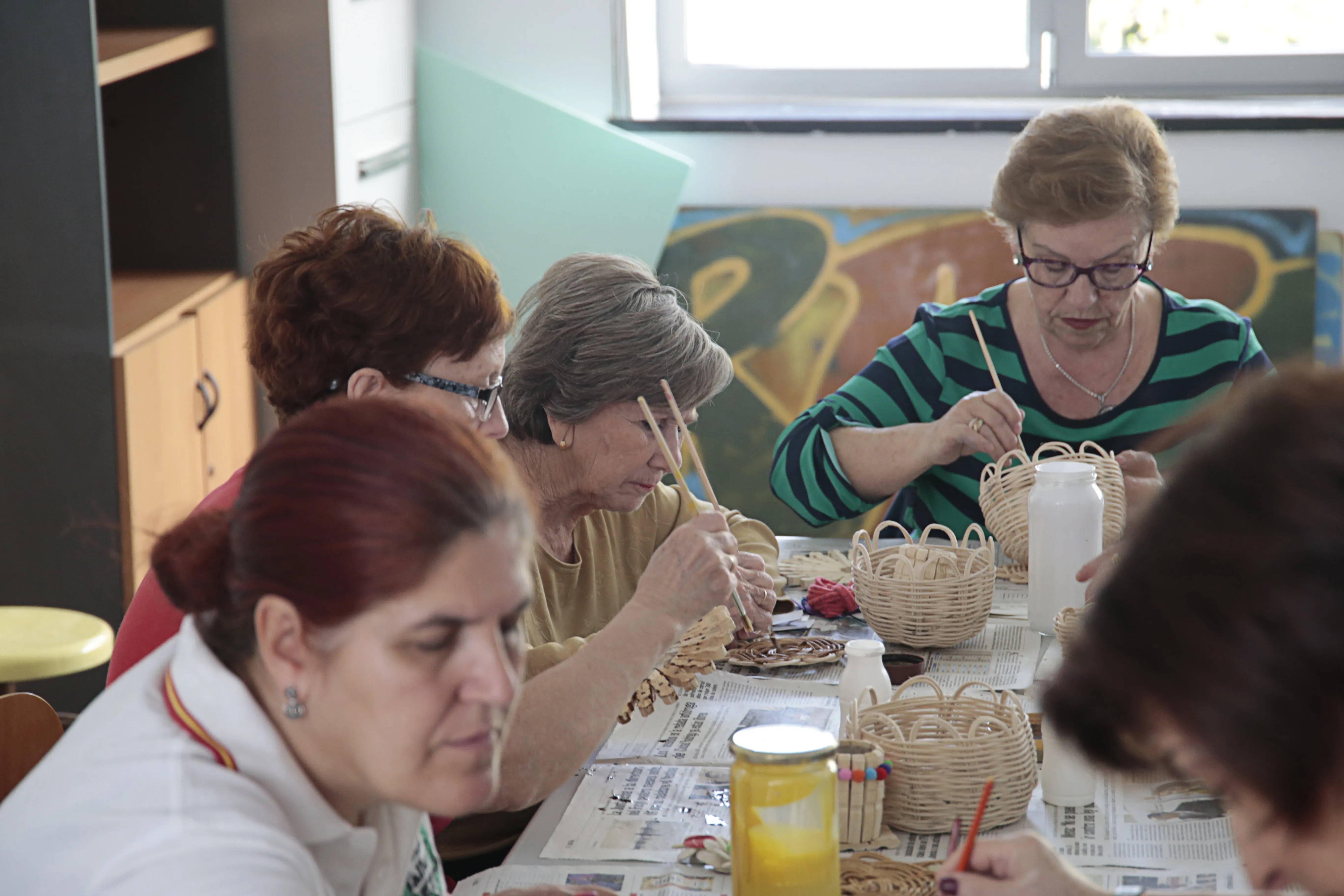 En este taller de manualidades participan alrededor de una docena de mujeres a las que se les suministra todo el material necesario para sus creaciones. Servilleteros con pinzas, prendedores con una flor hecha con pipas de calabaza, carpetas de cartón o pequeños cestos realizados con mimbre son algunos de los trabajos que las mujeres han elaborado en estos meses y que muestran con orgullo.