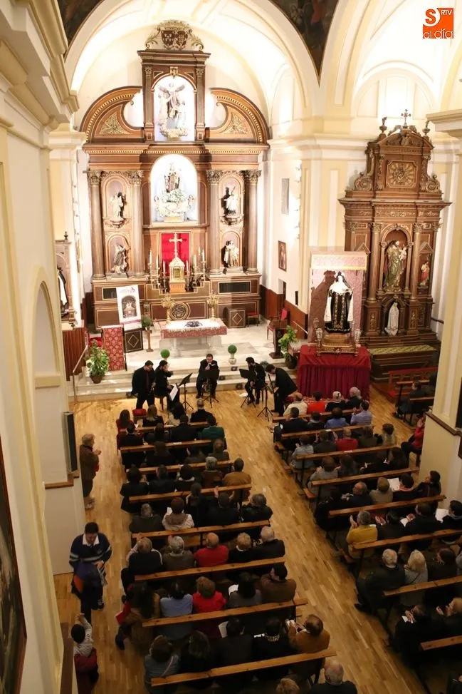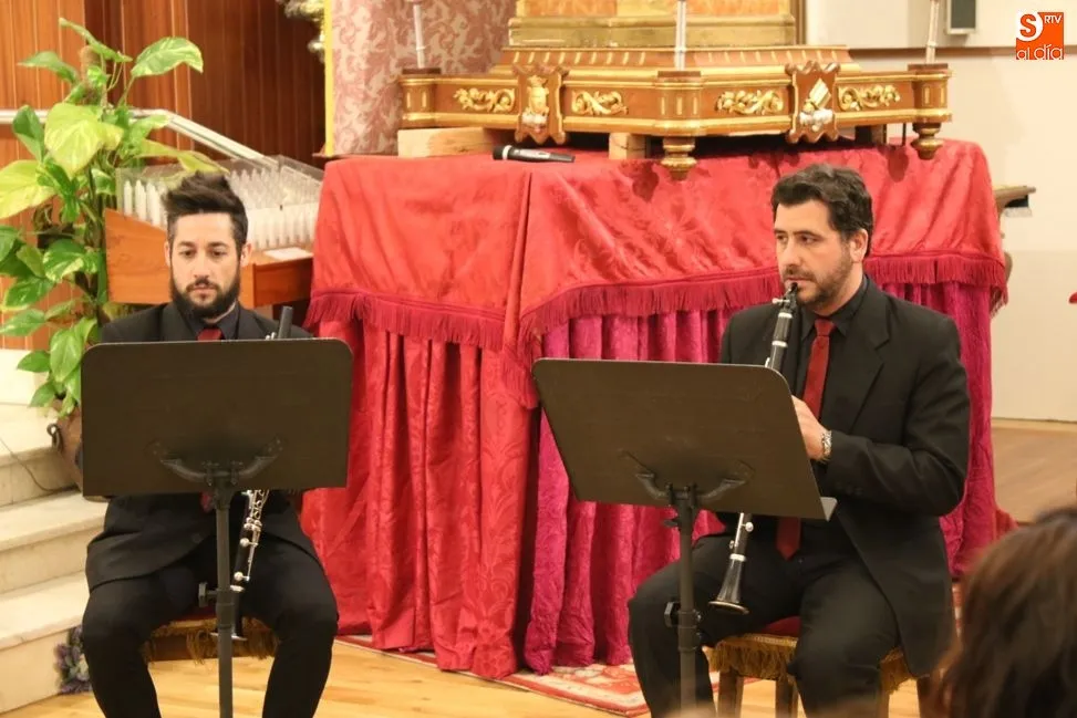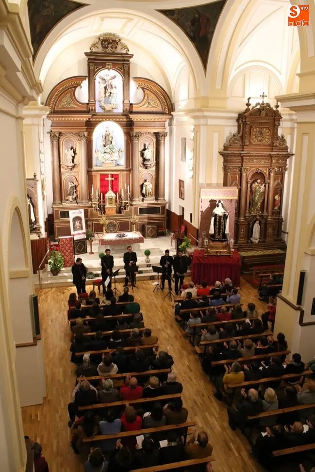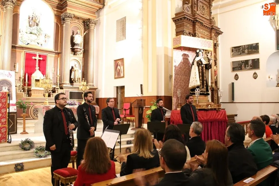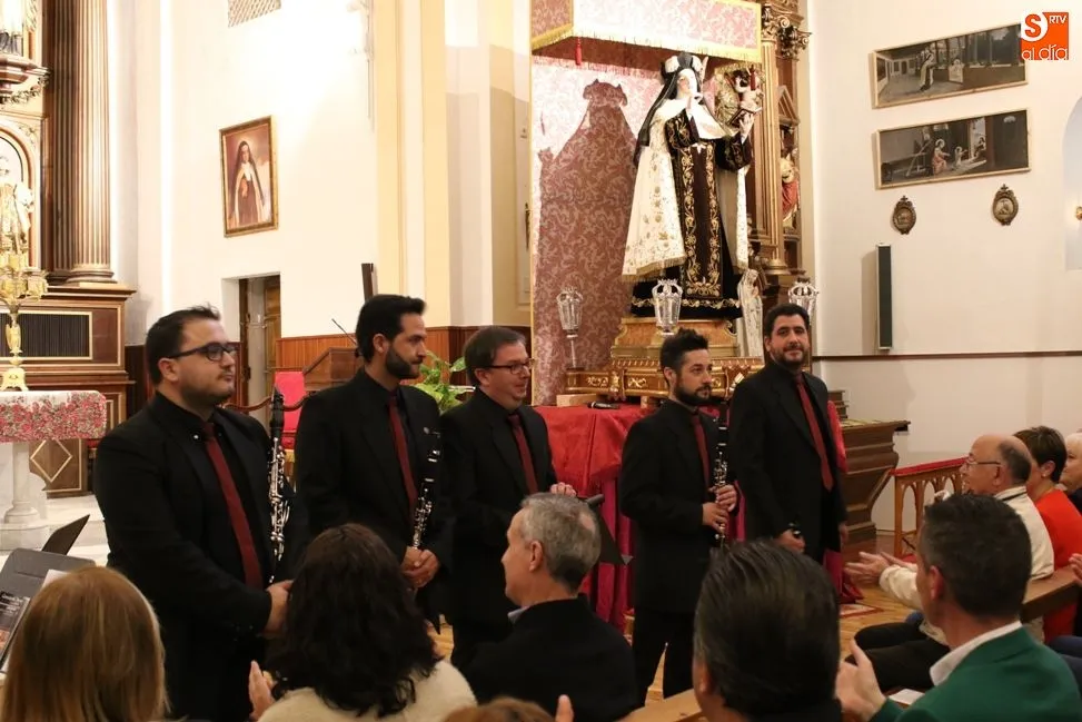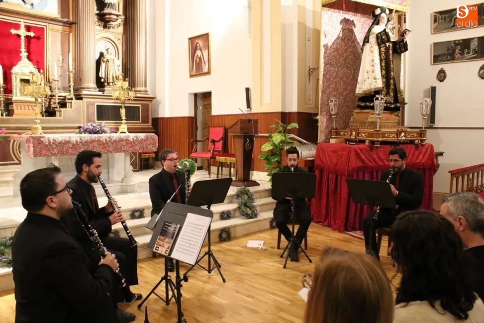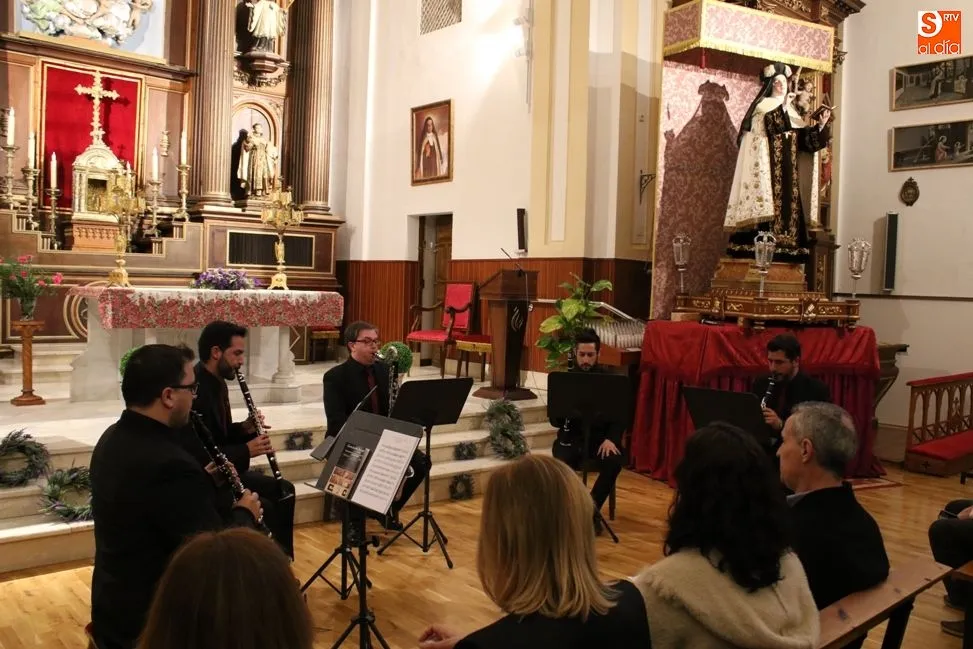 El quinteto de clarinetes 'Évano' deleitó durante algo más de una hora al público que llenó de principio a fin los bancos de la iglesia de San Juan de la Cruz. El quinteto, compuesto por cinco músicos pertenecientes a la Banda de Música de Alba de Tormes, fue una apuesta cultural de los carmelitas y sirvió para estrenar oficialmente la reforma del claustro del siglo XVII y de otras dependencias que forman el convento.