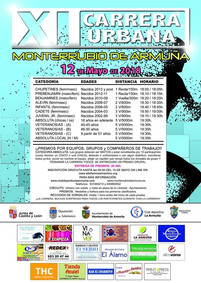 La XI Carrera Urbana de Monterrubio de Armuña se incluye en el V Circuito Provincial de Carreras Populares de la Diputación de Salamanca y es una de las más rápidas de categoría verde, según ha explicado Casimiro Blanco. Las pruebas en las categorías inferiores comenzarán a las 18.00 horas y la carrera absoluta se iniciará a las 19.30 horas para recorrer un total de 5 kilómetros.