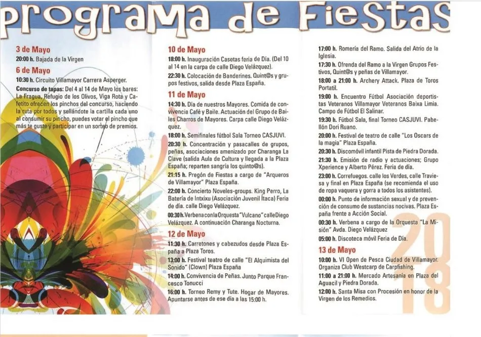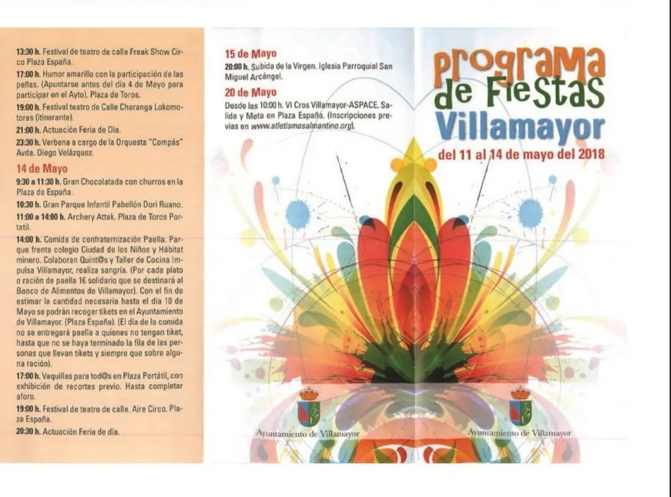 Las fiestas arrancarán el 10 de mayo con la inauguración de las casetas de la Feria de Día y con la colocación de banderines por parte de los quintos. El pregón se mantiene en la Plaza de España y estará protagonizado el viernes, 11 de mayo, por los integrantes del Club Arqueros de Villamayor. Ese mismo día tendrá lugar la tradicional comida de los mayores y se celebrará también el concierto de grupos noveles tras la buena acogida del año pasado.