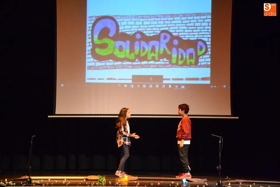 Escolares de Miróbriga y comarca se unen en un festival solidario de artes escénicas   | Imagen 1El evento tenía como finalidad que los involucrados en el mismo sintiesen como suyas las necesidades de los demás, aunque estén muy alejados. Para ello se contó como hilo conductor con dos jóvenes (alumnos de Misioneras-Santa Teresa), que se metieron en la piel de un niño nicaragüense y otro español, quienes hablaron sobre las formas en las que se puede ayudar.