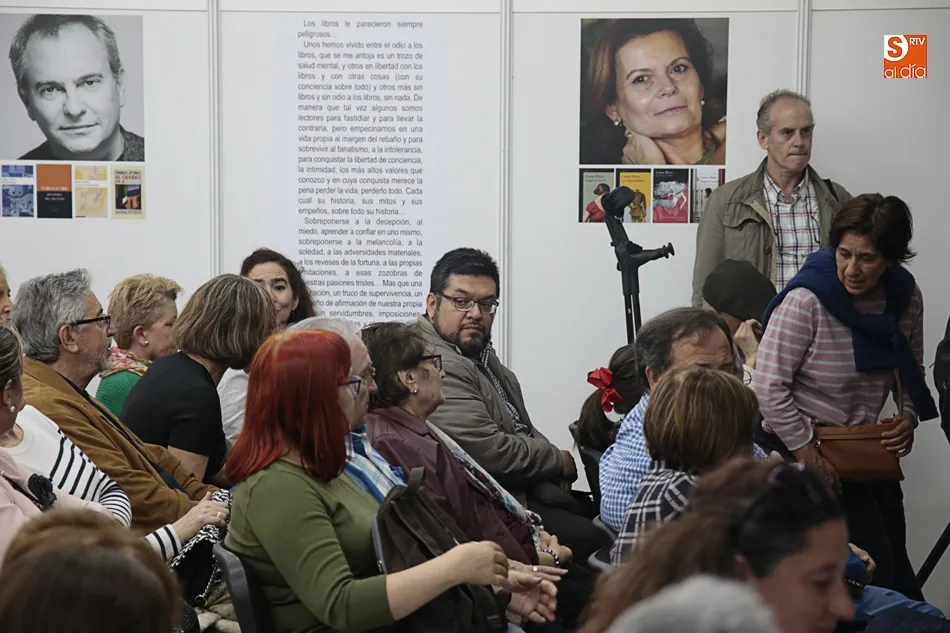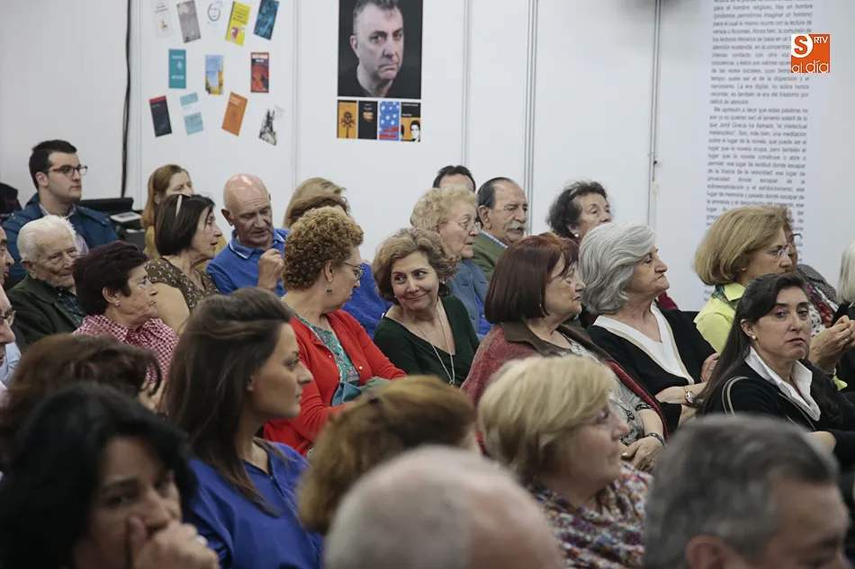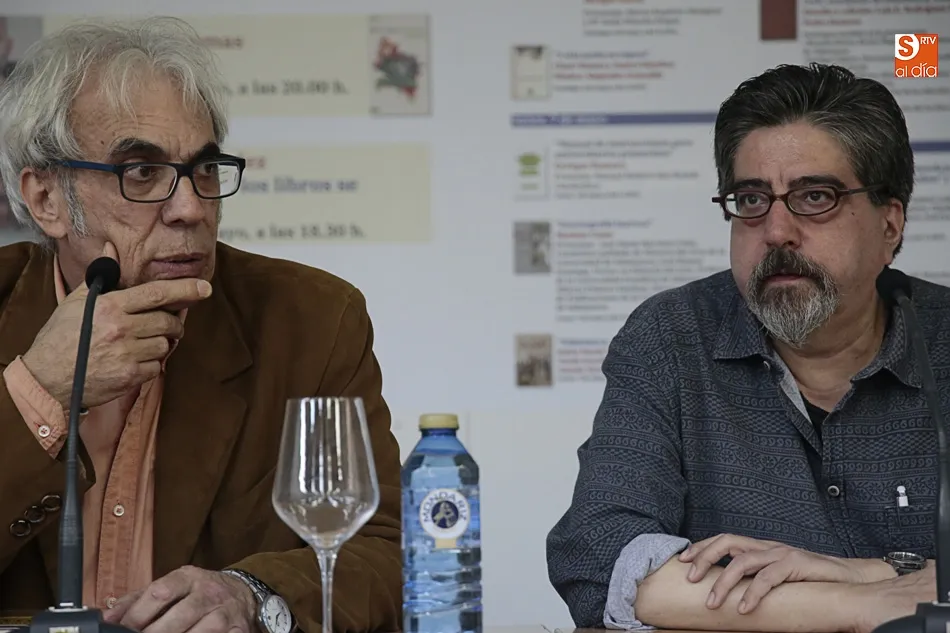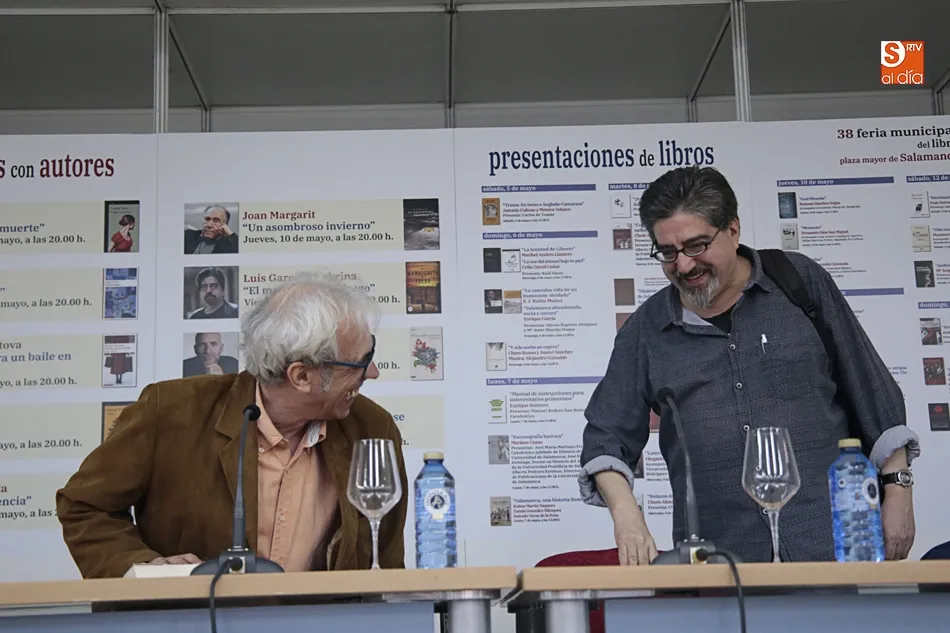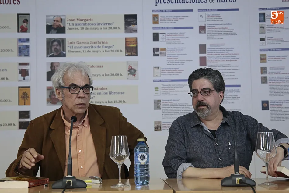 Encuentro que ha tenido su prolegómeno feliz en el encuentro con un Jambrina lector admirado y un Manuel Vilas al que presentó desde el reconocimiento y el rigor que tiene este profesor de la Universidad de Salamanca autor ya no de numerosas novelas y cuentos, sino de fecundos estudios literarios y de atinadas críticas literarias en el reconocido suplemento cultural del ABC. Un Jambrina entregado a la magia que estos días disfrutamos en esta nuestra, suya Plaza Mayor de Salamanca: Feria del Libro y Plaza Mayor son un binomio perfecto. Es una oportunidad también para que los autores y lectores se conozcan y conversen y los primeros puedan firmar y dedicar sus libros. En mi caso, me ha hecho mucha ilusión conversar con Manuel Vilas, el autor de Ordesa, al que tanto admiro; y presentar, a mi vez, El manuscrito de fuego, que tanto habla de Salamanca y de su glorioso pasado. Y, sobre todo, hacerlo de la mano de José Antonio Sánchez Paso, que tanto me ha ayudado a construir y revisar esta novela, sobre todo en lo relativo a ese gran personaje que es don Francés de Zúñiga".