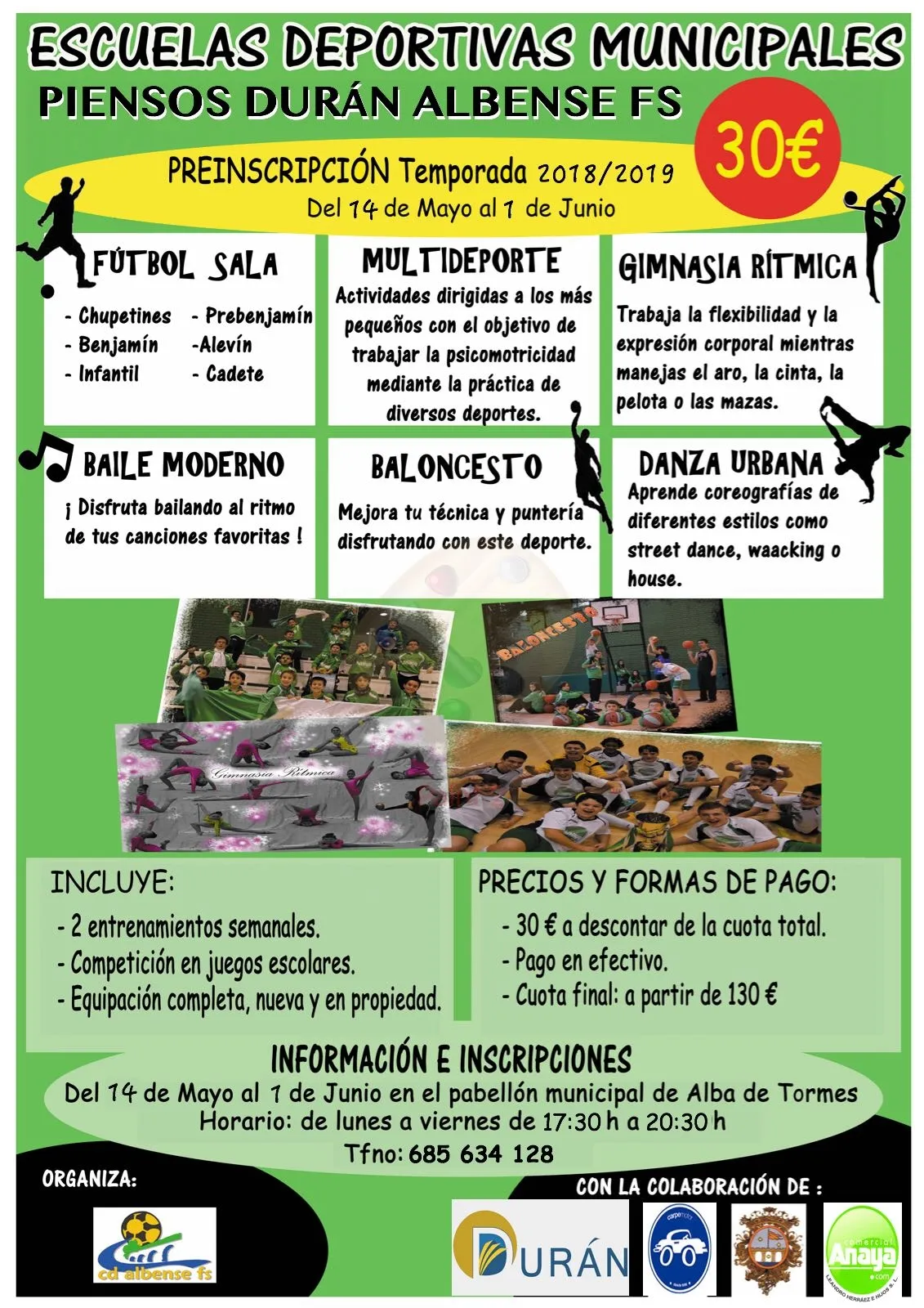 Las preinscripciones de las Escuelas Piensos Durán Albense para la temporada 2018/2019 ya están abiertas. Desde el pasado 14 de mayo y hasta el próximo 1 de junio, todo aquel niño o niña de entre 3 y 18 años que desee formar parte de cualquiera de las modalidades deportivas (fútbol sala, multideporte, gimnasia rítmica, baile moderno, baloncesto o danza urbana) que oferta el club podrá formalizar su preinscripción en las oficinas del club situadas en el pabellón municipal.