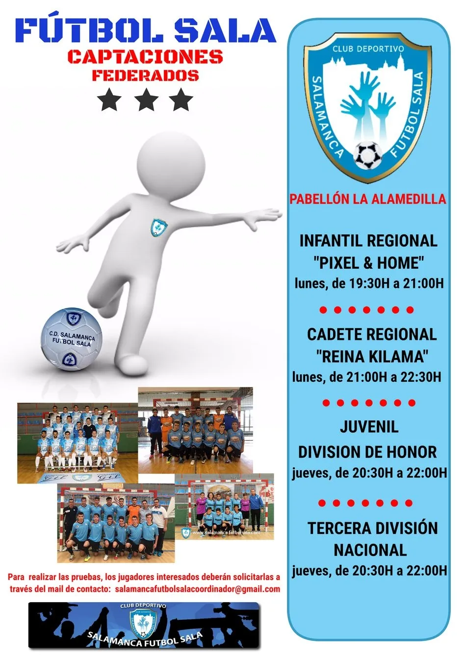 Los interesados deben mandar un correo solicitando la prueba al mail salamancafutbolsalacoordinador@gmail.com y el club les responderá en la máxima brevedad indicando día y hora de dicha prueba.