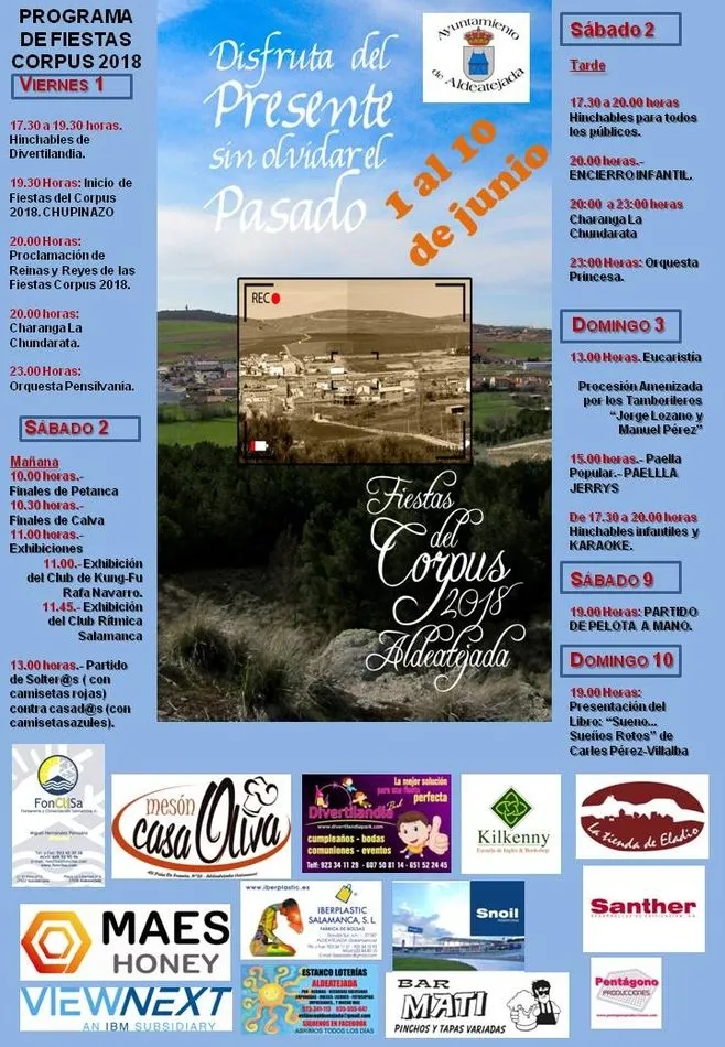 El Ayuntamiento de Aldeatejada tiene ya todo preparado para celebrar las fiestas del Corpus del 1 al 3 de junio, aunque las actividades festivas se prolongarán hasta el 10 de junio, ya que para ese fin de semana se ha programado un partido de pelota a mano y la presentación de un libro.