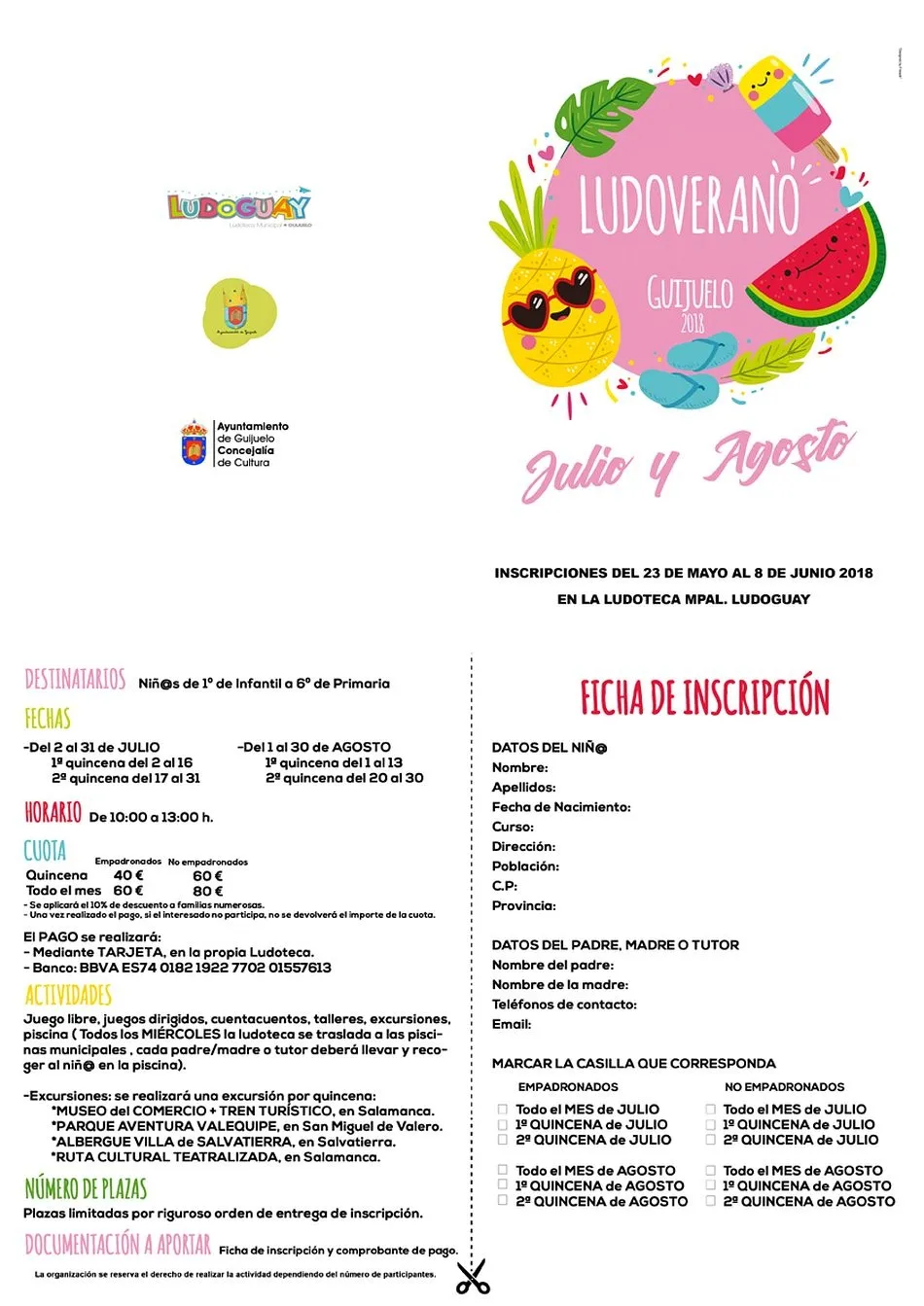 El Ludoverano también abre el plazo de inscripción el próximo miércoles, 23 de mayo y su celebración será del 2 de julio hasta el 30 de agosto. Los más pequeños disfrutarán de los juegos habituales y excursiones al Museo del Comercio y paseo en tren turístico en Salamanca, al parque multiaventura ?Valequipe? de San Miguel de Valero, al Albergue de Salvatierra de Tormes y a hacer una ruta cultural teatralizada por la capital charra. Las inscripciones se pueden hacer por quincenas y los precios, para empadronados varían entre los 40 euros por 15 días y los 60 del mes completo.