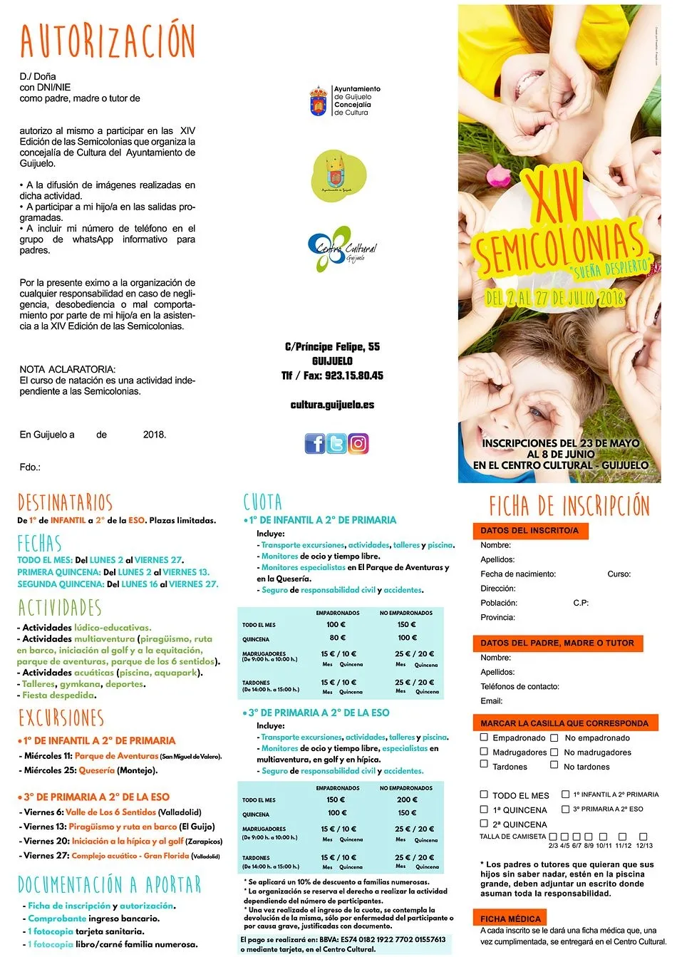 Las XIV Semicolonias se celebrarán del 2 al 27 de julio. Este año como en 2017 se mantendrá la diferenciación de edades y se realizará una programación concreta para los escolares de 1º de Infantil a 2º de Primaria que podrán disfrutar de dos excursiones al parque de Aventuras de San Miguel de Valero y a la quesería de Montejo, además de las actividades lúdico-educativas habituales. Para este grupo de edad, los precios varían entre los 80 euros para una quincena a los 100 euros del mes completo para empadronados, mientras que el precio se incrementa en el caso de los nos empadronados. Para los mayores, los escolares de 3º de Primaria a 2º de la ESO, el abanico de actividades se amplía y contarán con dos excursiones en cada quincena. Las inscripciones tendrán lugar del 23 de mayo al 8 de junio.