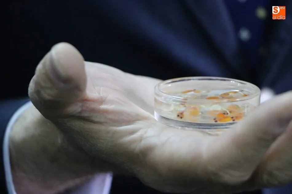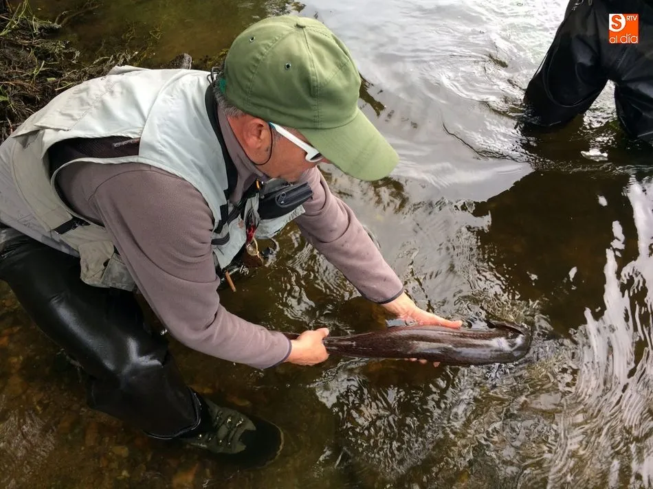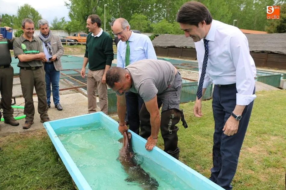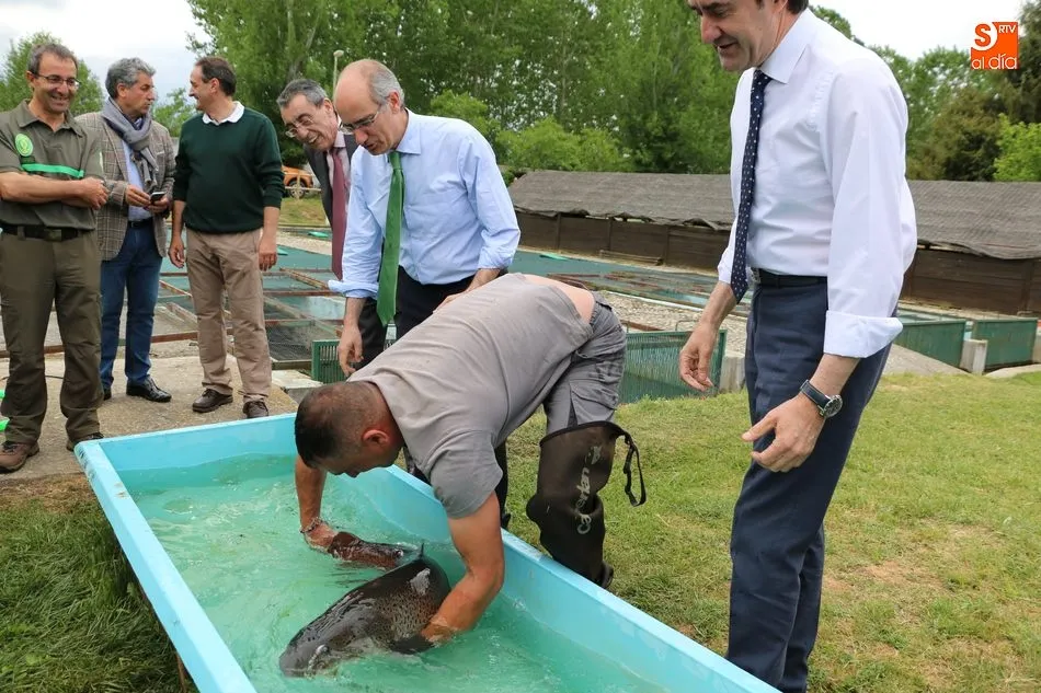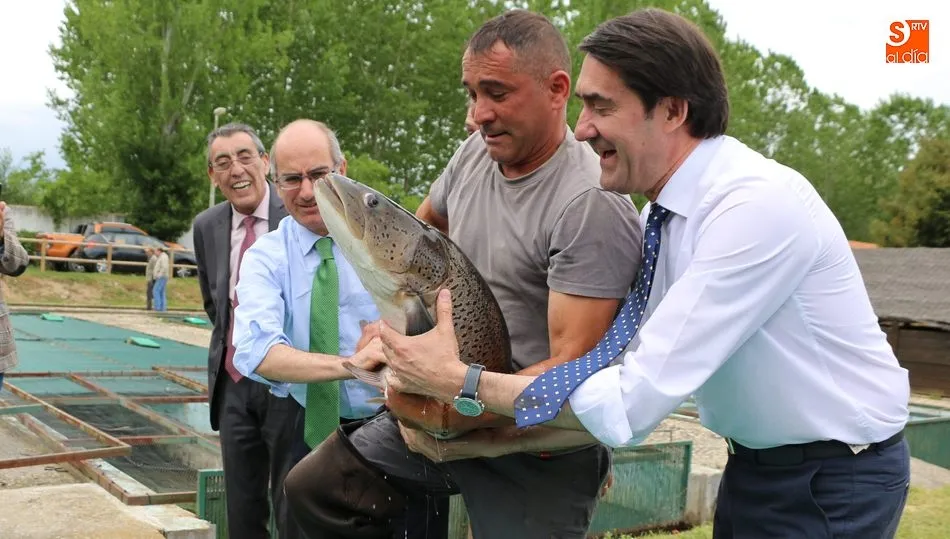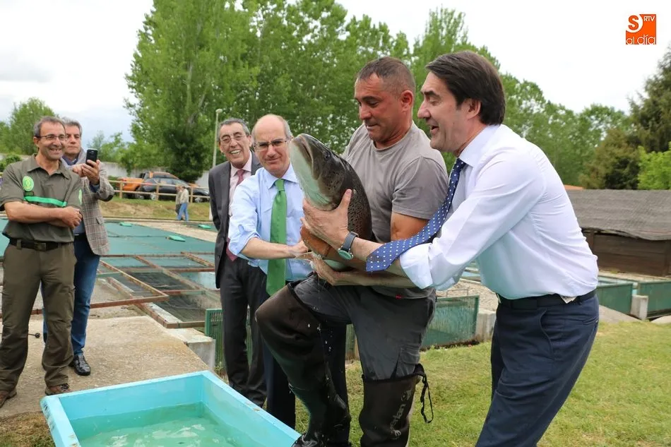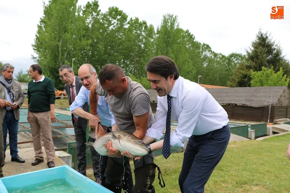 Tras observar el proceso de cría de larvas de salmón y de otras especies, Suárez-Quiñones e Iglesias no quisieron desaprovechar la oportunidad de tener entre sus manos un gran salmón del Danubio criado en aguas del Tormes, aunque no fue fácil. Como recordó el consejero, en referencia a Carlos Mondejar, responsable del ICONA en Salamanca hace 50 años, ?que a alguien en 1968 se le ocurriera traer salmón del Danubio, fue una idea curiosa para promover la pesca deportiva?. Asimismo, Suárez-Quiñones destacó el trabajo ?extraordinario? del personal de la piscifactoría de Galisancho al ayudar a la reproducción natural con repoblaciones de ?unos 6.000 ejemplares al año de distinto tiempo de crecimiento, lo que garantiza que este pedazo de salmón se encuentre en un extraordinario estado de salud?.