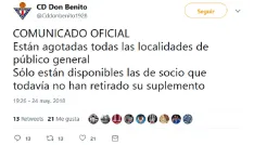 El CD Don Benito comunicaba hace unos minutos a través de su cuenta oficial de twitter que las entradas para el encuentro del próximo domingo ante Unionistas, correspondiente a la vuelta de la eliminatoria por el ascenso a Segunda B, se habían agotado, por lo que sólo quedaban las de los socios del club pacense que no habían retirado su suplemento.