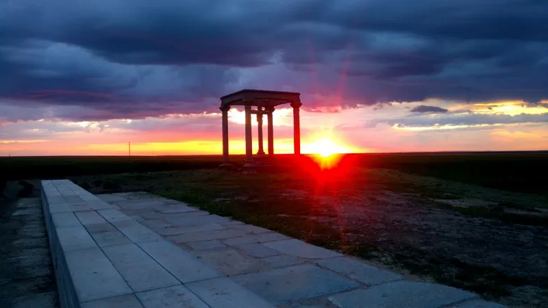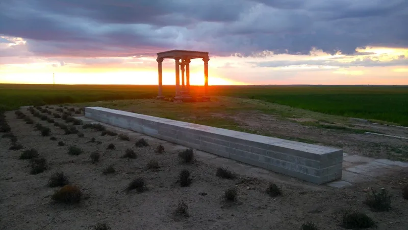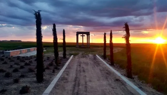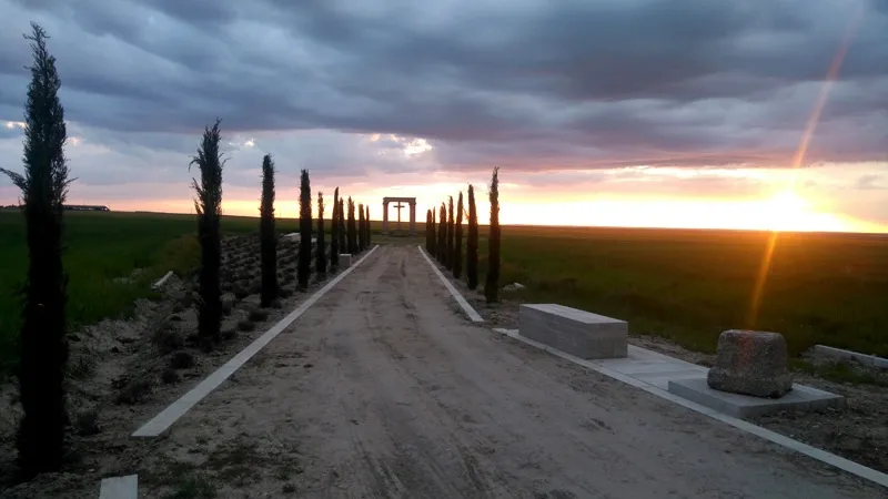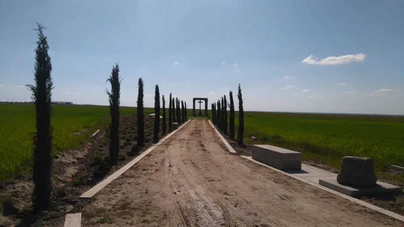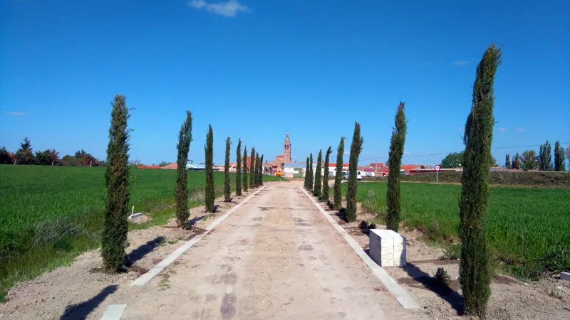 ormación de un camino terroso paralelo a la carretera, marcado con bordillos y flanqueado por cipreses que van indicando una línea visual de ida y vuelta que enmarca la vista del monumento y la iglesia respectivamente.
