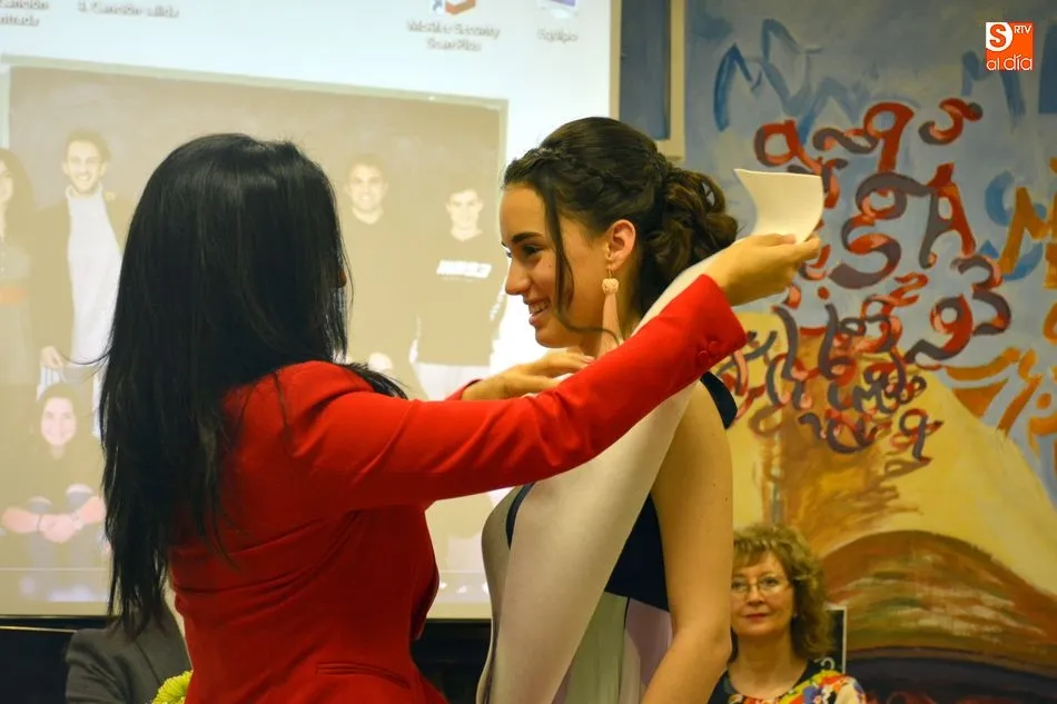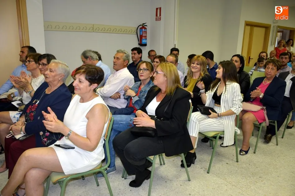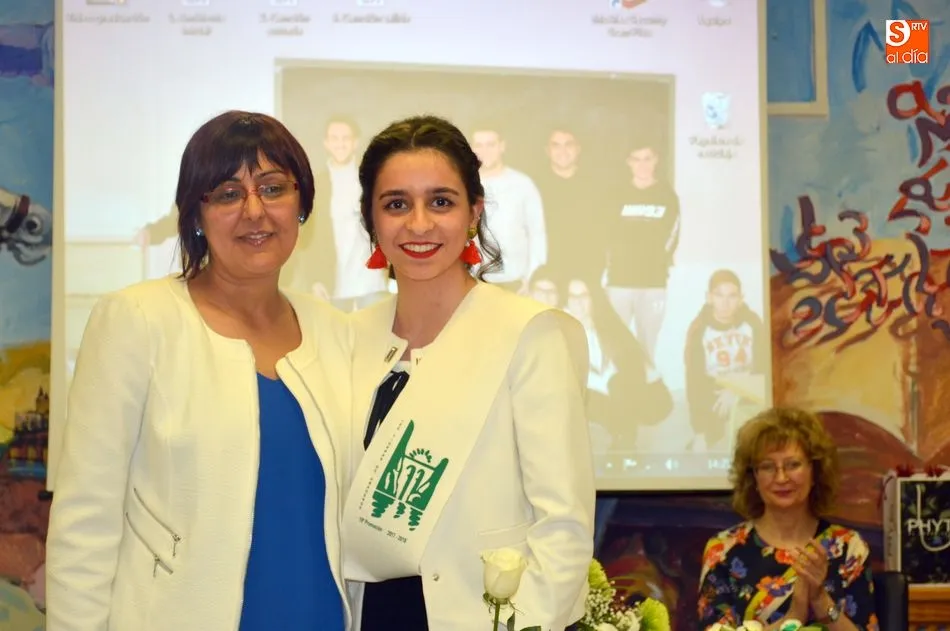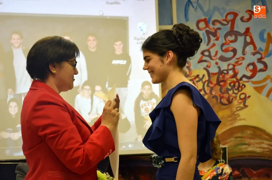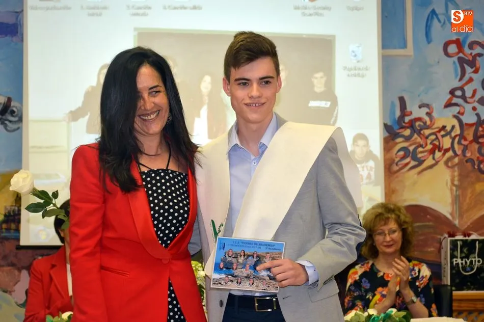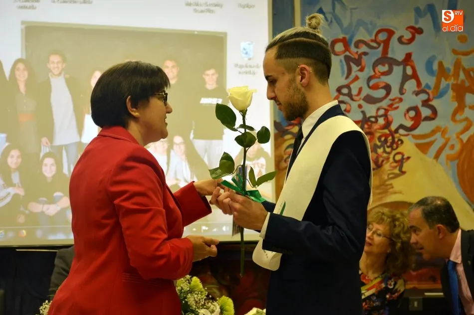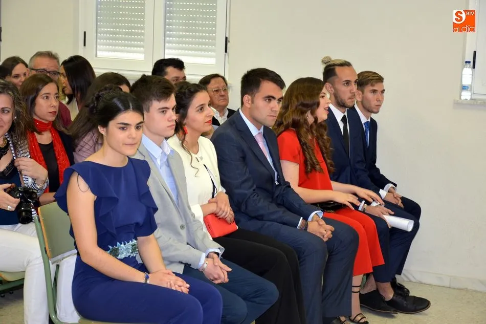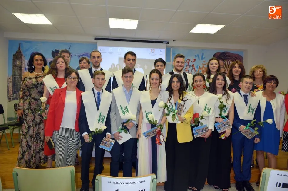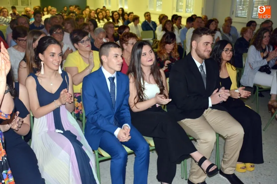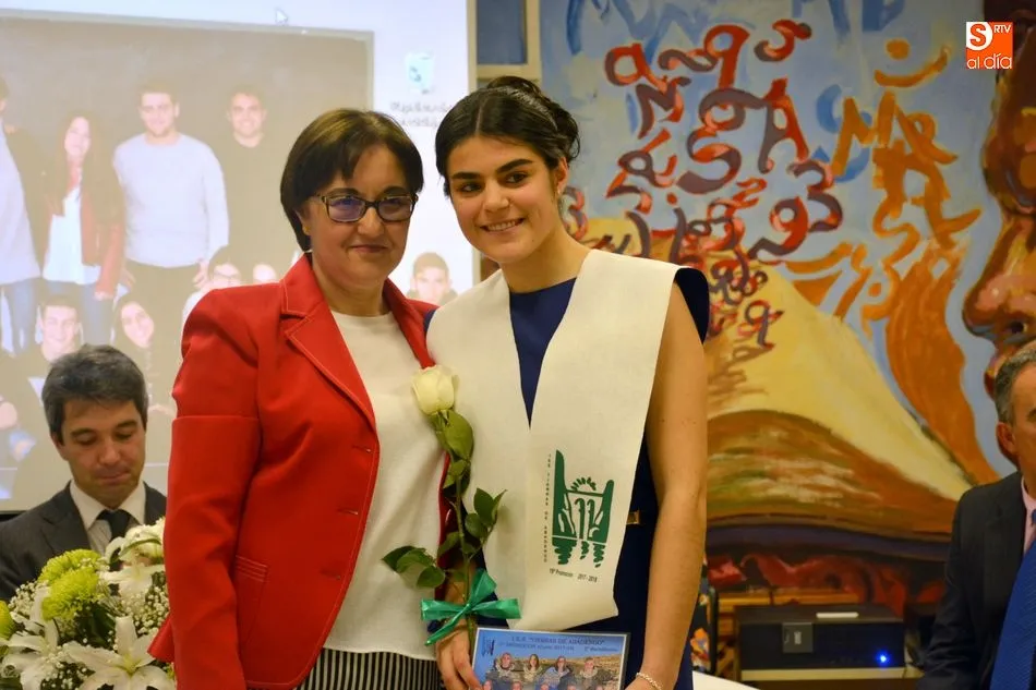 La emotividad se hizo patente en el salón del instituto desde el primer momento del acto de Graduación de la XIX Promoción de Alumnos del Tierras de Abadengo. La tutora del grupo de alumnos de 2º de bachiller, Jennifer Gómez, fue despidiendo uno a uno a sus alumnos, desgranando, con gran emoción, recuerdos, anécdotas y sentimientos surgidos en horas y horas de convivencia en el centro escolar. La profesora de inglés recibió un ramo de flores y una foto como recuerdo de sus alumnos.