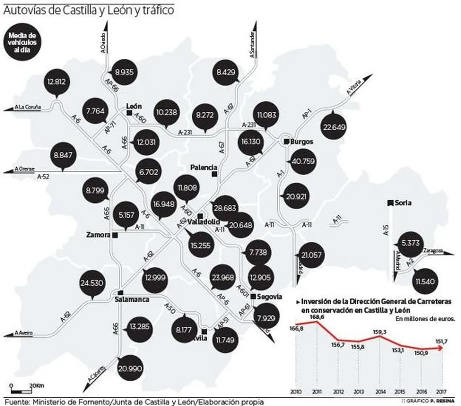 Los datos ofrecidos por el Ministerio de Fomento sitúan ese gasto en conservación de su red de carreteras (autovías y nacionales) en Castilla y León, entre 2010 y 2017, en 1.263,23 millones de euros, a razón de 158 millones de media anual. Desde este departamento diagnostican ?el uso y el paso del tiempo?, con el efecto acelerante de las lluvias continuadas y la nieve, como las causas del deterioro de las calzadas y añaden que están previstos proyectos de reestructuración de firmes en las autovías de la Plata, de Castilla y de la Meseta. Esa reestructuración, que se plantea tras años de un mantenimiento casi nulo para la envergadura de estas infraestructuras, costará de media 470.000 euros por kilómetro en la A-66 (incluye las dos calzadas) y entre 300.000 y 350.000 euros en el caso de la A-62 y la A-67.