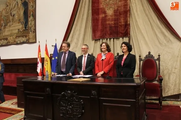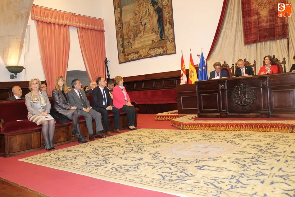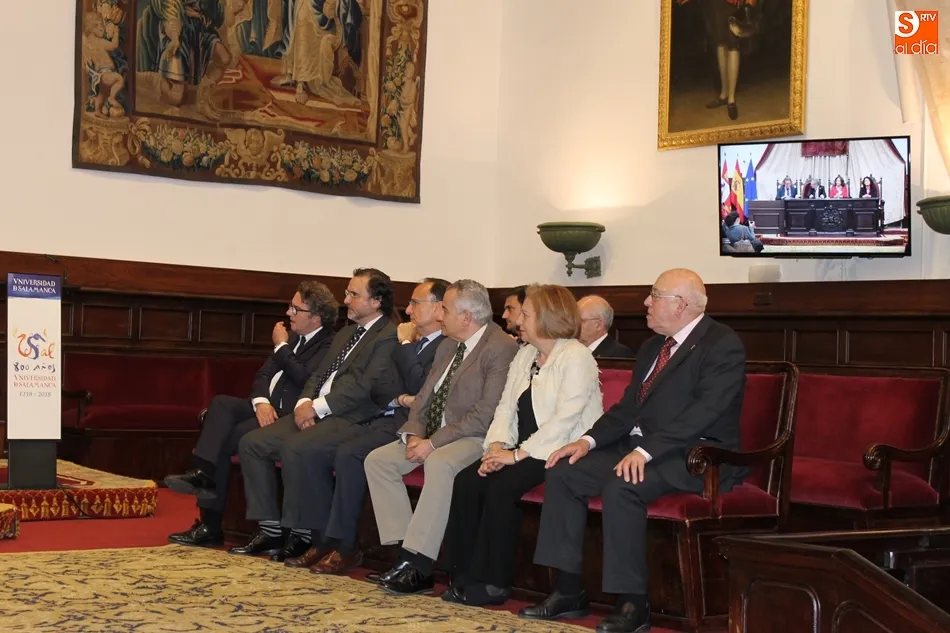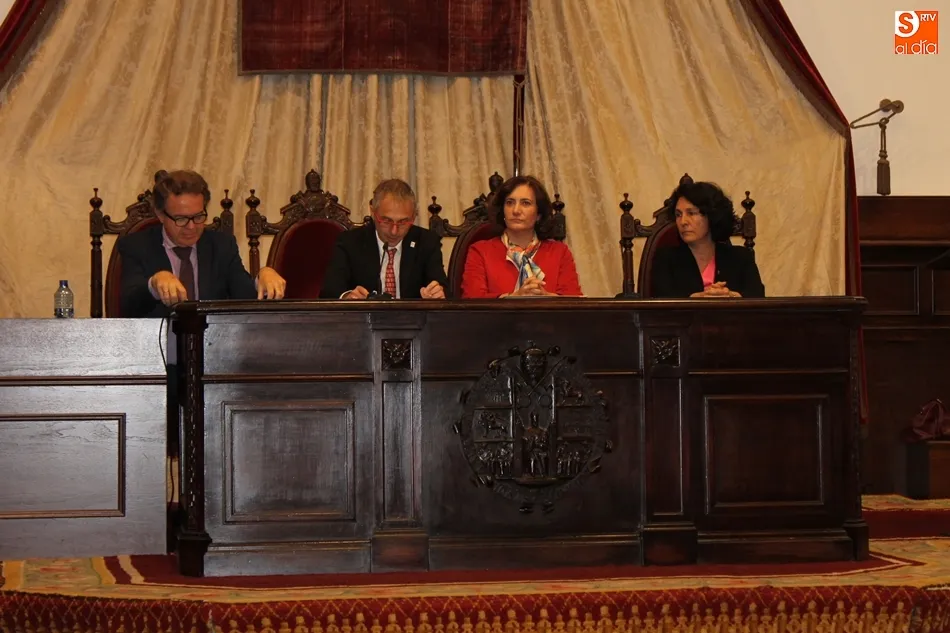 El rector de la Universidad de Salamanca, Ricardo Rivero; la consejera de Cultura y Turismo de la Junta de Castilla y León, Josefa García Cirac; el director de Bellas Artes y Patrimonio Cultural, Luis Lafuente, y la delegada del Consejo Superior de Investigaciones Científicas en Castilla y León, Mar Siles, han entregado este lunes en el Paraninfo los diplomas acreditativos de la inclusión en el Registro Internacional de la Memoria del Mundo de la Unesco a los bienes del Patrimonio Documental Español inscritos en el año 2017.