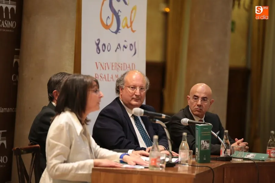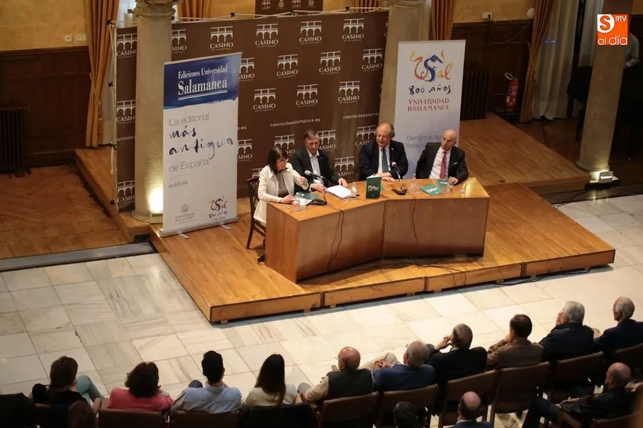 El vicerrector Enrique Cabero y el director de Publicaciones de la USAL, Ángel de las Heras, acompañaron al autor en el Casino de Salamanca, del que fue socio el protagonista de este trabajo