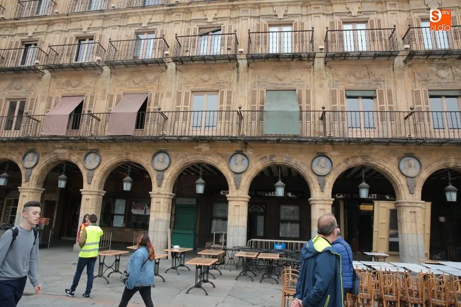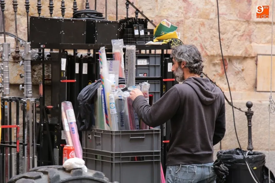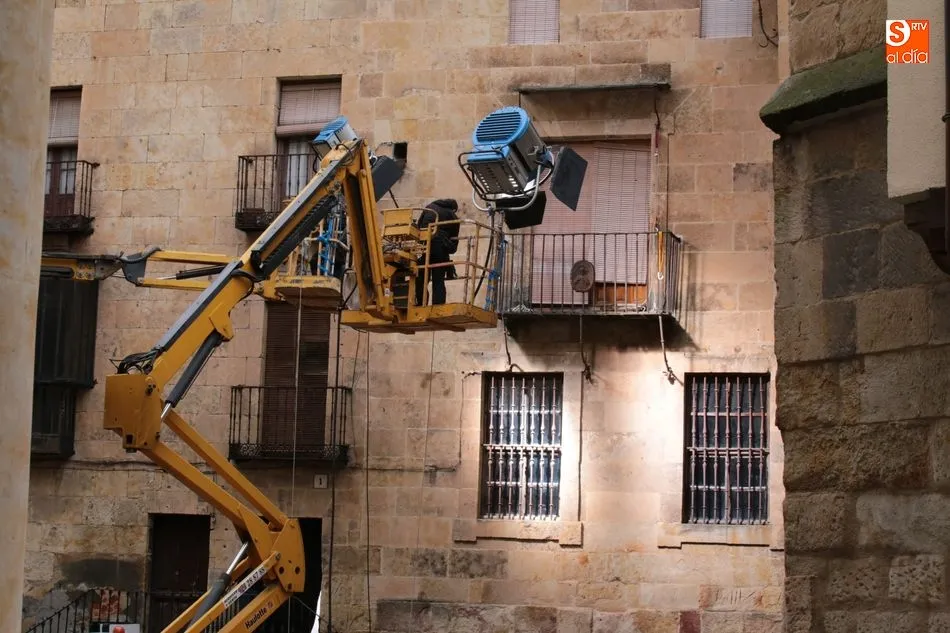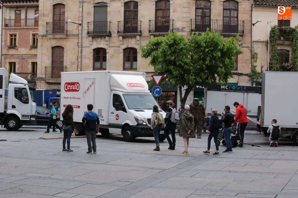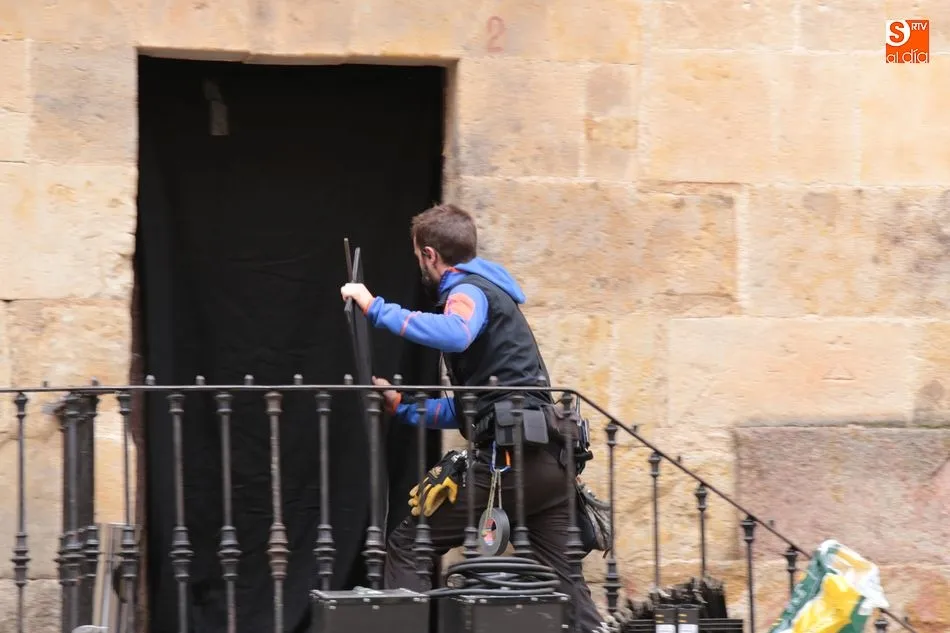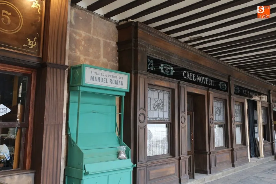 Por un lado, los operarios de la productora acondicionan los espacios del casco histórico elegidos como escenarios. Y, por otra parte, eso supone que haya elementos de otras épocas en lugares como la Plaza Mayor, con modificaciones en los balcones o la recreación del Café Novelty.