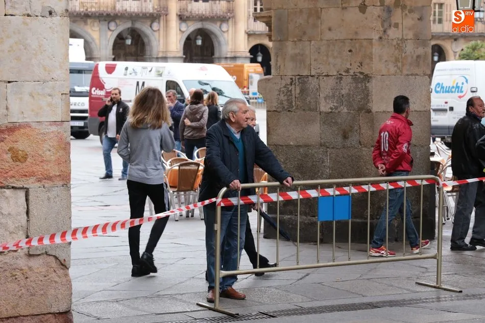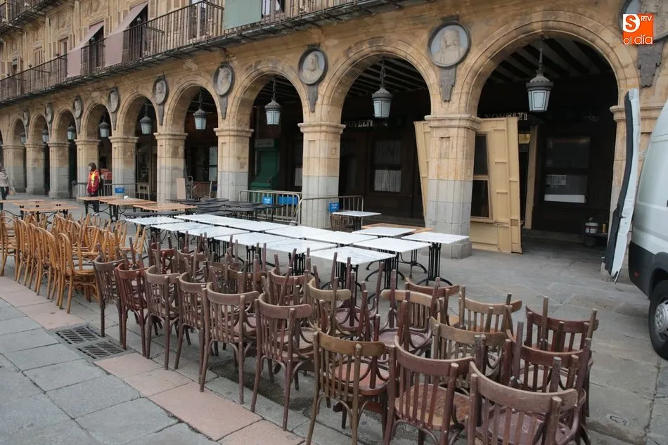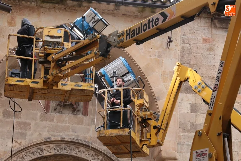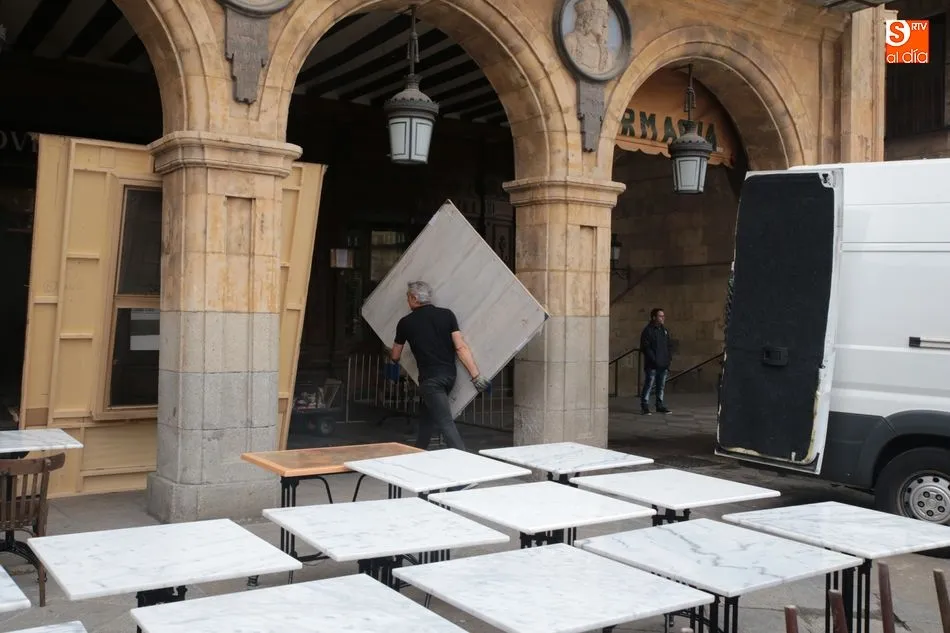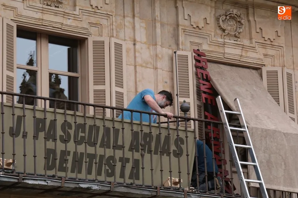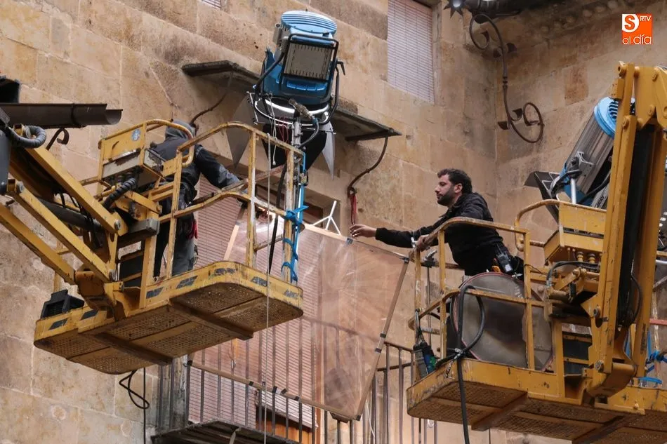 Por un lado, los operarios de la productora acondicionan los espacios del casco histórico elegidos como escenarios. Y, por otra parte, eso supone que haya elementos de otras épocas en lugares como la Plaza Mayor, con modificaciones en los balcones o la recreación del Café Novelty.
