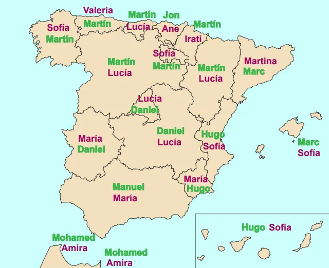Sin embargo, son nombres tradicionales los que se mantienen a la cabeza. En Salamanca, Carmen (4.894 y un 28,5 por mil), María (3.826), Teresa, Pilar e Isabel. Tampoco hay variaciones entre el nombre de los hombres con Manuel a la cabeza, (4.490 y un 27,6 por mil), Ángel, José, Antonio y Francisco siguen liderando los nombres. En Castilla y León los favoritos son Martín, Daniel, Hugo, Adrián, Diego y Pablo y, en niñas, Lucía, Paula, Valeria, Alba, Daniela y María.