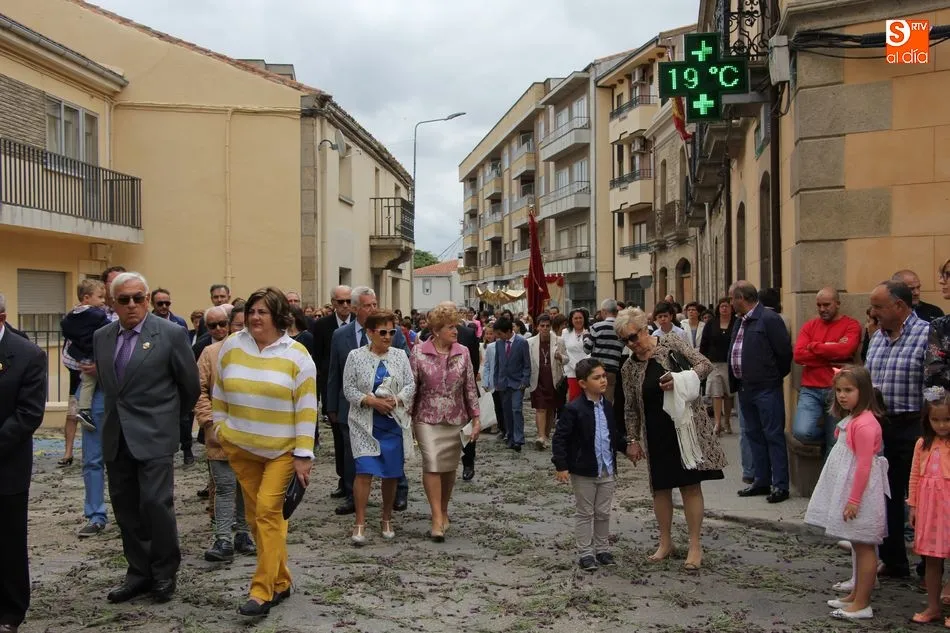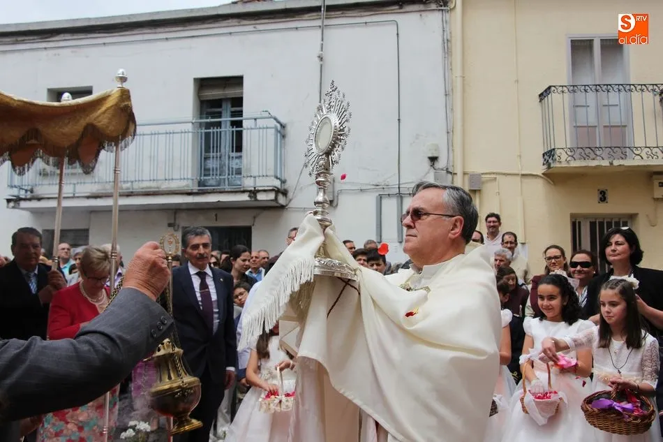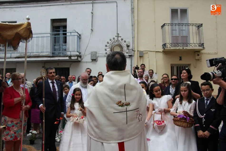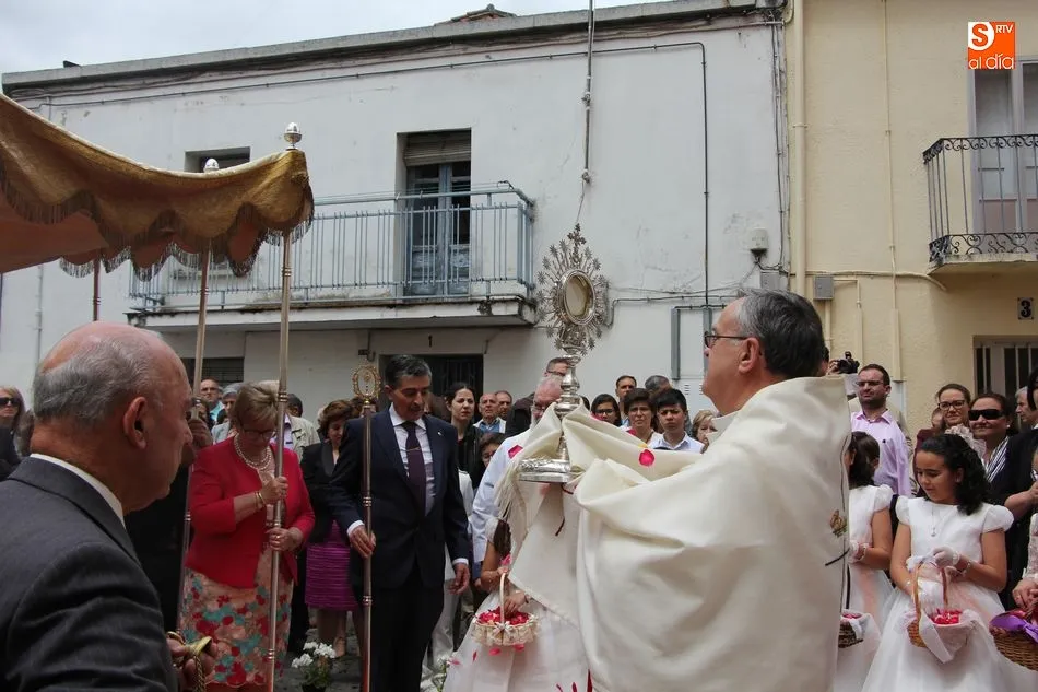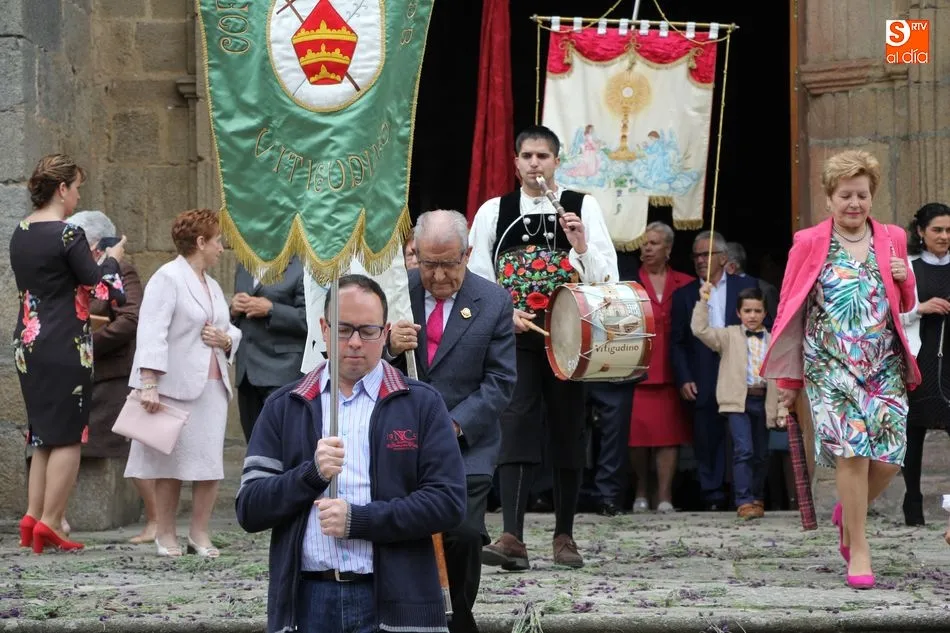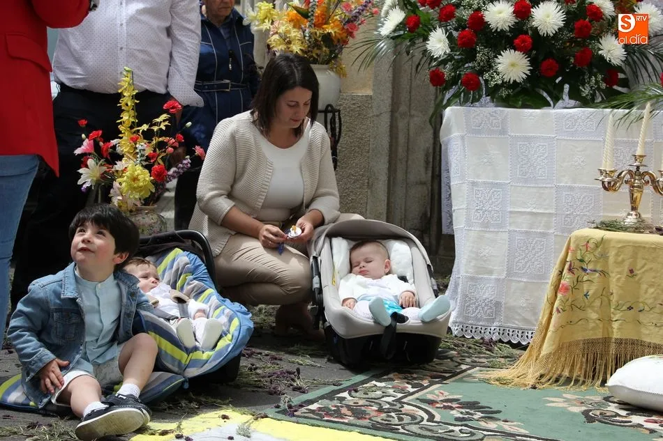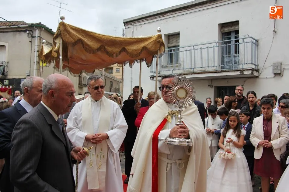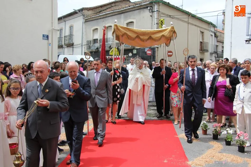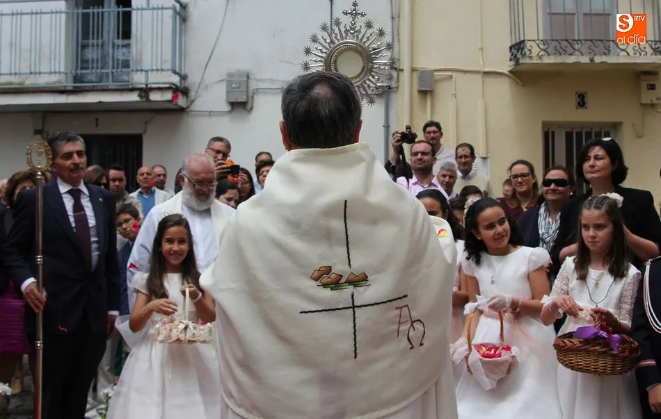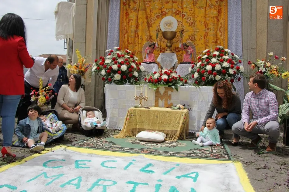 Después de la Eucaristía, en la que intervinieron varios sacerdotes, entre ellos los naturales de esta villa, Juan José Calles y Daniel Sevillano, además de Jesús Florencio González, Bernabé Marcos y los párrocos de Vitigudino Francisco Fraile y José Antonio Andújar, los cofrades salían del templo guiando el palio y la Custodia del Santísimo para dirigirse por la calle San Roque con dirección a Cuatro Calles, lugar donde les aguardaba el primero de los altares con cuatro niños, y después continuar la procesión por la calle del Centro Cultural para llegar al chaflán de la calle Pedro Velasco, lugar donde se encontraba instalado el altar realizado por la Cofradía Sacramental ?Villa de Vitigudino?, y en el que esperaban tres bebés para recibir la bendición sacerdotal.