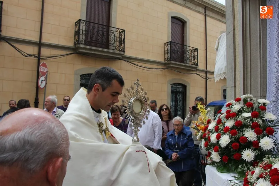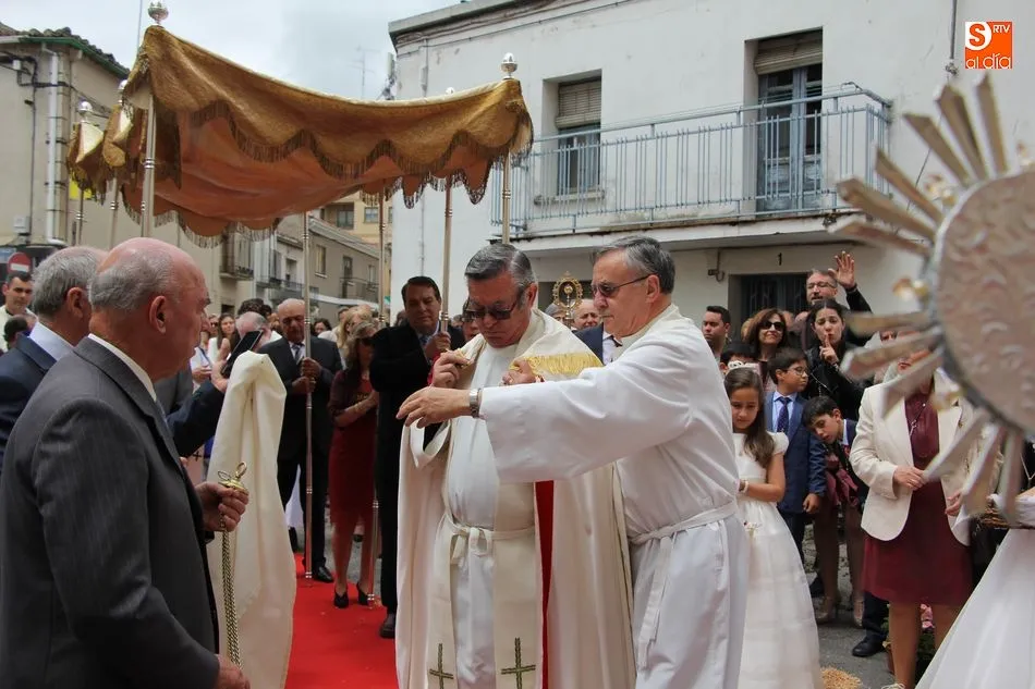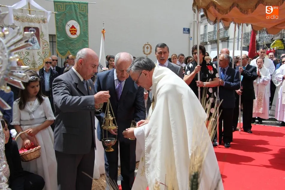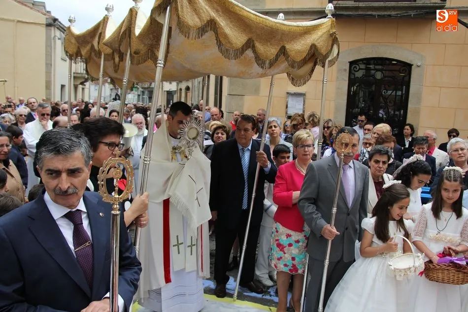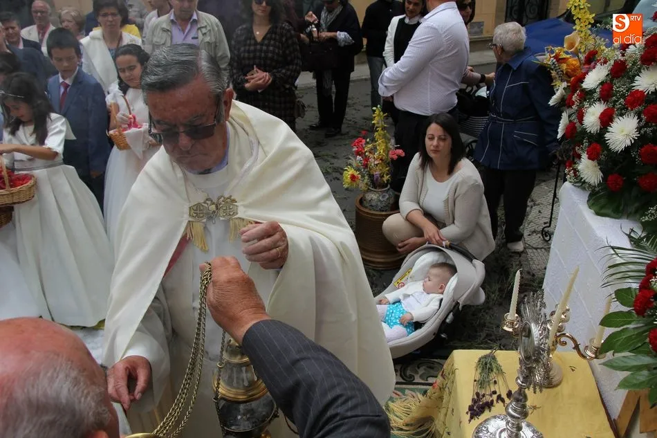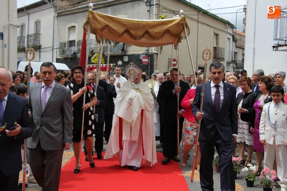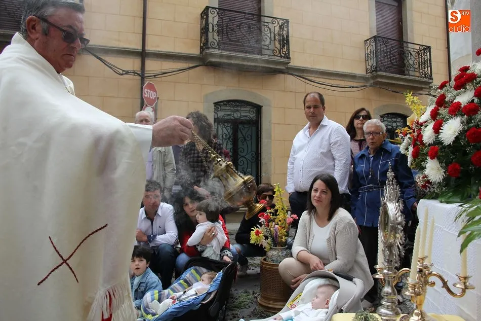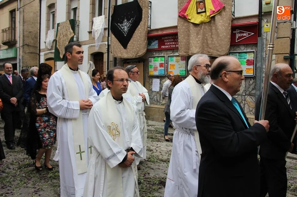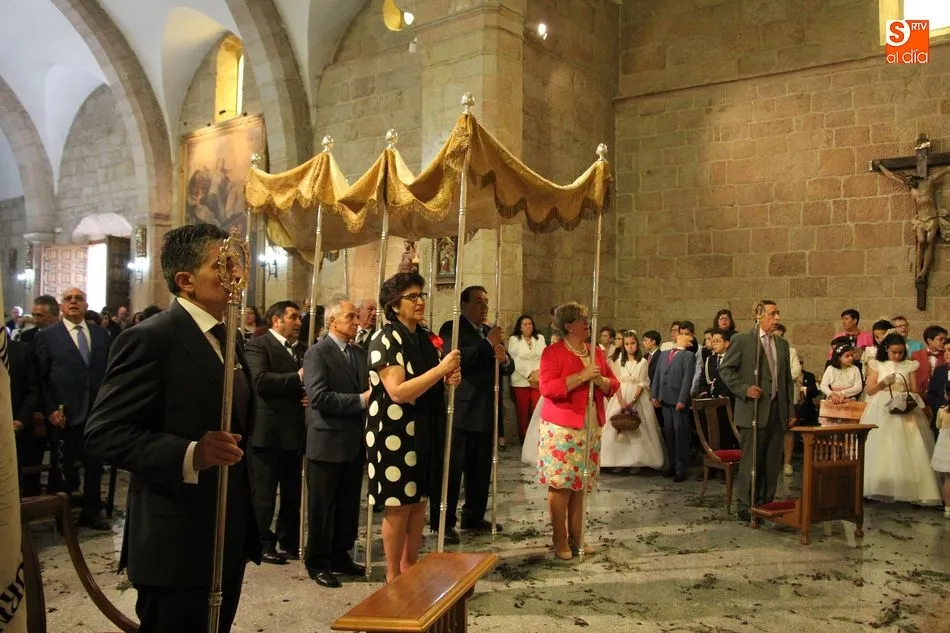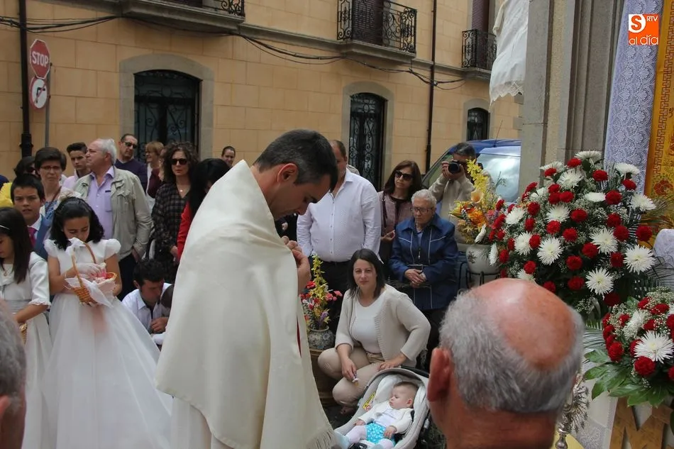 Después de la Eucaristía, en la que intervinieron varios sacerdotes, entre ellos los naturales de esta villa, Juan José Calles y Daniel Sevillano, además de Jesús Florencio González, Bernabé Marcos y los párrocos de Vitigudino Francisco Fraile y José Antonio Andújar, los cofrades salían del templo guiando el palio y la Custodia del Santísimo para dirigirse por la calle San Roque con dirección a Cuatro Calles, lugar donde les aguardaba el primero de los altares con cuatro niños, y después continuar la procesión por la calle del Centro Cultural para llegar al chaflán de la calle Pedro Velasco, lugar donde se encontraba instalado el altar realizado por la Cofradía Sacramental ?Villa de Vitigudino?, y en el que esperaban tres bebés para recibir la bendición sacerdotal.