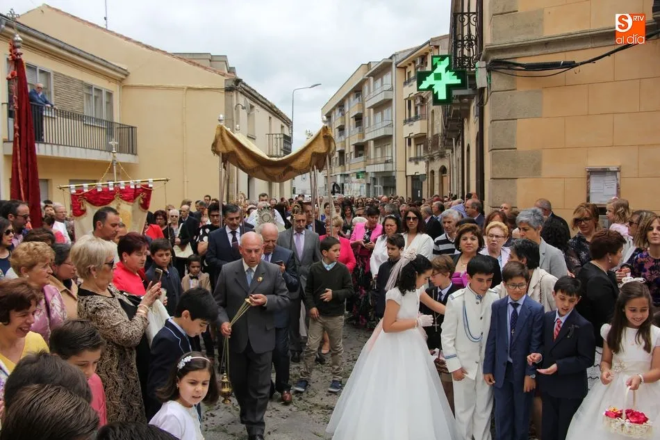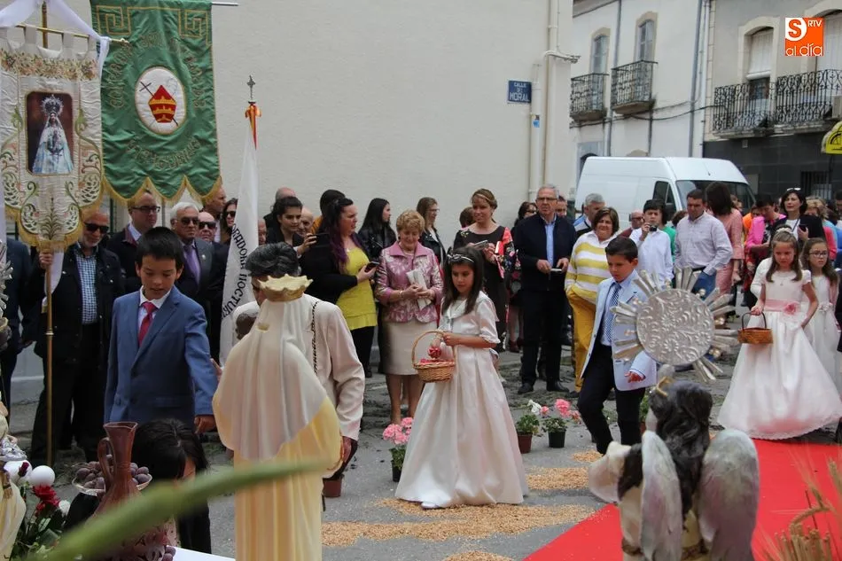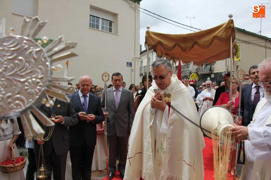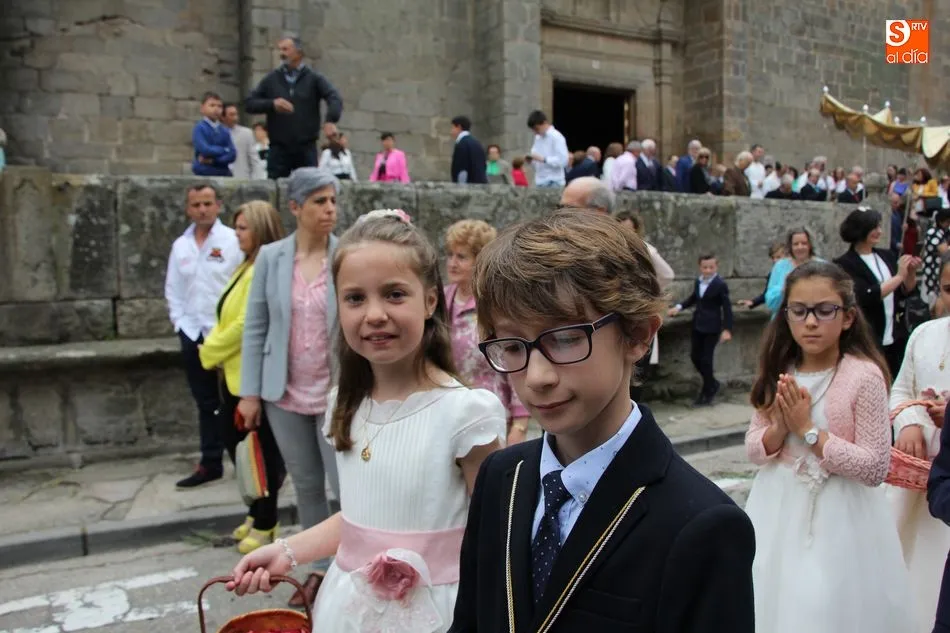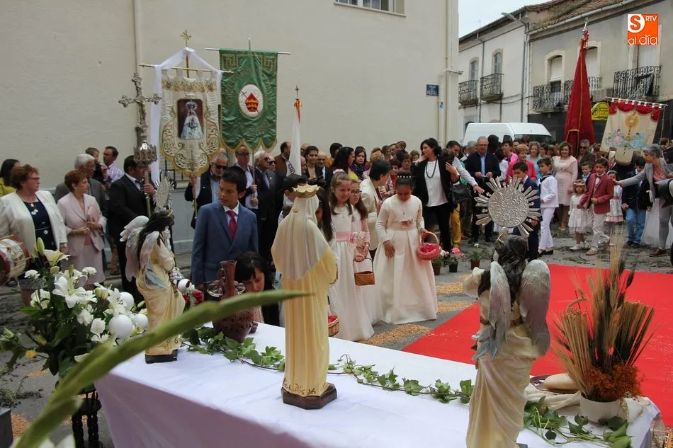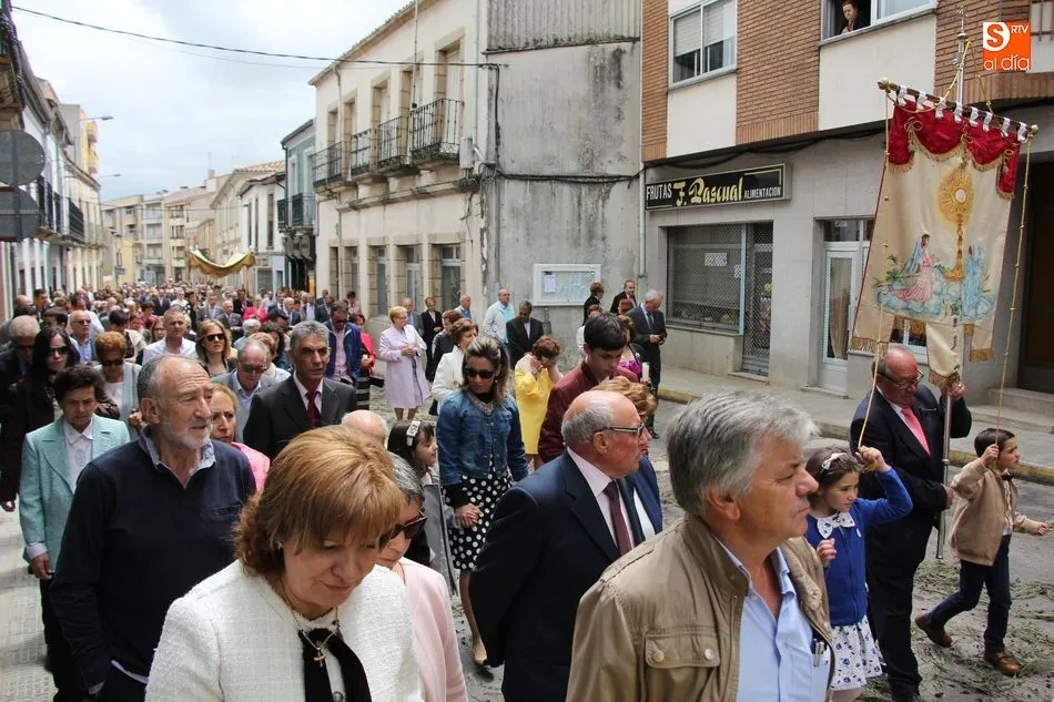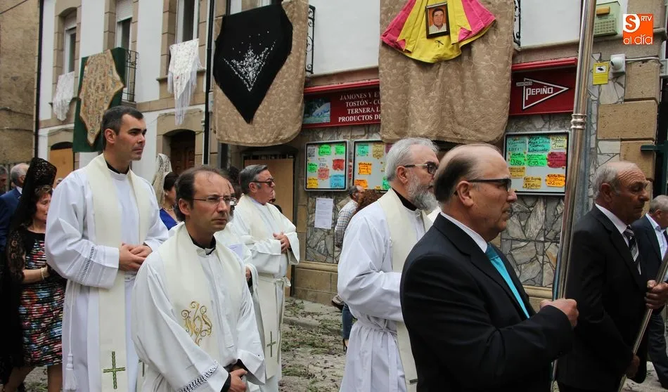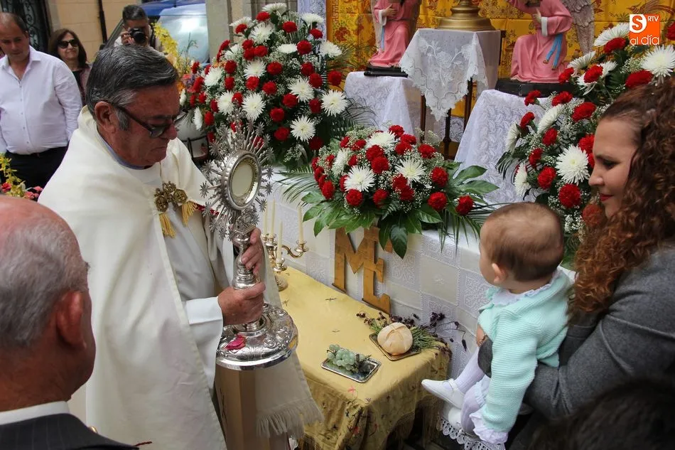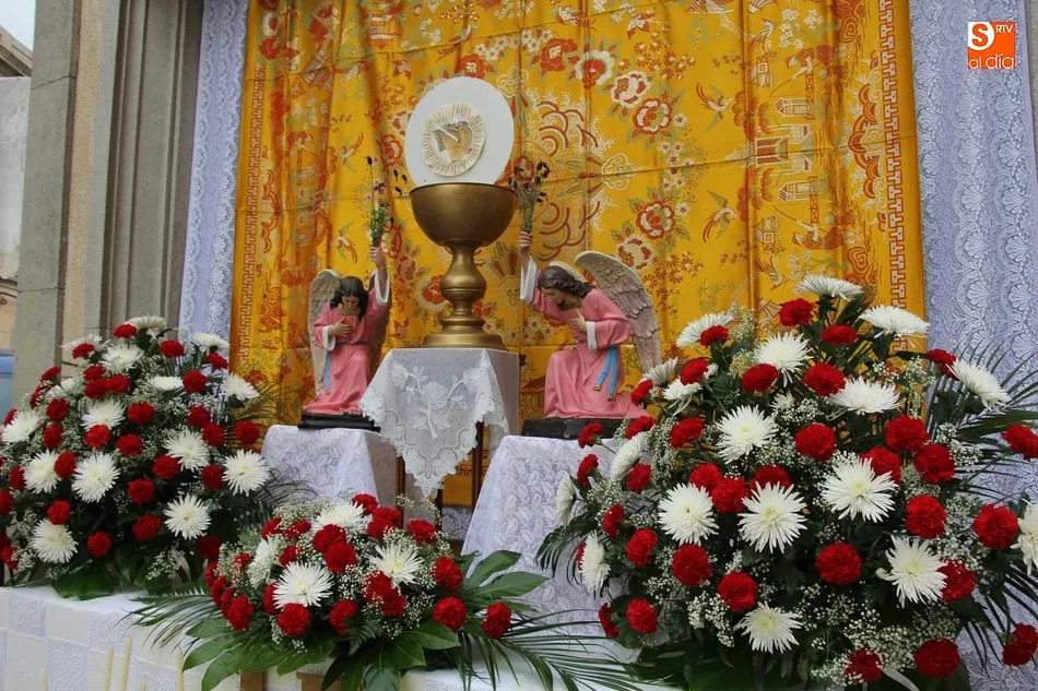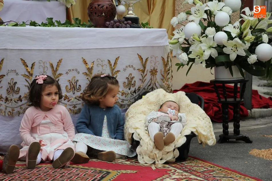 Después de la Eucaristía, en la que intervinieron varios sacerdotes, entre ellos los naturales de esta villa, Juan José Calles y Daniel Sevillano, además de Jesús Florencio González, Bernabé Marcos y los párrocos de Vitigudino Francisco Fraile y José Antonio Andújar, los cofrades salían del templo guiando el palio y la Custodia del Santísimo para dirigirse por la calle San Roque con dirección a Cuatro Calles, lugar donde les aguardaba el primero de los altares con cuatro niños, y después continuar la procesión por la calle del Centro Cultural para llegar al chaflán de la calle Pedro Velasco, lugar donde se encontraba instalado el altar realizado por la Cofradía Sacramental ?Villa de Vitigudino?, y en el que esperaban tres bebés para recibir la bendición sacerdotal.