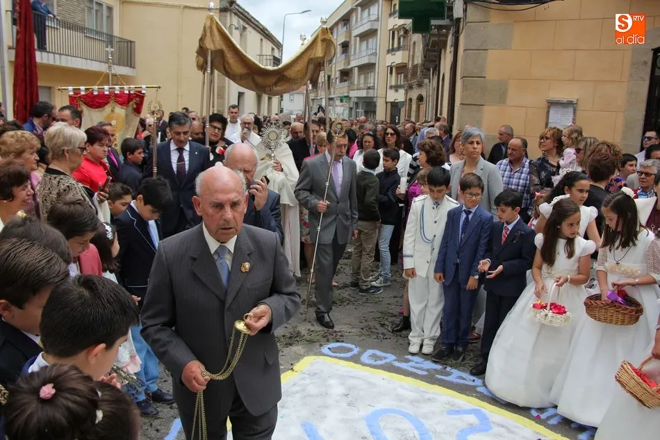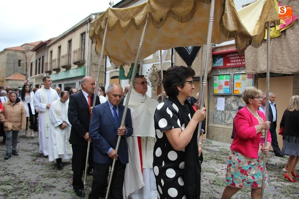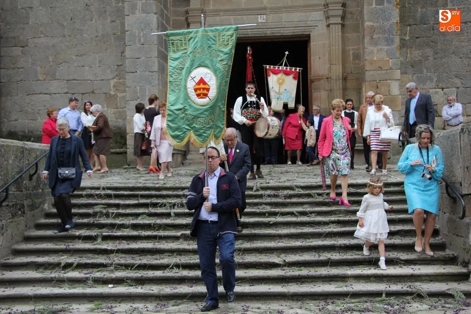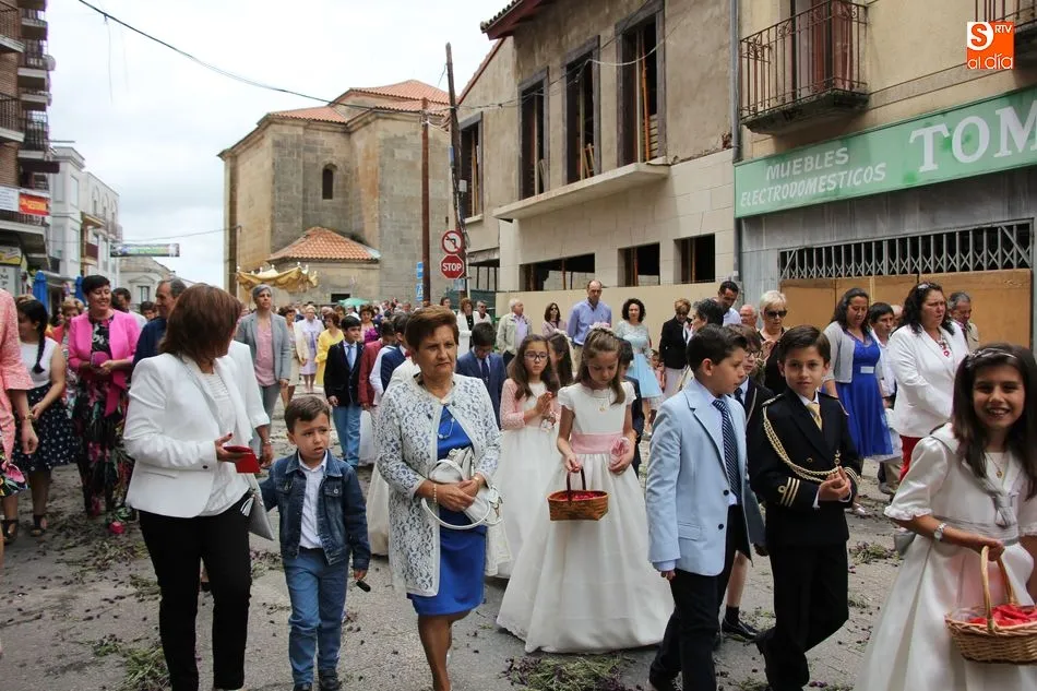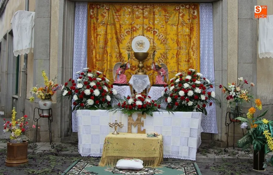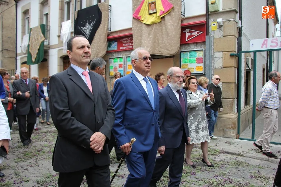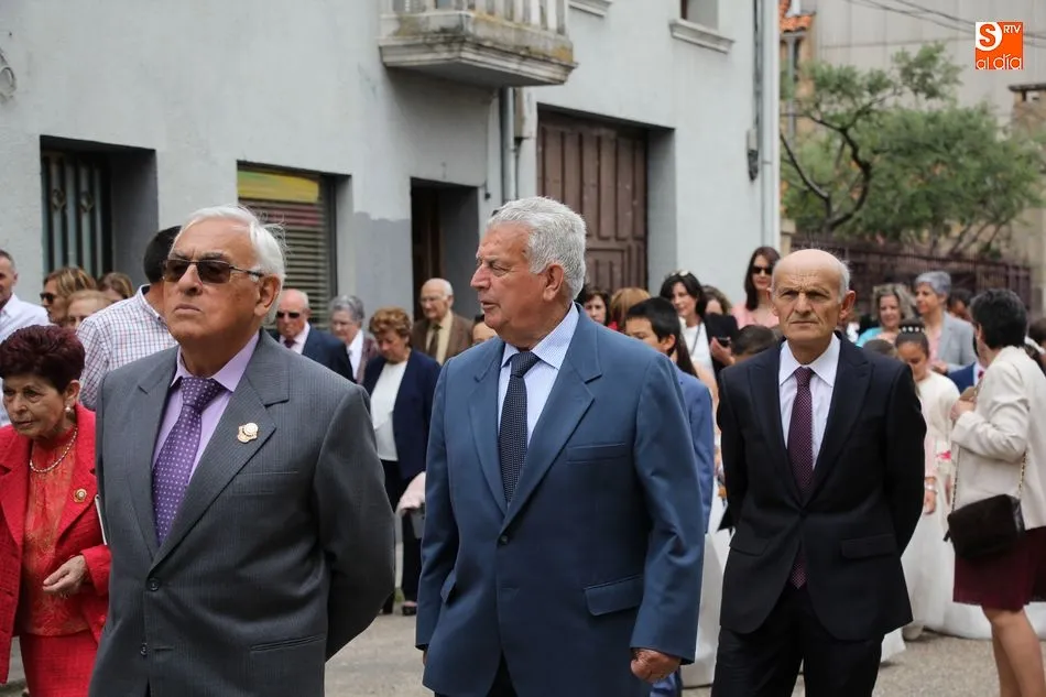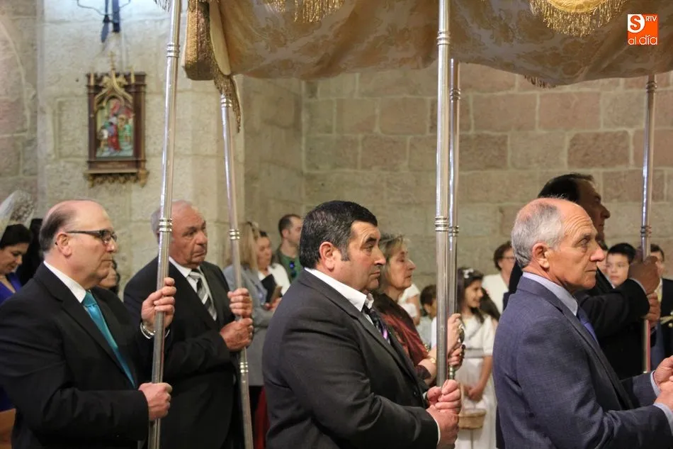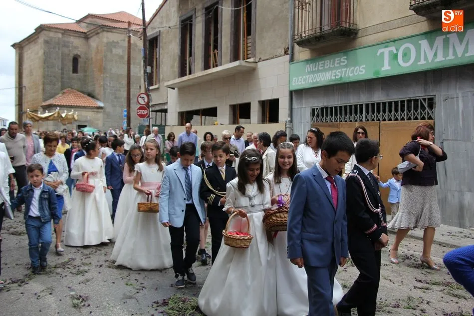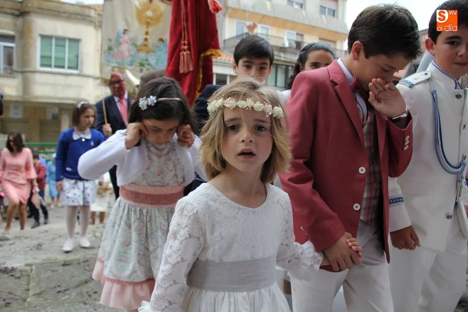 Fernando y Manuel Nieto, en su papel de mayordomos, presidian los actos religiosos en este día grande del Corpus. Tras la eucaristía daba comienzo la procesión por la calles, acto que estaba encabezado por la gaita y el tamboril de Jorge Sousa, tamborilero de la localidad; seguido por una veintena de niños y niñas que los domingos previos habían tomado la Primera Comunión.